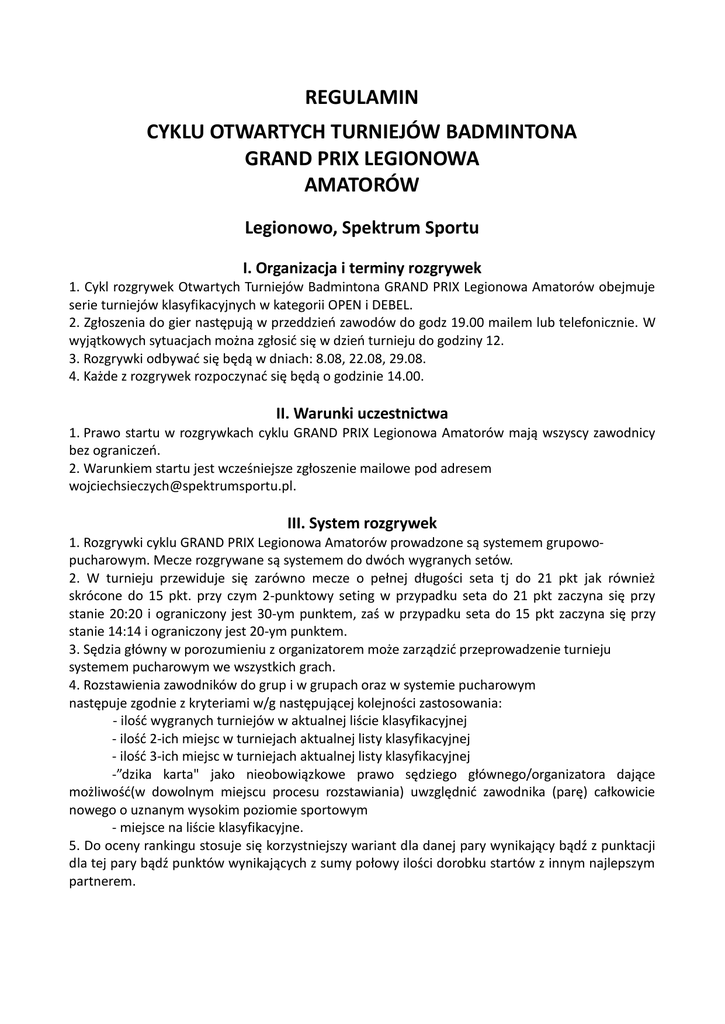 REGULAMIN CYKLU OTWARTYCH TURNIEJÓW BADMINTONA GRAND PRIX LEGIONOWA AMATORÓW Legionowo, Spektrum Sportu I. Organizacja i terminy rozgrywek 1. Cykl rozgrywek Otwartych Turniejów Badmintona GRAND PRIX Legionowa Amatorów obejmuje serie turniejów klasyfikacyjnych w kategorii OPEN i DEBEL. 2. Zgłoszenia do gier następują w przeddzień zawodów do godz 19.00 mailem lub telefonicznie. W wyjątkowych sytuacjach można zgłosić się w dzień turnieju do godziny 12. 3. Rozgrywki odbywać się będą w dniach: 8.08, 22.08, 29.08. 4. Każde z rozgrywek rozpoczynać się będą o godzinie 14.00. II. Warunki uczestnictwa 1. Prawo startu w rozgrywkach cyklu GRAND PRIX Legionowa Amatorów mają wszyscy zawodnicy bez ograniczeń. 2. Warunkiem startu jest wcześniejsze zgłoszenie mailowe pod adresem [email protected]. III. System rozgrywek 1. Rozgrywki cyklu GRAND PRIX Legionowa Amatorów prowadzone są systemem grupowopucharowym. Mecze rozgrywane są systemem do dwóch wygranych setów. 2. W turnieju przewiduje się zarówno mecze o pełnej długości seta tj do 21 pkt jak również skrócone do 15 pkt. przy czym 2-punktowy seting w przypadku seta do 21 pkt zaczyna się przy stanie 20:20 i ograniczony jest 30-ym punktem, zaś w przypadku seta do 15 pkt zaczyna się przy stanie 14:14 i ograniczony jest 20-ym punktem. 3. Sędzia główny w porozumieniu z organizatorem może zarządzić przeprowadzenie turnieju systemem pucharowym we wszystkich grach. 4. Rozstawienia zawodników do grup i w grupach oraz w systemie pucharowym następuje zgodnie z kryteriami w/g następującej kolejności zastosowania: - ilość wygranych turniejów w aktualnej liście klasyfikacyjnej - ilość 2-ich miejsc w turniejach aktualnej listy klasyfikacyjnej - ilość 3-ich miejsc w turniejach aktualnej listy klasyfikacyjnej -”dzika karta" jako nieobowiązkowe prawo sędziego głównego/organizatora dające możliwość(w dowolnym miejscu procesu rozstawiania) uwzględnić zawodnika (parę) całkowicie nowego o uznanym wysokim poziomie sportowym - miejsce na liście klasyfikacyjne. 5. Do oceny rankingu stosuje się korzystniejszy wariant dla danej pary wynikający bądź z punktacji dla tej pary bądź punktów wynikających z sumy połowy ilości dorobku startów z innym najlepszym partnerem. 6. Liczba punktów za wyniki uzyskane w turnieju, na podstawie, których sporządza się listę klasyfikacyjną cyklu GRAND PRIX Legionowa Amatorów ustalana jest następująco: miejsce 1 2 3 4 5 6 7 8 punkty 400 360 330 310 296 284 274 265 liczba punktów za dalsze miejsca jest niższa na przemian najpierw o 8 pkt, potem o 7 pkt, znów o 8 pkt, o 7 pkt itd. 7. We wszystkich turniejach cyklu GRAND PRIX Legionowa rozgrywane są mecze o 3-miejsca. 8. Jeżeli w danym dniu turnieju dochodzi do ponownego meczu tych samych zawodników-mecz taki nie jest rozgrywany a rezultat z pierwszego spotkania zaliczany jest do wszystkich innych meczy pomiędzy tymi graczami. Zasada ta obowiązuje z wyjątkiem, gdy meczem ponownym jest spotkanie finałowe. 9. Sędzia główny w porozumieniu z organizatorem na danym turnieju określa ilu zawodników z grup eliminacyjnych będzie grać dalej systemem pucharowym a wyniki tak wyznaczonego poziomu gier będą zaliczane do ostatecznej listy ustalającej pełną kolejność miejsc w turnieju. V. Nagrody i dyplomy 1. Za pierwsze 3 miejsca w poszczególnych kategoriach turniejów Single i Debel przewidziane są medale lub dyplomy. 2. Na każdym turnieju organizator rozlosuję 3 nagrody spośród wszystkich uczestników danego turnieju VI. Zasady ogólne 1. Wszelkie sprawy sporne zawodów rozstrzyga sędzia główny lub organizator. 2. Organizator zastrzega sobie prawo zmian i poprawek regulaminu w trakcie trwania sezonu pod warunkiem zapowiedzi ustnej organizatora na turnieju bieżącym oraz opublikowaniu ich na 7 dni przed datą kolejnego turnieju na stronie internetowej http://spektrumsportu.pl/?p=2754 3. Organizator ma prawo niedopuszczenia do turnieju osób, które naruszają etykę człowiekasportowca, działają w oderwaniu od zasad dobrego współżycia, wpływają destrukcyjnie na środowisko badmintonistów lub swą postawą czynią moralną lub finansową szkodę dla popularyzacji badmintona mając negatywny wpływ na pracę organizatora lub samopoczucie większości zawodników biorących udział w cyklu Grand Prix Legionowa. organizator GRAND PRIX Legionowa BADMINTONA w Spektrum Sportu Marek Jankowski