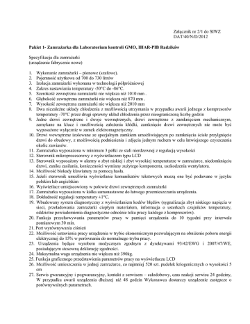 Załącznik nr 2/1 do SIWZ DAT/40/N/D/2012 Pakiet 1- Zamrażarka dla Laboratorium kontroli GMO, IHAR-PIB Radzików Specyfikacja dla zamrażarki (urządzenie fabrycznie nowe) Wykonanie zamrażarki – pionowe (szafowe). Pojemność użytkowa od 700 do 730 litrów Izolacja zamrażarki wykonana w technologii półpróżniowej Zakres nastawiania temperatury -50°C do -86°C. Szerokość zewnętrzna zamrażarki nie większa niż 1010 mm . Głębokość zewnętrzna zamrażarki nie większa niż 870 mm . Wysokość zewnętrzna zamrażarki nie większa niż 2010 mm Dwa niezależne układy chłodzenia z możliwością utrzymania w przypadku awarii jednego z kompresorów temperatury -70°C przez drugi sprawny układ chłodzenia przez nieograniczoną liczbę godzin 9. Jedne drzwi zewnętrzne i dwoje wewnętrznych, drzwi zewnętrzne z zamknięciem mechanicznym, zamykane na klucz i możliwością założenia kłódki, zamknięcie drzwi zewnętrznych nie może być wyposażone wyłącznie w zamek elektromagnetyczny. 10. Drzwi wewnętrzne izolowane ze specjalnym zamkiem umożliwiającym po zamknięciu ścisłe przylgnięcie drzwi do obudowy, z możliwością podniesienia i zdjęcia jednym ruchem w celu łatwiejszego czyszczenia okolic zawiasów. 11. Zamrażarka wyposażona w minimum 3 półki ze stali nierdzewnej z regulacją wysokości 12. Sterownik mikroprocesorowy z wyświetlaczem typu LCD 13. Sterownik wyposażony w alarmy o zbyt niskiej i zbyt wysokiej temperaturze w zamrażarce, niedomknięciu drzwi, zaniku zasilania, konieczności wymiany zużytego komponentu, uszkodzenia wentylatora. 14. Możliwość blokady klawiatury za pomocą hasła. 15. Jeżeli sterownik umożliwia wyświetlanie komunikatów tekstowych muszą one być podawane w języku polskim lub angielskim 16. Wyświetlacz umiejscowiony w połowie drzwi zewnętrznych zamrażarki 17. Zamrażarka wyposażona w kółka samonastawne do łatwego przemieszczania urządzenia. 18. Dokładność regulacji temperatury ±1°C. 19. Wbudowany system diagnostyczny z wyświetlaniem kodów błędów (sygnalizacja zbyt niskiego napięcia w sieci, przeładowania zamrażarki ciepłym materiałem, informacja o usterkach czujników temperatury, oddzielne powiadomienia diagnostyczne odnośnie toku pracy każdego z kompresorów). 20. Funkcja przechowywania parametrów pracy w pamięci urządzenia do 10 tygodni przy interwale pomiarowym 30 min. 21. Port wyrównywania ciśnień 22. Możliwość ustawienia pracy urządzenia w trybie ekonomicznym pozwalającym na obniżenie poboru energii elektrycznej do 15% w porównaniu do normalnego trybu pracy. 23. Urządzenia będące wyrobem medycznym zgodnym z dyrektywami 93/42/EWG i 2007/47/WE, posiadającym stosowną deklarację zgodności. 24. Maksymalna waga urządzenia nie większa niż 390kg. 25. Funkcja graficznego przedstawienia parametrów pracy na wyświetlaczu LCD 26. Możliwość umieszczenia w jednej zamrażarce, co najmniej 520 szt. pudełek kriogenicznych o wysokości 5 cm 27. Serwis gwarancyjny i pogwarancyjny, kontakt z serwisem – całodobowy, czas reakcji serwisu 24 godziny, W przypadku awarii urządzenia dłuższej niż 48 godzin Wykonawca dostarczy urządzenie zastępcze o porównywalnych parametrach. 1. 2. 3. 4. 5. 6. 7. 8. 28. Do oferty dołączona autoryzacja producenta na sprzedaż i serwisowania urządzeń (zamrażarek) w Polsce. 29. Możliwość umieszczenia w urządzeniu, co najmniej 24 szt. stelaży aluminiowych na pudełka o wysokości 5 cm 30. Możliwość dokupienia systemu awaryjnego podtrzymywania temperatury CO2 „back - up” z funkcją zliczania zużytego gazu i informowania o niskim poziomie CO2 w butli . 31. Minimalna ilość przechowywanych pudełek w systemie stelaży w zamrażarce o wysokości 5 cm – 524 szt. i o wysokości 7 cm - 332 szt. 32. Urządzenie wyposażone w wywzorcowany rejestrator temperatury z powiadamianiem na telefon komórkowy o stanach awaryjnych. Pozostałe warunki: - Dostawa- 4 tygodnie od daty zawarcia umowy, lecz nie później niż do dnia 20.12.2012 r. - Gwarancja- 24 m-ce, - Koszty dostawy, instalacji urządzenia oraz i przeszkolenia pracowników w zakresie obsługi.