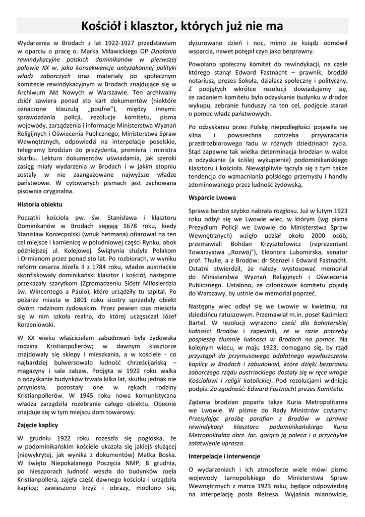 Kościół i klasztor, których już nie ma Wydarzenia w Brodach z lat 1922-1927 przedstawiam w oparciu o pracę o. Marka Miławickiego OP Działania rewindykacyjne polskich dominikanów w pierwszej połowie XX w. jako konsekwencje antyzakonnej polityki władz zaborczych oraz materiały po społecznym komitecie rewindykacyjnym w Brodach znajdujące się w Archiwum Akt Nowych w Warszawie. Ten archiwalny zbiór zawiera ponad sto kart dokumentów (niektóre oznaczone klauzulą „poufne”), między innymi: sprawozdania policji, rezolucje komitetu, pisma wojewody, zarządzenia i informacje Ministerstwa Wyznań Religijnych i Oświecenia Publicznego, Ministerstwa Spraw Wewnętrznych, odpowiedzi na interpelacje poselskie, telegramy brodzian do prezydenta, premiera i ministra skarbu. Lektura dokumentów uświadamia, jak szeroki zasięg miały wydarzenia w Brodach i w jakim stopniu zostały w nie zaangażowane najwyższe władze państwowe. W cytowanych pismach jest zachowana pisownia oryginalna. dyżurowano dzień i noc, mimo że ksiądz odmówił wsparcia, nawet potępił czyn jako bezprawny. Powołano społeczny komitet do rewindykacji, na czele którego stanął Edward Fastnacht – prawnik, brodzki notariusz, prezes Sokoła, działacz społeczny i polityczny. Z podjętych wkrótce rezolucji dowiadujemy się, że zadaniem komitetu było odzyskanie budynku w drodze wykupu, zebranie funduszy na ten cel, podjęcie starań o pomoc władz państwowych. Po odzyskaniu przez Polskę niepodległości pojawiła się silna i powszechna potrzeba przywracania przedrozbiorowego ładu w różnych dziedzinach życia. Stąd zapewne tak wielka determinacja brodzian w walce o odzyskanie (a ściślej wykupienie) podominikańskiego klasztoru i kościoła. Niewątpliwie łączyła się z tym także tendencja do wzmacniania polskiego przemysłu i handlu zdominowanego przez ludność żydowską. Wsparcie Lwowa Historia obiektu Początki kościoła pw. św. Stanisława i klasztoru Dominikanów w Brodach sięgają 1678 roku, kiedy Stanisław Koniecpolski (wnuk hetmana) ofiarował na ten cel miejsce i kamienicę w południowej części Rynku, obok późniejszej ul. Kolejowej. Świątynia służyła Polakom i Ormianom przez ponad sto lat. Po rozbiorach, w wyniku reform cesarza Józefa II z 1784 roku, władze austriackie skonfiskowały dominikański klasztor i kościół, następnie przekazały szarytkom (Zgromadzeniu Sióstr Miłosierdzia św. Wincentego a Paulo), które urządziły tu szpital. Po pożarze miasta w 1801 roku siostry sprzedały obiekt dwóm rodzinom żydowskim. Przez pewien czas mieściła się w nim szkoła realna, do której uczęszczał Józef Korzeniowski. W XX wieku właścicielem zabudowań była żydowska rodzina Kristianpollerów; w dawnym klasztorze znajdowały się sklepy i mieszkania, a w kościele - co najbardziej bulwersowało ludność chrześcijańską – magazyny i sala zabaw. Podjęta w 1922 roku walka o odzyskanie budynków trwała kilka lat, skutku jednak nie przyniosła, pozostały one w rękach rodziny Kristianpollerów. W 1945 roku nowa komunistyczna władza zarządziła rozebranie całego obiektu. Obecnie znajduje się w tym miejscu dom towarowy. Zajęcie kaplicy W grudniu 1922 roku rozeszła się pogłoska, że w podominikańskim kościele ukazała się jakiejś służącej (niewykrytej, jak wynika z dokumentów) Matka Boska. W święto Niepokalanego Poczęcia NMP, 8 grudnia, po nieszporach ludność weszła do budynków Joela Kristianpollera, zajęła część dawnego kościoła i urządziła kaplicę; zawieszono krzyż i obrazy, modlono się, Sprawa bardzo szybko nabrała rozgłosu. Już w lutym 1923 roku odbył się we Lwowie wiec, w którym (wg pisma Prezydium Policji we Lwowie do Ministerstwa Spraw Wewnętrznych) wzięło udział około 2000 osób, przemawiali Bohdan Krzysztofowicz (reprezentant Towarzystwa „Rozwój”), Eleonora Lubomirska, senator prof. Thulie, a z Brodów: dr Stenzel i Edward Fastnacht. Ostatni stwierdził, że należy wystosować memoriał do Ministerstwa Wyznań Religijnych i Oświecenia Publicznego. Ustalono, że członkowie komitetu pojadą do Warszawy, by ustnie ów memoriał poprzeć. Następny wiec odbył się we Lwowie w kwietniu, na dziedzińcu ratuszowym. Przemawiał m.in. poseł Kazimierz Bartel. W rezolucji wyrażono cześć dla bohaterskiej ludności Brodów i zapewnili, że w razie potrzeby pospieszą tłumnie ludności w Brodach na pomoc. Na kolejnym wiecu, w maju 1923, domagano się, by rząd przystąpił do przymusowego odpłatnego wywłaszczenia kaplicy w Brodach i zabudowań, które dzięki bezprawiu zaborczego rządu austriackiego dostały się w ręce wrogie Kościołowi i religii katolickiej. Pod rezolucjami widnieje podpis: Za zgodność: Edward Fastnacht prezes Komitetu. Żądania brodzian poparła także Kuria Metropolitarna we Lwowie. W piśmie do Rady Ministrów czytamy: Przesyłając prośbę parafian z Brodów w sprawie rewindykacji klasztoru podominikańskiego Kuria Metropolitalna obrz. łac. gorąco ją poleca i o przychylne załatwienie uprasza. Interpelacje i interwencje O wydarzeniach i ich atmosferze wiele mówi pismo wojewody tarnopolskiego do Ministerstwa Spraw Wewnętrznych z marca 1923 roku, będące odpowiedzią na interpelację posła Reizesa. Wyjaśnia mianowicie, że zarzut jakoby 8 grudnia 1922 roku tłum rozbił bramę i wtargnął do kaplicy nie ma podstaw, ponieważ bramy były tylko przymknięte na klamkę a nie na klucz, wobec czego nie było potrzeby ich rozbijania. Dalej, że usunięcie tłumu z kaplicy było nie do pomyślenia, że bezpodstawny jest zarzut, jakoby policja nic nie robiła, bo w nocy krążą w mieście patrole policji państwowej i miejskiej; że z zajęciem kaplicy zbiegł się wypadek zabicia przez żydów w Brodach Hrycia Diakowa z Hołoskowiec, który to wypadek sytuację jeszcze bardziej zaognił. Mowa jest również o tym, że starosta stara się wpływać na inteligentnych czło