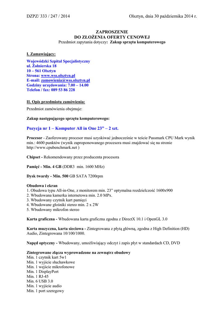 DZPZ/ 333 / 247 / 2014 Olsztyn, dnia 30 października 2014 r. ZAPROSZENIE DO ZŁOśENIA OFERTY CENOWEJ Przedmiot zapytania dotyczy: Zakup sprzętu komputerowego I. Zamawiający: Wojewódzki Szpital Specjalistyczny ul. śołnierska 18 10 – 561 Olsztyn Strona: www.wss.olsztyn.pl E-mail: [email protected] Godziny urzędowania: 7.00 – 14.00 Telefon / fax: 089 53 86 228 II. Opis przedmiotu zamówienia: Przedmiot zamówienia obejmuje: Zakup następującego sprzętu komputerowego: Pozycja nr 1 – Komputer All in One 23” – 2 szt. Procesor - Zaoferowany procesor musi uzyskiwać jednocześnie w teście Passmark CPU Mark wynik min.: 4600 punktów (wynik zaproponowanego procesora musi znajdować się na stronie http://www.cpubenchmark.net ) Chipset - Rekomendowany przez producenta procesora Pamięć - Min. 4 GB (DDR3 min. 1600 MHz) Dysk twardy - Min. 500 GB SATA 7200rpm Obudowa i ekran 1. Obudowa typu All-in-One, z monitorem min. 23” optymalna rozdzielczość 1600x900 2. Wbudowana kamerka internetowa min. 2.0 MPx. 3. Wbudowany czytnik kart pamięci 4. Wbudowane głośniki stereo min. 2 x 2W 5. Wbudowany mikrofon stereo Karta graficzna - Wbudowana karta graficzna zgodna z DirectX 10.1 i OpenGL 3.0 Karta muzyczna, karta sieciowa - Zintegrowana z płytą główną, zgodna z High Definition (HD) Audio, Zintegrowana 10/100/1000. Napęd optyczny - Wbudowany, umoŜliwiający odczyt i zapis płyt w standardach CD, DVD Zintegrowane złącza wyprowadzone na zewnątrz obudowy Min. 1 czytnik kart 5w1 Min. 1 wyjście słuchawkowe Min. 1 wejście mikrofonowe Min. 1 DisplayPort Min. 1 RJ-45 Min. 6 USB 3.0 Min. 1 wyjście audio Min. 1 port szeregowy Klawiatura - Klawiatura typu Windows pełnowymiarowa, układ typu QWERTY US, przewodowa podłączana przez port USB Mysz - Przewodowa dwu przyciskowa mysz z rolką podłączana do portu USB Zasilacz - Zasilacz max.200W System operacyjny, Oprogramowanie dodatkowe - Microsoft Windows 8 Professional PL z moŜliwością downgadu do Windows 7 Pro PL, Wsparcie dla systemu Windows 8 Professional oraz Windows 7 Professional, opublikowane sterowniki oraz oprogramowanie na stronach producenta. Gwarancja - Min. 3 letnia gwarancja z reakcją na następny dzień roboczy w miejscu uŜytkowania sprzętu. Zamawiający zastrzega sobie prawo zachowania uszkodzonego dysku twardego. Pozycja nr 2 – Komputer All in One 19,5 ” - 8 szt. Procesor - Zaoferowany procesor musi uzyskiwać jednocześnie w teście Passmark CPU Mark wynik min.: 4200 punktów (wynik zaproponowanego procesora musi znajdować się na stronie http://www.cpubenchmark.net ) Chipset - Rekomendowany przez producenta procesora Pamięć - Min. 4 GB (DDR3 min. 1600 MHz) Dysk twardy – Min. 500 GB SATA 7200rpm Obudowa i ekran 1. Obudowa typu All-in-One, z monitorem min. 19,5” optymalna rozdzielczość 1600x900 2. Wbudowana kamerka internetowa min. 1.0 MPx. 3. Wbudowany czytnik kart pamięci 4. Wbudowane głośniki stereo min. 2 x 2W 5. Wbudowany mikrofon stereo Karta graficzna - Wbudowana karta graficzna zgodna z DirectX 10.1 i OpenGL 3.0 Karta muzyczna, karta sieciowa – Zintegrowana z płytą główną, zgodna z High Definition (HD) Audio, Zintegrowana 10/100/1000. Napęd optyczny - Wbudowany, umoŜliwiający odczyt i zapis płyt w standardach CD, DVD Zintegrowane złącza wyprowadzone na zewnątrz obudowy Min. 1 czytnik kart 5w1 Min. 1 wyjście słuchawkowe Min. 1 wejście mikrofonowe Min. 1 DisplayPort Min. 1 RJ-45 Min. 2 USB 3.0 Min. 4 USB 2.0 Min. 1 wyjście audio Min. 1 port szeregowy Klawiatura – Klawiatura typu Windows pełnowymiarowa, układ typu QWERTY US, przewodowa podłączana przez port USB Mysz - Przewodowa dwu przyciskowa mysz z rolką podłączana do portu USB Zasilacz - Zasilacz max.120W System operacyjny, Oprogramowanie dodatkowe - Microsoft Windows 8 Professional PL z moŜliwością downgadu do Windows 7 Pro PL. Wsparcie dla systemu Windows 8 Professional oraz Windows 7 Professional, opublikowane sterowniki oraz oprogramowanie na stronach producenta. Gwarancja - Min. 3 letnia gwarancja z reakcją na następny dzień roboczy w miejscu uŜytkowania sprzętu. Zamawiający zastrzega sobie prawo zachowania uszkodzonego dysku twardego. Pozycja nr 3 – Urządzenie wielofunkcyjne – 6 szt. Specyfikacja drukarki laserowej wielofunkcyjnej Szybkość druku A4 Do 33str./min mono Czas pierwszego wydruku 5 s lub mniej Szybkość procesora Min. 330MHz Skanowanie Rozdzielczość Min. 600dpi Szybkość Do 10 str./min kolor, do 37,5 str./min mono Wprowadzanie dokumentów Min. 50 - arkuszowy automatyczny podajnik dokumentów, skaner płaski Kontrast Min. 7 poziomów Format M-TIFF, JPEG, XPS, PDF, Secure PDF + (BMP, PCX, GIF, TGA, PNG, WMF, EMF z narzędzia Actkey Utility) KsiąŜka adresowa LDAP, 100 adresów e-mail, 20 grup adresów Skanowanie do FTP, HTTP, pamięć USB, Email, TWAIN, CIFS Kopiowanie Pierwsza kopia PoniŜej 11 sekund Szybkość Do 33 kopii / min Rozdzielczość Do 600 x 600 dpi Zmniejszenie/powiększenie Zoom 25-400% Maksymalna liczba kopii 99 Interfejs i oprogramowanie Interfejsy 10/100 TX Ethernet, USB 2.0 Języki drukowania PCL6 (XL3.0), PCL5e, PostScript 3 (emulacja), SIDM TCP/IPv4&v6, SMTP, POP3, HTTP, SNMPv1&v3, DHCP, DNS, LPR, Port9100, Sieć i protokoły BOOTP, ARP, FTP, CIFS, LDAP, SLP, Bonjour. NetWare, EtherTalk, NetBEUI, LLTD, Serwisy Web na urządzeniach. Kompatybilność z systemami operacyjnymi Windows XP (32-bity & 64-bity) / Server 2003 (32-bity & 64-bity) / Server 2008 (32-bity & 64-bity) / Server 2008 R2 (64-bity) / Vista (32-bity & 64-bity) / 7 (32bity & 64-bity); Mac OS X 10.4.0 - 10.7.2 Jakość druku Rozdzielczość 600x600dpi Podawanie papieru Podajnik 1: 250 arkuszy o gramaturze 80 g/m2; Podajnik wielofunkcyjny: 100 Pojemność papieru arkuszy o gramaturze 80 g/m2; Podajnik RADF: 50 arkuszy o gramaturze 80 g/m2 Maksymalna pojemność papieru 350 arkuszy o gramaturze 80 g/m2 Podajnik 1: A4, A5, B5, A6; Podajnik wielofunkcyjny: A4, A5, B5, A6, Koperty Format papier