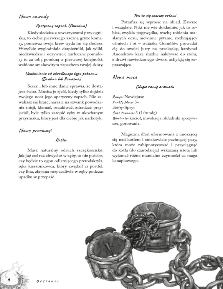 Ten to się zawsze ustawi Nowe zawady Apetyczny zapach (Poważna) Kiedy siedzisz z towarzyszami przy ognisku, to ciebie pierwszego zaczną gryźć komary, ponieważ twoja krew wyda im się słodsza. Wszelkie wygłodniałe drapieżniki, jak wilki, niedźwiedzie i oczywiście żarłoczne pomidory to za tobą pomkną w pierwszej kolejności, wabione smakowitym zapachem twojej skóry. Uzależnienie od określonego typu pokarmu (Drobna lub Poważna) Seeer... lub inne danie sprawia, że dostajesz świra. Musisz je zjeść, kiedy tylko dojdzie twojego nosa jego apetyczny zapach. Nie zawahasz się kraść, narazić na szwank powodzenia misji, kłamać, oszukiwać, zdradzać przyjaciół, byle tylko zatopić zęby w ukochanym przysmaku, który jest dla ciebie jak narkotyk. Nowe przewagi Ratler Masz naturalny odruch szczękościsku. Jak już coś raz chwycisz w zęby, to nie puścisz, czy będzie to ogon odlatującego pterodaktyla, ręka kieszonkowca, który zwędził ci portfel, czy lina, złapana rozpaczliwie w zęby podczas upadku w przepaść. 6 B e s za m e l Potrafisz się wprosić na obiad. Zawsze i wszędzie. Nikt nie wie dokładnie, jak to robisz, zwykła pogawędka, trochę robienia maślanych oczu, niewinne pytanie, rozbrajający uśmiech i ot – watażka Gomółów prowadzi cię do swojej jurty na przekąskę, kardynał Anorektów każe służbie nakrywać do stołu, a drzwi nawiedzonego dworu uchylają się zapraszająco. Nowe moce Długie ramię aromatu Ranga: Nowicjusz Punkty Mocy: 3+ Zasięg: Spryt Czas trwania: 3 (1/rundę) Warianty: kocioł, inwokacja, składniki spożywcze, gotowanie. Magiczna dłoń uformowana z unoszącej się nad kotłem i smakowicie pachnącej pary, która może zahipnotyzować i przyciągnąć do kotła (do czarodzieja) wskazaną istotę lub wykonać różne manualne czynności za maga kanapkowego.