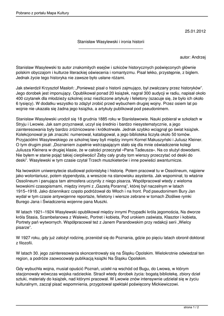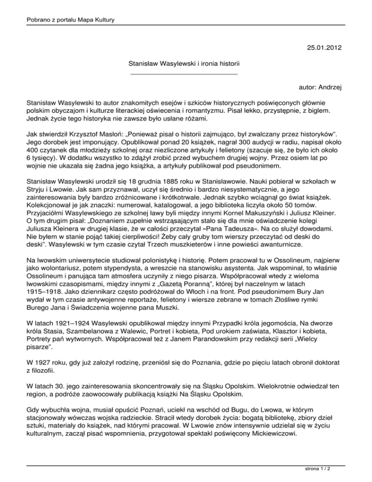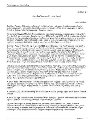 Pobrano z portalu Mapa Kultury 25.01.2012 Stanisław Wasylewski i ironia historii ____________________________ autor: Andrzej Stanisław Wasylewski to autor znakomitych esejów i szkiców historycznych poświęconych głównie polskim obyczajom i kulturze literackiej oświecenia i romantyzmu. Pisał lekko, przystępnie, z biglem. Jednak życie tego historyka nie zawsze było usłane różami. Jak stwierdził Krzysztof Masłoń: „Ponieważ pisał o historii zajmująco, był zwalczany przez historyków”. Jego dorobek jest imponujący. Opublikował ponad 20 książek, nagrał 300 audycji w radiu, napisał około 400 czytanek dla młodzieży szkolnej oraz niezliczone artykuły i felietony (szacuje się, że było ich około 6 tysięcy). W dodatku wszystko to zdążył zrobić przed wybuchem drugiej wojny. Przez osiem lat po wojnie nie ukazała się żadna jego książka, a artykuły publikował pod pseudonimem. Stanisław Wasylewski urodził się 18 grudnia 1885 roku w Stanisławowie. Nauki pobierał w szkołach w Stryju i Lwowie. Jak sam przyznawał, uczył się średnio i bardzo niesystematycznie, a jego zainteresowania były bardzo zróżnicowane i krótkotrwałe. Jednak szybko wciągnął go świat książek. Kolekcjonował je jak znaczki: numerował, katalogował, a jego biblioteka liczyła około 50 tomów. Przyjaciółmi Wasylewskiego ze szkolnej ławy byli między innymi Kornel Makuszyński i Juliusz Kleiner. O tym drugim pisał: „Doznaniem zupełnie wstrząsającym stało się dla mnie oświadczenie kolegi Juliusza Kleinera w drugiej klasie, że w całości przeczytał »Pana Tadeusza«. Na co służył dowodami. Nie byłem w stanie pojąć takiej cierpliwości! Żeby cały gruby tom wierszy przeczytać od deski do deski”. Wasylewski w tym czasie czytał Trzech muszkieterów i inne powieści awanturnicze. Na lwowskim uniwersytecie studiował polonistykę i historię. Potem pracował tu w Ossolineum, najpierw jako wolontariusz, potem stypendysta, a wreszcie na stanowisku asystenta. Jak wspominał, to właśnie Ossolineum i panująca tam atmosfera uczyniły z niego pisarza. Współpracował wtedy z wieloma lwowskimi czasopismami, między innymi z „Gazetą Poranną”, której był naczelnym w latach 1915–1918. Jako dziennikarz często podróżował do Włoch i na front. Pod pseudonimem Bury Jan wydał w tym czasie antywojenne reportaże, felietony i wiersze zebrane w tomach Złośliwe rymki Burego Jana i Świadczenia wojenne pana Muszki. W latach 1921–1924 Wasylewski opublikował między innymi Przypadki króla jegomościa, Na dworze króla Stasia, Szambelanowa z Walewic, Portret i kobieta, Pod urokiem zaświata, Klasztor i kobieta, Portrety pań wytwornych. Współpracował też z Janem Parandowskim przy redakcji serii „Wielcy pisarze”. W 1927 roku, gdy już założył rodzinę, przeniósł się do Poznania, gdzie po pięciu latach obronił doktorat z filozofii. W latach 30. jego zainteresowania skoncentrowały się na Śląsku Opolskim. Wielokrotnie odwiedzał ten region, a podróże zaowocowały publikacją książki Na Śląsku Opolskim. Gdy wybuchła wojna, musiał opuścić Poznań, uciekł na wschód od Bugu, do Lwowa, w którym stacjonowały wówczas wojska radzieckie. Stracił wtedy dorobek życia: bogatą bibliotekę, zbiory dzieł sztuki, materiały do książek, nad którymi pracował. W Lwowie znów intensywnie udzielał się w życiu kulturalnym, zaczął pisać wspomnienia, przygotował spektakl poświęcony Mickiewiczowi. strona 1 / 2 Pobrano z portalu Mapa Kultury Gdy miasto zajęły wojska hitlerowskie, Wasylewski zaczął współpracę z niemiecką redakcją „Gazety Lwowskiej”, wykonywał też tajne zadania wywiadowcze. Dlatego został w 1945 roku oskarżony o kolaborację, uwięziony i potępiony przez Związek Zawodowy Literatów Polskich. Rok później uniewinnił go sąd, ponieważ uznano, że Wasylewski nie działał na szkodę Państwa Polskiego, a starał się przeciwstawić propagandzie niemieckiej. Gdy został zwolniony z więzienia, osiadł w Opolu. Pracował jako bibliotekarz, prowadził wieczory literackie, współpracował z teatrem. Jednak publikował wyłącznie pod pseudonimami: Little Boy, Sigma, St. W., (stw), Tel, Tenus, Tadeusz Szafraniec (tym ostatnim pseudonimem podpisywał felietony w „Słowie Polskim”). Pracował też nad różnymi książkami dotyczącymi Opolszczyzny i nie tylko. Wasylewski zmarł w 1953 roku i dopiero po jego śmierci zaczęły się ukazywać książki podpisane jego imieniem i nazwiskiem: wznowiono rzeczy wydane przed wojną, opublikowano też nowe dzieła: Życie polskie w XIX wieku, Strażnice na Pasiece, pamiętniki Czterdzieści lat powodzenia, Niezapisany stan służby. Wasylewski pisał barwnym, lekkim i przystępnym stylem. Miał także wyjątkowy dar do wyszukiwania intrygujących faktów i ciekawostek. Jego opus vitae było Życie polskie w XIX wieku. Pracował nad tą książką blisko trzydzieści lat, jednak jej publikacji nie doczekał. Gdy w końcu dzieło się ukazało, zostało skrytykowane przez wielu naukowców. A czyta się je niczym powieść obyczajową. Pełno w niej anegdot, porywa gawędziarskim stylem. Co więcej, to bardzo erudycyjna książka, mnóstwo w niej informacji dotyczących spraw ważnych i mniej istotnych czy całkiem drugorzędnych. Wasylewski pisze o emigracji, wieszczach narodowych, emancypacji kobiet, rozwoju prasy i… nikotynizmie. Lulki, cygara, papierosy – palono, ile wlezie, choć za palenie na warszawskiej ulicy można było trafić do więzienia. strona 2 / 2