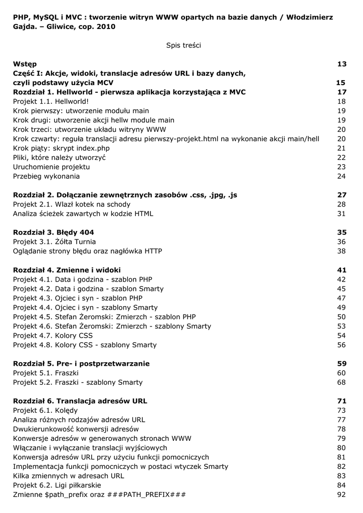 PHP, MySQL i MVC : tworzenie witryn WWW opartych na bazie danych / Włodzimierz Gajda. – Gliwice, cop. 2010 Spis treści Wstęp Część I: Akcje, widoki, translacje adresów URL i bazy danych, czyli podstawy uŜycia MCV Rozdział 1. Hellworld - pierwsza aplikacja korzystająca z MVC Projekt 1.1. Hellworld! Krok pierwszy: utworzenie modułu main Krok drugi: utworzenie akcji hellw module main Krok trzeci: utworzenie układu witryny WWW Krok czwarty: reguła translacji adresu pierwszy-projekt.html na wykonanie akcji main/hell Krok piąty: skrypt index.php Pliki, które naleŜy utworzyć Uruchomienie projektu Przebieg wykonania 13 15 17 18 19 19 20 20 21 22 23 24 Rozdział 2. Dołączanie zewnętrznych zasobów .css, .jpg, .js Projekt 2.1. Wlazł kotek na schody Analiza ścieŜek zawartych w kodzie HTML 27 28 31 Rozdział 3. Błędy 404 Projekt 3.1. śółta Turnia Oglądanie strony błędu oraz nagłówka HTTP 35 36 38 Rozdział 4. Zmienne i widoki Projekt 4.1. Data i godzina - szablon PHP Projekt 4.2. Data i godzina - szablon Smarty Projekt 4.3. Ojciec i syn - szablon PHP Projekt 4.4. Ojciec i syn - szablony Smarty Projekt 4.5. Stefan śeromski: Zmierzch - szablon PHP Projekt 4.6. Stefan śeromski: Zmierzch - szablony Smarty Projekt 4.7. Kolory CSS Projekt 4.8. Kolory CSS - szablony Smarty 41 42 45 47 49 50 53 54 56 Rozdział 5. Pre- i postprzetwarzanie Projekt 5.1. Fraszki Projekt 5.2. Fraszki - szablony Smarty 59 60 68 Rozdział 6. Translacja adresów URL Projekt 6.1. Kolędy Analiza róŜnych rodzajów adresów URL Dwukierunkowość konwersji adresów Konwersje adresów w generowanych stronach WWW Włączanie i wyłączanie translacji wyjściowych Konwersja adresów URL przy uŜyciu funkcji pomocniczych Implementacja funkcji pomocniczych w postaci wtyczek Smarty Kilka zmiennych w adresach URL Projekt 6.2. Ligi piłkarskie Zmienne $path_prefix oraz ###PATH_PREFIX### 71 73 77 78 79 80 81 82 83 84 92 Rozdział 7. Bazy danych Wizualne projektowanie bazy danych Oprogramowanie ORM Konwersja pliku .mwb do formatu Propel XML Konwersja pliku .mwb do formatu Doctrine YML db-frame-tool Propel - generowanie klas dostępu do bazy ORM Propel - pierwsze kroki Zestawienie wygenerowanych klas oraz najwaŜniejszych metod Podstawy uŜycia klas wygenerowanych przez Propel Doctrine - generowanie klas dostępu do bazy ORM Doctrine - pierwsze kroki Zestawienie wygenerowanych klas oraz najwaŜniejszych metod Podstawy uŜycia klas wygenerowanych przez Doctrine Projekt 7.1. Tatry szablony PHP, Propel Krok pierwszy: projekt bazy danych Krok drugi: generowanie klas dostępu do bazy danych Krok trzeci: tworzenie pustej bazy danych Krok czwarty: wypełnianie bazy danych na podstawie pliku tekstowego Krok piąty: zrzut wypełnionej bazy danych Krok szósty: aplikacja prezentująca zawartość bazy danych Projekt 7.2. Tatry szablony PHP, Doctrine Krok pierwszy: projekt bazy danych Krok drugi: generowanie klas dostępu do bazy danych Krok trzeci: tworzenie pustej bazy danych Krok czwarty: wypełnianie bazy danych na podstawie pliku tekstowego Krok piąty: zrzut wypełnionej bazy danych Krok szósty: aplikacja prezentująca zawartość bazy danych Projekt 7.3. Tatry szablony Smarty, Propel Projekt 7.4. Tatry szablony Smarty, Doctrine 95 95 99 100 101 101 102 104 104 105 106 107 107 108 109 110 110 110 110 113 114 116 116 116 117 117 118 118 119 120 Rozdział 8. Czego powinieneś nauczyć się z części pierwszej? 123 Część II: Operowanie klasami wygenerowanymi przez Propel oraz Doctrine Rozdział 9. Wybieranie wszystkich rekordów z tabeli w zadanym porządku Propel - sortowanie rekordów Doctrine - sortowanie rekordów Projekt 9.1. Słownik Propel, PHP Krok pierwszy: projekt bazy danych Krok drugi: generowanie klas dostępu do bazy danych Krok trzeci: tworzenie pustej bazy danych Krok czwarty: wypełnianie bazy danych na podstawie pliku tekstowego Krok piąty: zrzut wypełnionej bazy danych Krok szósty: aplikacja prezentująca zawartość bazy danych Projekt 9.2. Słownik Doctrine, PHP Krok pierwszy: projekt bazy danych Krok drugi: generowanie klas dostępu do bazy danych Krok trzeci: tworzenie pustej bazy danych Krok czwarty: wypełnianie bazy danych na podstawie pliku tekstowego Krok piąty: zrzut wypełnionej bazy danych Krok szósty: aplikacja prezentująca zawartość bazy danych 129 131 132 134 134 135 135 137 137 138 138 141 141 141 142 142 142 143 Rozdział 10. Wybieranie pojedynczego rekordu Propel Doctrine Projekt 10.1. Treny Propel, PHP Identyfikacja trenu wewnątrz akcji tren/show Projekt 10.2. Treny Doctrine, PHP 145 145 147 147 151 153 Rozdział 11. Relacje 1:n Metody generowane przez Propel dla relacji 1:n Doctrine i relacje 1:n Projekt 11.1. Kontynenty, państwa, miasta Propel, PHP Przygotowanie bazy danych Aplikacja Projekt 11.2. Kontynenty, państwa, miasta Doctrine, PHP Rozszerzanie właściwości klas generowanych przez Doctrine Wstawianie rekordów Aplikacja 157 158 160 162 163 167 173 174 176 178 Rozdział 12. Relacje n:m Metody generowane przez Propel dla relacji n:m Doctrine i relacje n:m Projekt 12.1. Filmy Propel, PHP Przygotowanie bazy danych Aplikacja Projekt 12.2. Filmy Doctrine, PHP Propel. Sortowanie rekordów stojących w relacji n:m Projekt 12.3. Filmy Propel, PHP, sortowanie Doctrine. Sortowanie rekordów stojących w relacji n:m Projekt 12.4. Filmy Doctrine, PHP, sortowanie 181 182 183 184 184 187 189 192 192 193 194 Rozdział 13. Zagadnienia dodatkowe dotyczące warstw M oraz V Czyszczenie zawartości bazy danych Konwersja obiektu w napis Konwersje toArray, fromArray Warunkowe wstawianie nieistniejących obiektów Wielokrotne wykorzystanie widoku Projekt 13.1. Aparaty fotPropel, PHP Warstwa M Wypełnianie bazy danych Aplikacja Projekt 13.2. Aparaty fotDoctrine, PHP Rozszerzanie funkcjonalności klas wygenerowanych przez Doctrine Wstawianie rekordów do bazy danych Aplikacja 197 197 198 198 200 201 202 202 205 206 208 209 211 212 Rozdział 14. Zapisywanie w bazie danych obraz