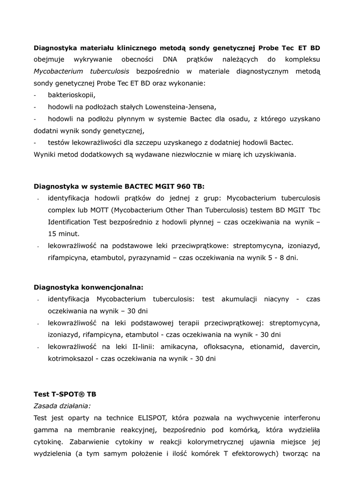 Diagnostyka materiału klinicznego metodą sondy genetycznej Probe Tec ET BD obejmuje wykrywanie Mycobacterium obecności tuberculosis DNA bezpośrednio prątków w należących materiale do kompleksu diagnostycznym metodą sondy genetycznej Probe Tec ET BD oraz wykonanie: - bakterioskopii, - hodowli na podłożach stałych Lowensteina-Jensena, - hodowli na podłożu płynnym w systemie Bactec dla osadu, z którego uzyskano dodatni wynik sondy genetycznej, testów lekowrażliwości dla szczepu uzyskanego z dodatniej hodowli Bactec. - Wyniki metod dodatkowych są wydawane niezwłocznie w miarę ich uzyskiwania. Diagnostyka w systemie BACTEC MGIT 960 TB: - identyfikacja hodowli prątków do jednej z grup: Mycobacterium tuberculosis complex lub MOTT (Mycobacterium Other Than Tuberculosis) testem BD MGIT Tbc Identification Test bezpośrednio z hodowli płynnej – czas oczekiwania na wynik – 15 minut. - lekowrażliwość na podstawowe leki przeciwprątkowe: streptomycyna, izoniazyd, rifampicyna, etambutol, pyrazynamid – czas oczekiwania na wynik 5 - 8 dni. Diagnostyka konwencjonalna: - identyfikacja Mycobacterium tuberculosis: test akumulacji niacyny - czas oczekiwania na wynik – 30 dni - lekowrażliwość na leki podstawowej terapii przeciwprątkowej: streptomycyna, izoniazyd, rifampicyna, etambutol - czas oczekiwania na wynik - 30 dni - lekowrażliwość na leki II-linii: amikacyna, ofloksacyna, etionamid, davercin, kotrimoksazol - czas oczekiwania na wynik - 30 dni Test T-SPOT® TB Zasada działania: Test jest oparty na technice ELISPOT, która pozwala na wychwycenie interferonu gamma na membranie reakcyjnej, bezpośrednio pod komórką, która wydzieliła cytokinę. Zabarwienie cytokiny w reakcji kolorymetrycznej ujawnia miejsce jej wydzielenia (a tym samym położenie i ilość komórek T efektorowych) tworząc na membranie tzw. ”odcisk stopy” po każdej komórce. Na wynik testu nie ma wpływu zawartość surowicy, a zastosowanie antygenów prątka z regionu RD1 eliminuje wpływ szczepień BCG. Wystandaryzowanie liczby komórek użytych do testu pozwala zachować wysoką czułość testu również u osób z obniżoną odpornością. Wykonanie testu rekomendowane jest: - u osób przed planowaną immunosupresją: terapia antagonistami TNFα chorych na RZS lub inne choroby autoimmunologiczne, chemioterapia, przeszczepianie narządów - u osób zakażonych wirusem HIV - u osób z kontaktu z chorym prątkującym – szczególnie dzieci - u osób podejrzewanych o pozapłucną postać gruźlicy (kręgosłup, kości, stawy, CUN) - u innych osób z grup dużego ryzyka rozwoju gruźlicy (więźniowie, pensjonariusze DPS i podopieczni Pomocy Społecznej, bezdomni, pracownicy Ochrony Zdrowia) Czas oczekiwania na wynik: Metody Rodzaj badania Bakterioskopia Konwencjonalna Bactec 24h 24h Hodowla pozytywna 2 - 8 tygodni 3 - 35 dni Hodowla ujemna 8 tygodni 6 tygodni Kontaminacja 1 tydzień 1 tydzień Lekooporność 30 dni 6 dni Sonda genetyczna T-SPOT® TB 24h 2-3 dni 1 dzień (badania od dostarczenia wykonywane w próbki do poniedziałek i laboratorium czwartek) Wyposażenie w aparaturę badawczą i inne urządzenia do badań: komory laminarne BSL z przepływem pionowym klasy II - jednostanowiskowa Safe/Flow i dwustanowiskowa AURA B3 digestorium „TOLLBRAND 1200” komplet aparatury do sondy genetycznej Probe Tec ET Becton Dickinson aparat Bactec 960 TB Becton Dickinson mikroskop fluorescencyjny BH2-OLYMPUS destylatory wody autoklawy: FREDEGARI z elektronicznym monitoringiem procesu steylizacji; SMS pokoje cieplarki wirówki: HERMLE 32-miejscowa, MPW 370 8-miejscowa ścinacz bakteriologiczny zamrażarka niskotemperaturowa (-75 stC) Platinum 500 wagi: analityczna, tensometryczna inkubator do testów biologicznych inkubator CO2