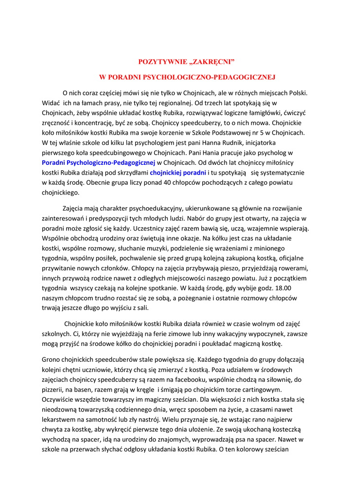 POZYTYWNIE „ZAKR CNI” W PORADNI PSYCHOLOGICZNO-PEDAGOGICZNEJ O nich coraz cz ciej mówi si nie tylko w Chojnicach, ale w ró nych miejscach Polski. Wida ich na amach prasy, nie tylko tej regionalnej. Od trzech lat spotykaj si w Chojnicach, eby wspólnie uk ada kostk Rubika, rozwi zywa logiczne amig ówki, wiczy zr czno i koncentracj , by ze sob . Chojniccy speedcuberzy, to o nich mowa. Chojnickie ko o mi ników kostki Rubika ma swoje korzenie w Szkole Podstawowej nr 5 w Chojnicach. W tej w nie szkole od kilku lat psychologiem jest pani Hanna Rudnik, inicjatorka pierwszego ko a speedcubingowego w Chojnicach. Pani Hania pracuje jako psycholog w Poradni Psychologiczno-Pedagogicznej w Chojnicach. Od dwóch lat chojniccy mi nicy kostki Rubika dzia aj pod skrzyd ami chojnickiej poradni i tu spotykaj si systematycznie w ka rod . Obecnie grupa liczy ponad 40 ch opców pochodz cych z ca ego powiatu chojnickiego. Zaj cia maj charakter psychoedukacyjny, ukierunkowane s g ównie na rozwijanie zainteresowa i predyspozycji tych m odych ludzi. Nabór do grupy jest otwarty, na zaj cia w poradni mo e zg osi si ka dy. Uczestnicy zaj razem bawi si , ucz , wzajemnie wspieraj . Wspólnie obchodz urodziny oraz wi tuj inne okazje. Na kó ku jest czas na uk adanie kostki, wspólne rozmowy, s uchanie muzyki, podzielenie si wra eniami z minionego tygodnia, wspólny posi ek, pochwalenie si przed grup kolejn zakupion kostk , oficjalne przywitanie nowych cz onków. Ch opcy na zaj cia przybywaj pieszo, przyje aj rowerami, innych przywo rodzice nawet z odleg ych miejscowo ci naszego powiatu. Ju z pocz tkiem tygodnia wszyscy czekaj na kolejne spotkanie. W ka rod , gdy wybije godz. 18.00 naszym ch opcom trudno rozsta si ze sob , a po egnanie i ostatnie rozmowy ch opców trwaj jeszcze d ugo po wyj ciu z sali. Chojnickie ko o mi ników kostki Rubika dzia a równie w czasie wolnym od zaj szkolnych. Ci, którzy nie wyje aj na ferie zimowe lub inny wakacyjny wypoczynek, zawsze mog przyj na rodowe kó ko do chojnickiej poradni i pouk ada magiczn kostk . Grono chojnickich speedcuberów stale powi ksza si . Ka dego tygodnia do grupy do czaj kolejni ch tni uczniowie, którzy chc si zmierzy z kostk . Poza udzia em w rodowych zaj ciach chojniccy speedcuberzy s razem na facebooku, wspólnie chodz na si owni , do pizzerii, na basen, razem graj w kr gle i migaj po chojnickim torze cartingowym. Oczywi cie wsz dzie towarzyszy im magiczny sze cian. Dla wi kszo ci z nich kostka sta a si nieodzown towarzyszk codziennego dnia, wr cz sposobem na ycie, a czasami nawet lekarstwem na samotno lub z y nastrój. Wielu przyznaje si , e wstaj c rano najpierw chwyta za kostk , aby wykr ci pierwsze tego dnia u enie. Ze swoj ukochan kosteczk wychodz na spacer, id na urodziny do znajomych, wyprowadzaj psa na spacer. Nawet w szkole na przerwach s ycha odg osy uk adania kostki Rubika. O ten kolorowy sze cian ch opcy bardzo dbaj : systematycznie go czyszcz , myj , smaruj , poprawiaj jego konstrukcj , aby w efekcie mo na go by o u w jak najkrótszym czasie. Wielu uczestnikom zaj kostka Rubika pozwoli a pokona swoje s abo ci, uwierzy w siebie i otworzy si na innych ludzi. Teraz ju nie trzeba nikogo przekonywa , e uk adanie kostki czyni cuda, rozwija wyobra ni , wiczy pami , wspomaga koncentracj , uczy pokory i samodyscypliny, zmusza do poszukiwania nowych rozwi za . Uk adanie kostki kszta tuje charakter, wyzwala energi i ambicje, uczy podporz dkowania si cis ym zasadom. Chojniccy speedcuberzy wiedz , co oznacza lojalno wobec siebie, wzajemne zrozumienie i prawdziwa m ska przyja . Najm odszy uczestnik chojnickiego ko a mi ników kostki Rubika ma 6 lat, za najstarsi za chwil przyst pi do egzaminu dojrza ci. Chojniccy speedcuberzy to inteligentni i kulturalni m odzi ludzie, którym pasja uk adania nie przeszkadza w osi ganiu bardzo dobrych wyników w nauce. Zdecydowana wi kszo z nich to uczniowie otrzymuj cy w szkole wiadectwa z wyró nieniem. Interesuj si muzyk , teatrem, naukami cis ymi, nowoczesnymi technologiami, znaj obce j zyki, tworz projekty, rozwi zuj skomplikowane zadania i amig ówki. Do chojnickiego ko a mi ników kostki Rubika nale uczniowie, którzy min. brali udzia w projekcie „Zdolni z Pomorza” realizowanego przez Departament Edukacji i Sportu Urz du Marsza kowskiego Województwa Pomorskiego. Chojnickie ko o speedcuberów to grupa doskonale zorganizowana, zdyscyplinowana i zintegrowana, a zarazem otwarta na nowe pomys y i zawsze ch tna do przyj cia nowych cz onków. Niektórzy uczestnicy zaj ju po trzech miesi cach uk adania kostki bior udzia w swoich pierwszych ogólnopolskich zawodach speedcubingowych. Zw aszcza tam prze amuj swoj nie mia , walcz ze stresem, a tym samym jeszcze bardziej otwieraj si na innych ludzi. Na zawodach speedcubingowych panuje zdrowa rywalizacja, ale g ównie jest to okazja do towarzyskich spotka , dobrej zabawy, nawi zywaniu nowych przyja ni. Tu w nie m odzi ludzie przyjemnie sp dzaj czas min. w gronie mistrzów speedcubingu. Z pewno ci nale y do nich rekordzista wiata w uk adaniu kostki Rubika z zamkni tymi oczami, a zarazem finalista programu „Mam talent" Marcin „Maskow” Kowalczyk. Przypomnijmy, e w lipcu 2013r. podczas I Ogólnopolskich Zawodów w Uk adaniu Kostki Rubika Chojnice Open go cili my najwi ksze s awy wiatowego speedcubingu. Marcin by naszym honorowym go ciem. Chojniccy speedcuberzy rywalizuj z najwi kszymi s awami we wszystkich oficjalnych konkurencjach. Aktualnie Chojnice mog pochwali si dwoma br zowymi medalami naszych ch opców: zdobytymi na ogólnopolskich oficjalnych zawodach speedcubingowych: Tomasz Piechowski, ucze III klasy Gimnazjum nr 1 w Chojnicach, z wielk precyzj uk ada kostk Rubika go ymi stopami, za Kamil Pieczka, ucze klasy I Gimnazjum nr 1 w Chojnicach, jest jednym z najlepszych zawodników w Polsce w uk adaniu skweba. Naszym ch opcom szczerze gratulujemy i w dalszym ci gu kibicujemy. Chojniccy mi nicy kostki Rubika w ramach poradnianych zaj rednio raz w miesi cu uczestnic