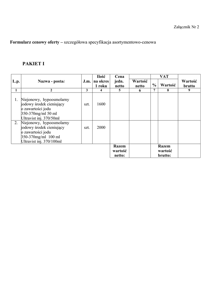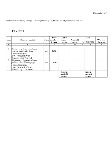 Załącznik Nr 2 Formularz cenowy oferty – szczegółowa specyfikacja asortymentowo-cenowa PAKIET I L.p. Nazwa - postać 1 2 1. Niejonowy, hypoosmolarny jodowy środek cieniujący o zawartości jodu 350-370mg/ml 50 ml Ultravist inj. 370/50ml 2. Niejonowy, hypoosmolarny jodowy środek cieniujący o zawartości jodu 350-370mg/ml 100 ml Ultravist inj. 370/100ml Ilość J.m. na okres 1 roku 3 4 szt. 1600 szt. 2000 Cena jedn. netto Wartość netto 5 6 Razem wartość netto: VAT % Wartość 7 8 Razem wartość brutto: Wartość brutto 9 PAKIET II L.p. Nazwa – postać 1 2 J.m. 3 Ilość 4 1. Aminokwasy z elektrolitami 10% 500 ml fl. 2. Aminokwasy, glukoza i elektrolity o zawartości azotu 4,6g i energii worki niebiałkowej 500 kcal 1000ml worki 3. Aminokwasy, glukoza i elektrolity o zawartości azotu 6,8g i energii worki 100 worki 10 szt. 10 szt. 80 szt. 120 szt. 10 niebiałkowej 450 kcal 1500 ml 4. Aminokwasy, glukoza i elektrolity o zawartości azotu 9,1g i energii niebiałkowej 600 kcal 2000 ml 5. Preparat lipidowy do żywienia pozajelitowego 10% - 500 ml 6. Preparat lipidowy do żywienia pozajelitowego 20% - 100 ml (80% oleju z oliwek, 20% oleju sojowego) 7. Preparat lipidowy do żywienia pozajelitowego 20% 100ml 8. Preparat lipidowy do żywienia pozajelitowego 20% 500ml (80% oleju z oliwek, 20% oleju sojowego) Cena jedn. netto 5 Wartość netto % 6 7 VAT Wartość 8 10 10 Razem wartość netto: Razem wartość brutto: Wartość brutto 9 PAKIET III L.p. Nazwa - postać J.m. Ilość 1 2 4 1. Alfadiol kaps. 1,0mcg x 100 2. Bisacodyl czop. 0,01g x 5 szt. 3. Buderhin aer. do nosa zaw. 50mcq/dawka 10ml/200 dawek 4. Butapirazol czopki 0,25g x 5 szt. 5. Butapirazol maść 5% a 30g 6. Clotrimazol krem 1% x 20g 7. Clotrimazolum tabl. dopochw.100mg x 6 8. Combivir tabl. 450mg x 60 9. Curosurf 120mg/1,5ml 11. Diclofenac czopki 100mg x 10 12. Epivir syr.50mg/50ml - 240ml 13. Fenoterol tabl. 0,005g x 100 14. Fraxodi inj. 0,6ml 11400j.m. x 10 amp. 15. Fraxodi inj. 0,8ml 15200j.m.x 10amp. 16. Hemofer prolong draż. x 30 17. Heparium krem a 20g 18. Kalipoz tabl. prolong. x 30 19. Nimbex inj.2mg/ml/2,5ml x 5 amp. 20. Retrovir IV for infusion 200mg 20ml x 5 amp. 21. Retovir Syrop 200ml 22. Seretide aer. 25/125mcg x 120 3 op. op. op. 5 1200 2 op. op. op. op. op. op. op. op. op. op. op. op. op. op. op. op. op. szt. 15 80 250 50 1 12 550 1 20 15 10 300 80 230 30 1 1 5 23. Seretide aer. 25/250mcg x 120 szt. 5 24. Seredite aer. 25/50mcg x 120 dawek op. 5 25. Seredite dysk 250 op. 5 26. 27. 28. 29. 30. 31. 32. op. op. op. op. op. op. op. 3 30 25 20 5 20 20 Seredite dysk 500 Theovent tabl. 300mg x 50 Theovent tabl. 100mg x 30 Ultiva inj. 1mg x 5 Ultiva inj. 2mg x 5 Zinacef inj. 0,75g x 10 Zinacef inj. 1,5g x 10 Cena jedn. netto 5 Razem wartość netto: Wartość netto 6 VAT % Wartość 7 8 Razem wartość brutto: Wartość brutto 9 PAKIET IV L.p. 1 Nazwa - postać 2 J.m. 3 tabl. 4 1% op. 700 powl. op. 300 1. Ciprofloxacin lactate 200mg/20ml x 10 fiol. 2. Ciprofloxacin 0,5g x 10 tabl. Ilość 3. Ciprofloxacin tabl. powl. 0,25g x 10 tabl.. op. Cena jedn. netto 5 VAT Wartość netto 6 % Wartość 7 8 Wartość brutto 9 40 Razem wartość netto: Razem wartość brutto: PAKIET V L.p. 1 Nazwa - postać 2 J.m. 3 Ilość 4 1. Gaza hemostatyczna rozm. 5 x 1,25 cm szt. 120 2. Gaza hemostatyczna rozm. 5 x 7,5 cm szt. 40 Cena jedn. netto 5 Razem wartość netto: VAT Wartość netto 6 % Wartość 7 8 Razem wartość brutto: Wartość brutto 9 PAKIET VI Nazwa - postać 2 L.p. 1 Ilość J.m. 3 1. Flumazenil inj. 1mg/10ml x 5 4 op. Cena jedn. netto 5 VAT Wartość netto % Wartość 6 7 8 Wartość brutto 9 8 Razem wartość netto: Razem wartość brutto: PAKIET VII L.p. Nazwa - postać J.m. Ilość 1 2 3 4 1. Benzyna 670g szt. 50 2. Eucerinum kg 7 3. Glucosum subst. kg 40 4. Hydrogenium peroxydatum kg 10 5. Jodyna kg 5 6. Oleum cacao wiórki kg 1,5 7. Paraffinum lig. kg 3000 8. Spirytus salicylowy kg 60 9. Vaselinum album. 10. 0,5% Spirytus skażony 70o hibitanem kg 2 l 200 l 20 11. Spirytus-Aethanol 70o Cena jedn. netto 5 Razem wartość netto: VAT Wartość netto % Wartość 6 7 8 Razem wartość brutto: Wartość brutto 9 PAKIET VIII L.p. Nazwa - postać J.m. Ilość Cena jedn. netto 1 2 3 4 5 1. Argenti nitras kg 0,3 2. Balsam peru kg 0,2 3. Ephedrinum h/chlor. kg 0,07 4. Hydrocortisonum kg 0,005 5. Jodum kg 0,030 6. Kalii iodidum kg 0,060 7. Natrium bicarbonicum kg 7 8. Natrium dihydrophosphoricum 9. Natrium hydrophosphoricum bibasic kg kg 0,200 0,500 10. Rivanolum kg 0,010 11. Saccharum lactis kg 0,400 12. Talcum kg 2 VAT Wartość netto % Wartość 6 7 Razem wartość netto: 8 Wartość brutto 9 Razem wartość brutto: PAKIET IX J.m. Ilość L.p. Nazwa - postać 1 2 1. Avastin (Bewacizumab) inj. 25mg/ml 4ml 3 4 fiol. 10 Cena jedn. netto 5 Razem wartość netto: Wartość VAT Wartość netto % 6 7 8 Razem wartość brutto: Wartość brutto 9 PAKIET X L.p. Nazwa - postać J.m. Ilość Cena jedn. netto Wartość netto VAT 1 2 3 4 5 6 1. Tachosil gąbka lecznicza 9,5cm x 4,8 cm x 1szt. op. 50 2. Bebilon HMF x 50 op. 50 3. Metizol 5mg x 50 tbl. op. 40 % Wartość 7 8 Razem wartość netto: Razem wartość brutto: VAT Wartość netto 6 Wartość brutto 9 PAKIET XI L.p. Nazwa - postać J.m. Ilość Cena jedn. netto 1 2 3 4 5 1. Flixotide aer.50mcg x 120 doz. op. 3 2. Flixotide inh.250mcg x 60 dawek op. 4 3. Flixotide aer.125mcg x 60 doz. op. 10 4. Serevent inh. 0,25/120 dawek op. 25 5. Seretide dysk 500 op. 3 6. Seretide dysk 250 op. 3 7. Lacipil tabl. powl. 2mg x 28 op. 20 8. Lacipil tabl.powl. 4mg x 28 op. 20 9. Lacipil tabl.powl. 6mg x 28 op. 5 Razem wartość netto: % Wartość 7 8 Razem wartość brutto: Wartość brutto 9 PAKIET XII L.p. 1 Nazwa - postać 2 Nadroparinum calcium Multi 1. 47500 j.m./5ml x 1 kpl. (1 kpl. = 10 fl. leku a 5ml + 10szt. mini-Spike + 100 szt. strzykawek z igłami J.m. 3 kpl. Ilość 4 Cena jedn. netto 5 VAT Wartość netto % Wartość 6 7 8 150 Razem wartość netto: Razem wartość brutto: Wart
