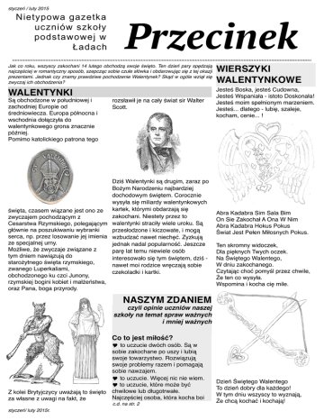 styczeń / luty 2015 Nietypowa gazetka uczniów szkoły podstawowej w Ładach Przecinek ,,,,,,,,,,,,,,,,,,,,,,,,,,,,,,,,,,,,,,,,,,,,,,,,,,,,,,,,,,,,,,,,,,,,,,,,,,,,,,,,,,,,,,,,,,,,,,,,,,,,,,,,,,,,,,,,,,,,,,,,,,,,,,,,,,,,,,,,,,,,,,,,,,,,,,,,,,,,,,,,,,,,,,,,,,,,,,,,,,,,,,,,,,,,,,,,,,,,,,,,,,,,,,,,,,,,,,,, Jak co roku, wszyscy zakochani 14 lutego obchodzą swoje święto. Ten dzień pary spędzają najczęściej w romantyczny sposób, szepcząc sobie czułe słówka i obdarowując się z tej okazji prezentami. Jednak czy znamy prawdziwe pochodzenie Walentynek? Skąd w ogóle wziął się zwyczaj ich obchodzenia? WIERSZYKI WALENTYNKOWE WALENTYNKI Jesteś Boska, jesteś Cudowna, Jesteś Wspaniała - istoto Doskonała! Jesteś moim spełnionym marzeniem. Jesteś... dlatego - lubię, szaleje, kocham, cenie... ! Są obchodzone w południowej i zachodniej Europie od średniowiecza. Europa północna i wschodnia dołączyła do walentynkowego grona znacznie później. Pomimo katolickiego patrona tego rozsławił je na cały świat sir Walter Scott. Dziś Walentynki są drugim, zaraz po Bożym Narodzeniu najbardziej dochodowym świętem. Corocznie wysyła się miliardy walentynkowych kartek, którymi obdarzają się święta, czasem wiązane jest ono ze zakochani. Niestety przez to zwyczajem pochodzącym z Cesarstwa Rzymskiego, polegającym walentynki straciły wiele uroku. Są głównie na poszukiwaniu wybranki przesłodzone i kiczowate, i mogą serca, np. przez losowanie jej imienia wzbudzać nawet niechęć. Zyzkują ze specjalnej urny. jednak nadal popularność. Jeszcze Możliwe, że zwyczaje związane z parę lat temu niewiele osób tym dniem nawiązują do interesowało się tym świętem, dziś starożytnego święta rzymskiego, nawet moi rodzice wręczają sobie zwanego Luperkaliami, czekoladki i kartki. obchodzonego ku czci Junony, rzymskiej bogini kobiet i małżeństwa, oraz Pana, boga przyrody. Abra Kadabra Sim Sala Bim On Sie Zakochał A Ona W Nim Abra Kadabra Hokus Pokus Świat Jest Pełen Miłosnych Pokus. Ten skromny widoczek, Dla pięknych Twych oczek. Na Świętego Walentego, W dniu zakochanego. Czytając choć pomyśl przez chwile, Że ten co wysyła. Wspomina i kocha cię mile. NASZYM ZDANIEM czyli opinie uczniów naszej szkoły na temat spraw ważnych i mniej ważnych Co to jest miłość? ! to uczucie dwóch osób. Są w sobie zakochane po uszy i lubią swoje towarzystwo. Rozwiązują swoje problemy razem i pomagają sobie nawzajem. ! to uczucie. Więcej nic nie wiem. ! to uczucie, które może być Z kolei Brytyjczycy uważają to święto chwilowe lub długotrwałe. Najczęściej osoba, która kocha boi za własne z uwagi na fakt, że c.d. na str. 2 styczeń/ luty 2015r. Dzień Świętego Walentego To dzień dobry dla każdego! W tym dniu wszyscy to wyznają, Że chcą kochać i kochają! Co to jest miłość od pierwszego wejrzenia? NASZYM ZDANIEM ciąg dalszy ze str. 1 się do tego przyznać drugiej osobie. ! to poczucie, że komuś na tobie zależy. ! to jak bardziej troszczysz się o innych niż o siebie. ! to znaczy, że ktoś ciebie kocha i martwi się o ciebie bardziej niż o siebie. ! to zjawisko spędzania czasu z drugą osobą np. chłopakiem lub dziewczyną, gdy czuje się do kogoś miłość świat jest szary, a ta osoba jest wyjątkowa. ! to kiedy jedno spada, drugie ciągnie je ku górze. Miłość to myślenie o kimś i nawet jak przestaje się go widzieć to się go mocno lubi. ! to głębokie uczucie pełne westchnień. Miłość to nigdy nie kończąca się, najmocniejsza siła, która nie ma końca ani początku. Przepełniona dobrem, czystą energią i prawdą. ! to wielka przyjaźń i cmok, cmok. Najwięcej miłośći jest w liceum. ! to jest chemia tworząca pomiędzy dwoma osobami. ! to zapłodnienie komórki jajowej z plemnikiem. ! to mega pozytywne uczucia do drugiej osoby zazwyczaj innej płci. Uczucia do kobiety najlepiej wyznawać drogimi prezentami. Znam się na tym. ! to uczucie, które trzeba pielęgnować. Zdarza się ono bardzo rzadko. styczeń/ luty 2015r. ! to zakochać się w kimś od razu i dawać mu kwiaty. ! to jak kobieta i facet od razu na siebie patrzą i się od razu kochają. ! Wydaje mi się, że jak człowiek na kogoś spojrzy, to wie, że to może być TA osoba. ! to miłość, która długo trwa albo trwa nawet do śmierci. ! to poczucie sympatii do pewnej osoby od razu gdy pierwszy raz się ją zobaczy. Osobiście tego nie doświadczyłem. ! To miłość, w której się zakochujesz na bardzo, bardzo długo. Labirynt walentynkowy Co to jest miłość dozgonna? ! to miłość, która nie trwa wiecznie. ! to miłość nierozerwalna, trwająca do śmierci. ! to miłość, która jest prawdziwa. ! to możliwość oddania życia za kogoś bez zastanowienia i miłość do końca życia. ! to miłość, która jest bardzo duża i tej miłości można powiedzieć wszystko. ! to miłość nieprawdziwa ze względu na sławę ! to obiecana przysięga przy ślubie ! to krążenie krwi Sudoku walentynkowe Uzupełnij diagram sudoku, pamiętając o tym, że w każdym rzędzie, każdej kolumnie i w każdym kwadracie cyfry od 1 do 9 mogą pojawić się tylko jeden raz. Na wesoło Jaś pisze list do Małgosi: Nie jem śniadania, bo myślę o tobie, Nie jem obiadu, bo myślę o tobie, Nie jem kolacji, bo myślę o tobie, Nie śpię w nocy, bo ... JESTEM GŁODNY!! Siedzi chłopak z dziewczyną na ławce w parku i zwierza się jej: - Wiesz co, chodzę z Tobą nie na żarty... A dziewczyna na to: - Ja też jestem głodna... Kobieta jest jak pocisk z karabinu, bo: -wpada w oko -rani serce -dziurawi portfel i bokiem wychodzi. - Co to jest miłość? - Miłość to jest światło życia. - A co to jest małżeństwo? - Rachunek za to światło. Redakcja przecinka: Dominika Wiernasz, Natalia Kamińska, Iza Kamińska, Weronika Binienda, Zuzia Kąkol Martyna Makowska, Divid Amarnani, Adrian Worach, Zosia Mazur, Filip Kowalczyk, Gabrysia Nowik, Kaudia Jar