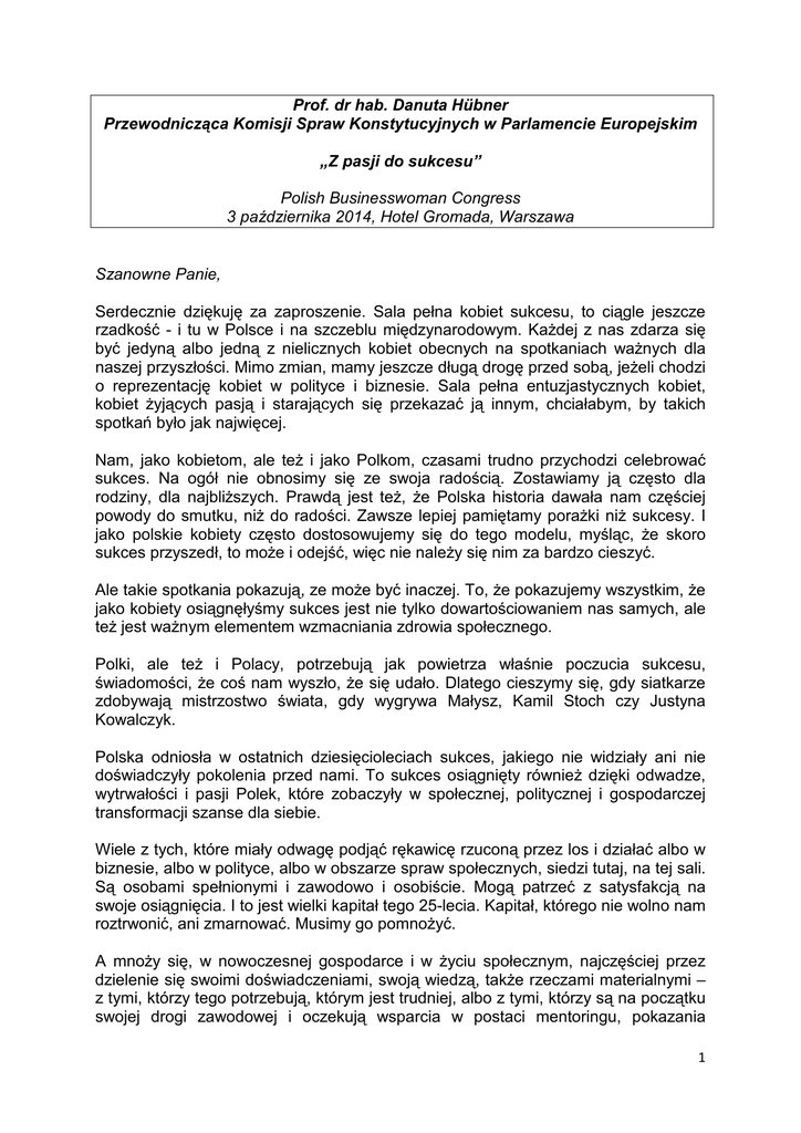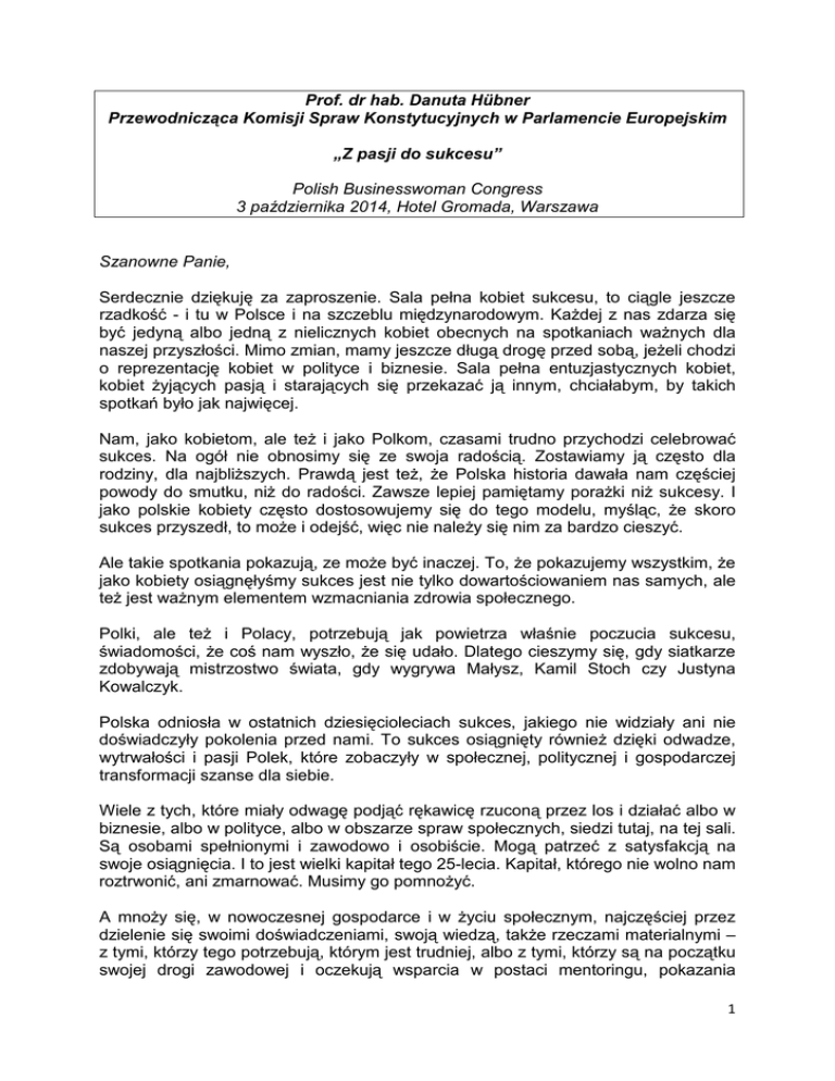 Prof. dr hab. Danuta Hübner Przewodnicząca Komisji Spraw Konstytucyjnych w Parlamencie Europejskim „Z pasji do sukcesu” Polish Businesswoman Congress 3 października 2014, Hotel Gromada, Warszawa Szanowne Panie, Serdecznie dziękuję za zaproszenie. Sala pełna kobiet sukcesu, to ciągle jeszcze rzadkość - i tu w Polsce i na szczeblu międzynarodowym. Każdej z nas zdarza się być jedyną albo jedną z nielicznych kobiet obecnych na spotkaniach ważnych dla naszej przyszłości. Mimo zmian, mamy jeszcze długą drogę przed sobą, jeżeli chodzi o reprezentację kobiet w polityce i biznesie. Sala pełna entuzjastycznych kobiet, kobiet żyjących pasją i starających się przekazać ją innym, chciałabym, by takich spotkań było jak najwięcej. Nam, jako kobietom, ale też i jako Polkom, czasami trudno przychodzi celebrować sukces. Na ogół nie obnosimy się ze swoja radością. Zostawiamy ją często dla rodziny, dla najbliższych. Prawdą jest też, że Polska historia dawała nam częściej powody do smutku, niż do radości. Zawsze lepiej pamiętamy porażki niż sukcesy. I jako polskie kobiety często dostosowujemy się do tego modelu, myśląc, że skoro sukces przyszedł, to może i odejść, więc nie należy się nim za bardzo cieszyć. Ale takie spotkania pokazują, ze może być inaczej. To, że pokazujemy wszystkim, że jako kobiety osiągnęłyśmy sukces jest nie tylko dowartościowaniem nas samych, ale też jest ważnym elementem wzmacniania zdrowia społecznego. Polki, ale też i Polacy, potrzebują jak powietrza właśnie poczucia sukcesu, świadomości, że coś nam wyszło, że się udało. Dlatego cieszymy się, gdy siatkarze zdobywają mistrzostwo świata, gdy wygrywa Małysz, Kamil Stoch czy Justyna Kowalczyk. Polska odniosła w ostatnich dziesięcioleciach sukces, jakiego nie widziały ani nie doświadczyły pokolenia przed nami. To sukces osiągnięty również dzięki odwadze, wytrwałości i pasji Polek, które zobaczyły w społecznej, politycznej i gospodarczej transformacji szanse dla siebie. Wiele z tych, które miały odwagę podjąć rękawicę rzuconą przez los i działać albo w biznesie, albo w polityce, albo w obszarze spraw społecznych, siedzi tutaj, na tej sali. Są osobami spełnionymi i zawodowo i osobiście. Mogą patrzeć z satysfakcją na swoje osiągnięcia. I to jest wielki kapitał tego 25-lecia. Kapitał, którego nie wolno nam roztrwonić, ani zmarnować. Musimy go pomnożyć. A mnoży się, w nowoczesnej gospodarce i w życiu społecznym, najczęściej przez dzielenie się swoimi doświadczeniami, swoją wiedzą, także rzeczami materialnymi – z tymi, którzy tego potrzebują, którym jest trudniej, albo z tymi, którzy są na początku swojej drogi zawodowej i oczekują wsparcia w postaci mentoringu, pokazania 1 najlepszych, najmniej krętych dróg do sukcesu. Co nie znaczy, że zawsze najłatwiejszych. Dzielić można się też z tymi, którzy, czy które, też ten sukces osiągnęły. I ten dzisiejszy Kongres jest właśnie takim miejscem. Irene Natividad, wielokrotna gościni Kongresu Kobiet i Forum Nowych Idei, zawsze podkreśla, że najbardziej produktywna wymiana doświadczeń biznesowych następuje wtedy, gdy wzajemnie się pytamy: „co takiego jest w Twojej firmie, co mogę przenieść do mojej”, co mogę zastosować, czy jest cos takiego, o czym nie pomyślałam. Jestem przekonana, że w środowisku kobiet zajmujących się biznesem takie rozmowy są bardzo naturalne. I dlatego też, jak pokazują badania, firmy, w których jest znaczna rola kobiet w zarządach, są zazwyczaj bardziej innowacyjne i otwarte na wszelkie nowe wyzwania, zarówno jeżeli chodzi o rynek, jak i zarządzanie zasobami ludzkimi. Do tej pory intuicyjnie przyjmowaliśmy, ze kobiety są bardziej empatyczne, łatwiej wchodzące w kontakty międzyludzkie – ale teraz to jest już udowodnione rozmaitymi badaniami. Nowe technologie i nowa gospodarka oparta na sieciowości, jest jakby naturalnie dostosowana do umiejętności społecznych kobiet i to one się swietnie w niej odnajdują .”Relacyjność” to istota nowoczesnej gospodarki – a to związane jest z wyczuciem potrzeb rynkowych czy społecznych, intuicją międzyosobową, szybkim „wyłapywaniem” tego, jak można wypełnić jakąś niszę. I ta ‘relacyjność”, sieciowość jest często, tak jak sukces, „szminką pisana”. Ponieważ głęboko wierzę w te zdolności polskich kobiet biznesu, działaczek społecznych, polityczek, dlatego wierzę też, że polska gospodarka, im bardziej będzie sieciowa, otwarta, relacyjna – a więc „kobieca”, tym bardziej będzie "skazana" na sukces. A Wy, Panie, będziecie sprawczyniami tego sukcesu. Dziękuję za uwagę. 2