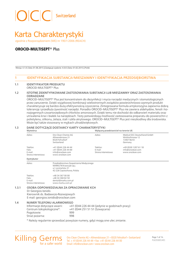 Karta Charakterystyki zgodnie z Rozporządzeniem (WE) nr 1907/2006 (REACH) OROCID-MULTISEPT® Plus Wersja: 4.1.0 | Data: 01.06.2015 || Zastępuje wydanie: 4.0.0 | Data: 01.02.2015 || Polski 1 IDENTYFIKACJA SUBSTANCJI/MIESZANINY I IDENTYFIKACJA PRZEDSIĘBIORSTWA 1.1 IDENTYFIKATOR PRODUKTU OROCID-MULTISEPT® Plus 1.2 ISTOTNE ZIDENTYFIKOWANE ZASTOSOWANIA SUBSTANCJI LUB MIESZANINY ORAZ ZASTOSOWANIA ODRADZANE OROCID–MULTISEPT® Plus jest koncentratem do dezynfekcji i mycia narzędzi medycznych i stomatologicznych przez zanurzenie. Dzięki wyjątkowej kombinacji wielostronnych związków powierzchniowo czynnych produkt charakteryzuje się bardzo dużą efektywnością czyszczenia. Zintegrowana formuła antykorozyjna zapewnia dobrą tolerancję i przedłuża żywotność narzędzi. Ponadto OROCID–MULTISEPT® Plus nie zawiera aldehydów, fenoli i ko rozjogennych czwartorzędowych chlorków amonowych. Dzięki temu nie dochodzi do odbarwień materiału oraz utrwalenia krwi i białek na narzędziach. Testy potwierdzają możliwość zastosowania preparatu do powierzchni z polietylenu, silikonu, żelaza, stali i szkła akrylowego. OROCID–MULTISEPT® Plus jest nieszkodliwy dla środowiska. Może być także stosowany w myjkach ultradźwiękowych. 1.3 DANE DOTYCZĄCE DOSTAWCY KARTY CHARAKTERYSTYKI Wytwórca Wyłączny przedstawiciel na terenie UE: Adres: Oro Clean Chemie AG Allmendstrasse 21 8320 Fehraltorf Switzerland Adres: Medical OCC Deutschland GmbH Wickhofstrasse 12 13467 Berlin Germany Telefon: Faks: E-mail: Strona internetowa: +41 (0)44 226 44 44 +41 (0)44 226 44 00 info@oroclean.com www.oroclean.com Telefon: E-mail: Strona internetowa: +49 (0)30 1207 61 18 info@oroclean.com www.oroclean.com Dystrybutor Adres: Przedsiębiorstwo Zaopatrzenia Medycznego MARKU M.Krawczyk sp.j. ul. Loretańska 31 42-226 Częstochowa, Polska Telefon: Faks: E-mail: Strona internetowa: +48 34 367 00 00 +48 34 368 82 50 [email protected] www.marku.com.pl 1.3.1 OSOBA ODPOWIEDZIALNA ZA OPRACOWANIE KCH Dr Georgios Ionidis Kierownik ds. Badawczo-Rozwojowych E-mail: georgios.ionidis@oroclean.com 1.4 NUMER TELEFONU ALARMOWEGO Informacje dotyczące awarii: +41 (0)44 226 44 44 (jedynie w godzinach pracy) Centrum toksykologiczne*: +41 (0)44 251 51 51 (Szwajcaria) Pogotowie: 999 Straż pożarna: 998 * Należy regularnie sprawdzać powyższe numery, gdyż mogą one ulec zmianie. Killing Germs for a safer world Oro Clean Chemie AG • Allmendstrasse 21 • 8320 Fehraltorf • Switzerland Tel. + 41 (0) 44 226 44 44 • Fax: +41 (0) 44 226 44 00 Email: [email protected] • www.oroclean.com Page 1 of 14 PL63590E14E1 Karta Charakterystyki zgodnie z Rozporządzeniem (WE) nr 1907/2006 (REACH) OROCID-MULTISEPT® Plus Wersja: 4.1.0 | Data: 01.06.2015 || Zastępuje wydanie: 4.0.0 | Data: 01.02.2015 || Polski 2 IDENTYFIKACJA ZAGROŻEŃ 2.1 KLASYFIKACJA SUBSTANCJI LUB MIESZANINY 2.1.1 KLASYFIKACJA ZGODNIE Z ROZPORZĄDZENIEM (WE) NR 1272/2008 KLASY I KATEGORIE ZAGROŻEŃ ZWROTY WSKAZUJĄCE RODZAJ ZAGROŻENIA PROCEDURA KLASYFIKACJI Met. Corr. 1 H290 ali. Może powodować korozję met Na podstawie danych z testów. Skin Corr. 1C H314 Powoduje poważne oparzenia Na podstawie danych z testów. skóry oraz uszkodzenia oczu. Eye Dam. 1 H318 Powoduje poważne uszkodze Zharmonizowana (prawna) klasyfikacja. nie oczu. STOT RE 2 H373 Może powodować uszkodzenie Zharmonizowana (prawna) klasyfikacja. narządów poprzez długotrwałe lub powtarzalne narażenie. Aquatic Acute 1 H400 Działa bardzo toksycznie na or Zharmonizowana (prawna) klasyfikacja. ganizmy wodne. Aquatic Chronic 1 H410 Działa bardzo toksycznie na or Zharmonizowana (prawna) klasyfikacja. ganizmy wodne, powodując długotrwałe skutki. 2.2 ELEMENTY OZNAKOWANIA 2.2.1 OZNACZENIE MIESZANINY ZGODNIE Z ROZPORZĄDZENIEM (WE) NR 1272/2008 Piktogramy oznaczające zagrożenia Hasło ostrzegawcze: Niebezpieczeństwo Killing Germs for a safer world Oro Clean Chemie AG • Allmendstrasse 21 • 8320 Fehraltorf • Switzerland Tel. + 41 (0) 44 226 44 44 • Fax: +41 (0) 44 226 44 00 Email: [email protected] • www.oroclean.com Page 2 of 14 PL63590E14E1 Karta Charakterystyki zgodnie z Rozporządzeniem (WE) nr 1907/2006 (REACH) OROCID-MULTISEPT® Plus Wersja: 4.1.0 | Data: 01.06.2015 || Zastępuje wydanie: 4.0.0 | Data: 01.02.2015 || Polski Zwroty wskazujące rodzaj zagrożenia H290 Może powodować korozję metali. H314 Powoduje poważne oparzenia skóry oraz uszkodzenia oczu. H373.8 Może powodować uszkodzenie nerek poprzez długotrwałe lub powtarzalne narażenie. H410 Działa bardzo toksycznie na organizmy wodne, powodując długotrwałe skutki. Zwroty wskazujące środki ostrożności: P280.1 Stosować rękawice ochronne, odzież ochronną oraz ochronę oczu. P301+P330+P331 W PRZYPADKU POŁKNIĘCIA: wypłukać usta. NIE wywoływać wymiotów. P303+P361+P353 W PRZYPADKU KONTATKU ZE SKÓRĄ (lub z włosami): Natychmiast usunąć/zdjąć całą zanieczyszczoną odzież. Spłukać skórę pod strumieniem wody/prysznicem. P305+P351+P338 W PRZYPADKU DOSTANIA SIĘ DO OCZU: Ostrożnie płukać wodą przez kilka minut. Wyjąć soczewki kontaktowe, jeżeli są założone i można je łatwo usunąć. Nadal płukać. P314 W przypadku złego samopoczucia zasięgnąć porady/zgłosić się pod opiekę lekarza. P501.1 Zawartość/pojemnik usunąć zgodnie z odpowiednimi przepisami. Uzupełniające informacje o zagrożeniach (UE): – No supplementary labelling requirements according to Regulation (EC) 1272/2008. 2.3 INNE ZAGROŻENIA Niniejsza mieszanina nie należy do kategorii PBT lub vPvB zgodnie z REACH, aneks XIII. 3 SKŁAD / INFORMACJA O SKŁADNIKACH 3.1 SUBSTANCJE Niniejszy produkt jest mieszaniną (patrz część 3.2). 3.2 MIESZANINY Killing Germs for a safer world Oro Clean Chemie AG • Allmendstrasse 21 • 8320 Fehraltorf • Switzerland Tel. + 41 (0) 44 226 44 44 • Fax: +41 (0) 44 226 44 00 Email: [email protected] • www.oroclean.com Page 3 of 14 PL63590E14E1 Karta Charakterystyki zgodn