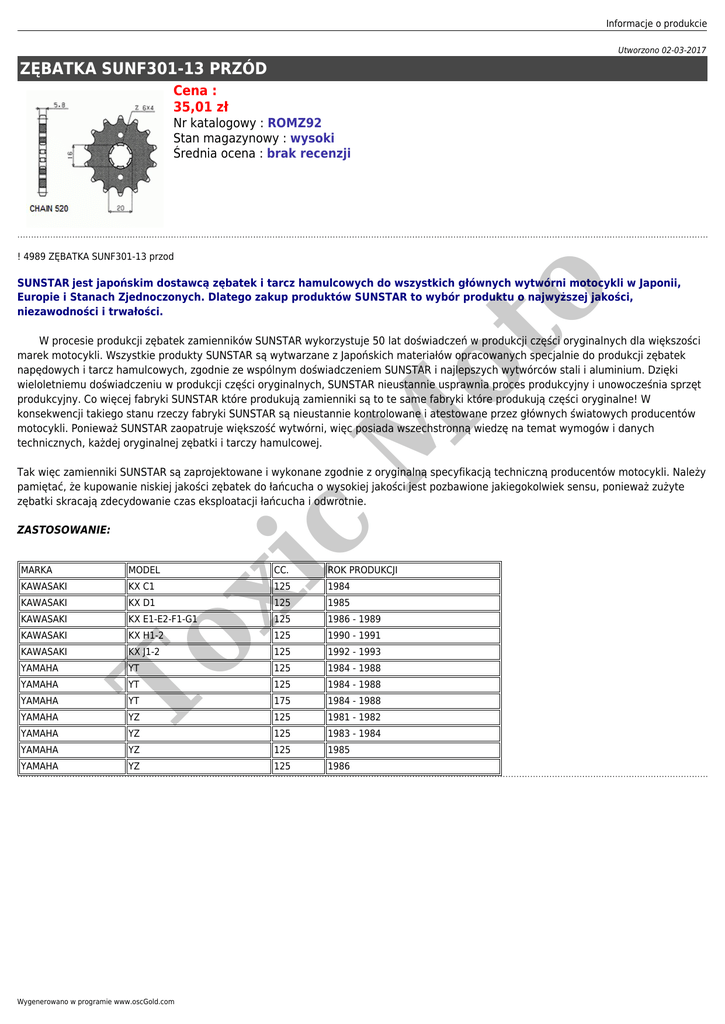 Informacje o produkcie Utworzono 02-03-2017 ZĘBATKA SUNF301-13 PRZÓD Cena : 35,01 zł Nr katalogowy : ROMZ92 Stan magazynowy : wysoki Średnia ocena : brak recenzji ! 4989 ZĘBATKA SUNF301-13 przod ot o SUNSTAR jest japońskim dostawcą zębatek i tarcz hamulcowych do wszystkich głównych wytwórni motocykli w Japonii, Europie i Stanach Zjednoczonych. Dlatego zakup produktów SUNSTAR to wybór produktu o najwyższej jakości, niezawodności i trwałości. M W procesie produkcji zębatek zamienników SUNSTAR wykorzystuje 50 lat doświadczeń w produkcji części oryginalnych dla większości marek motocykli. Wszystkie produkty SUNSTAR są wytwarzane z Japońskich materiałów opracowanych specjalnie do produkcji zębatek napędowych i tarcz hamulcowych, zgodnie ze wspólnym doświadczeniem SUNSTAR i najlepszych wytwórców stali i aluminium. Dzięki wieloletniemu doświadczeniu w produkcji części oryginalnych, SUNSTAR nieustannie usprawnia proces produkcyjny i unowocześnia sprzęt produkcyjny. Co więcej fabryki SUNSTAR które produkują zamienniki są to te same fabryki które produkują części oryginalne! W konsekwencji takiego stanu rzeczy fabryki SUNSTAR są nieustannie kontrolowane i atestowane przez głównych światowych producentów motocykli. Ponieważ SUNSTAR zaopatruje większość wytwórni, więc posiada wszechstronną wiedzę na temat wymogów i danych technicznych, każdej oryginalnej zębatki i tarczy hamulcowej. ZASTOSOWANIE: MODEL CC. ROK PRODUKCJI KAWASAKI KX C1 KAWASAKI KX D1 125 1984 125 1985 KAWASAKI KAWASAKI KX E1-E2-F1-G1 125 1986 - 1989 KX H1-2 125 1990 - 1991 KAWASAKI KX J1-2 125 1992 - 1993 YAMAHA YT 125 1984 - 1988 YAMAHA YT 125 1984 - 1988 YAMAHA YT 175 1984 - 1988 YAMAHA YZ 125 1981 - 1982 YAMAHA YZ 125 1983 - 1984 YAMAHA YZ 125 1985 YAMAHA YZ 125 1986 To xi MARKA c Tak więc zamienniki SUNSTAR są zaprojektowane i wykonane zgodnie z oryginalną specyfikacją techniczną producentów motocykli. Należy pamiętać, że kupowanie niskiej jakości zębatek do łańcucha o wysokiej jakości jest pozbawione jakiegokolwiek sensu, ponieważ zużyte zębatki skracają zdecydowanie czas eksploatacji łańcucha i odwrotnie. Wygenerowano w programie www.oscGold.com