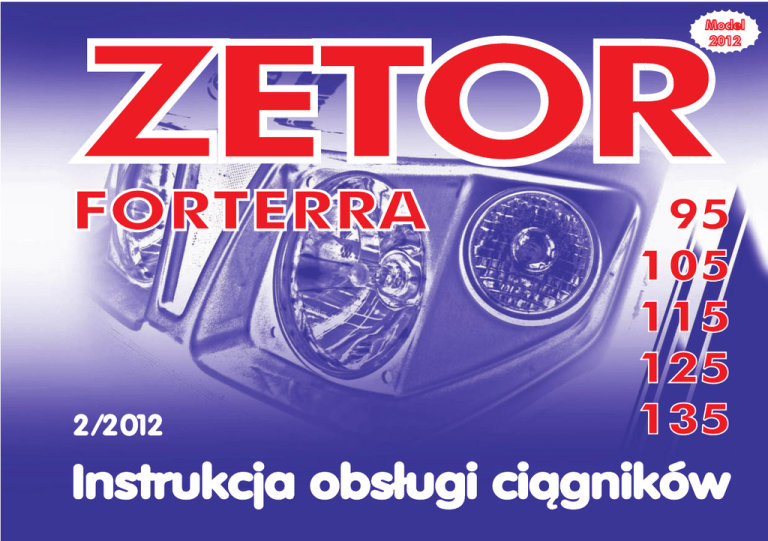 ZETOR Niniejsza instrukcja obsługi ciągników Zetor Forterra umożliwi zaznajomienie się z obsługą i konserwacją nowego ciągnika. Pomimo tego, że wielu z Was posiada już bogate doświadczenia w eksploatacji innych ciągników, prosimy o dokładne zapoznanie się z niniejszą instrukcją. Można w niej znaleźć wiele nowych informacji i uzyskać doskonały przegląd najlepszych sposobów eksploatacji ciągnika w różnych sytuacjach. Przy przestrzeganiu zawartych w niej zasad obsługi, konserwacji i bezpieczeństwa jazdy nowy ciągnik będzie niezawodnym i wieloletnim partnerem. Wiele zadowolenia z tysięcy przepracowanych godzin życzy producent ciągnika. ZETOR Brno 3 Dane techniczne dotyczące konstrukcji, wyposażenia, materiału, wyglądu zewnętrznego są obowiązujące w chwili druku instrukcji. Producent zastrzega sobie prawo do wprowadzenia zmian. 4 SPIS TREŚCI Instrukcja obsługi ciągnika zawiera opis i czynności obsługi technicznej ciągnika w wykonaniu standardowym oraz wyposażenia, w które ciągnik może być wyposażony. Książka gwarancyjna nie jest częścią Instrukcji obsługi. Stanowi samodzielną publikację, którą klient otrzymuje podczas zakupu nowego ciągnika. Strona Umieszczenie numerów fabrycznych .......................................................................... 7 Wskazówki dotyczące bezpieczeństwa użytkownika................................................... 9 Codzienna obsługa techniczna.................................................................................. 14 Zapoznanie się z ciągnikiem ..................................................................................... 21 Jazda ciągnikiem....................................................................................................... 53 Docieranie ciągnika ................................................................................................... 73 Wykorzystanie w transporcie..................................................................................... 77 Napęd maszyn rolniczych ......................................................................................... 83 Układ hydrauliczny .................................................................................................... 89 Elektrohydrauliczny układ sterowania........................................................................ 97 Układy zawieszenia................................................................................................. 109 Zmiana rozstawu kół ............................................................................................... 117 Dodatkowe obciążniki.............................................................................................. 123 Instalacja elektryczna .............................................................................................. 131 Obsługa techniczna ciągnika................................................................................... 141 Wskazówki dotyczące obsługi technicznej .............................................................. 155 Regulacja ................................................................................................................ 179 Główne parametry techniczne ................................................................................. 187 Skorowidz................................................................................................................ 201 5 CIĄGNIKI ZETOR FORTERRA Typ ciągnika Forterra 95 Forterra 105 Forterra 115 Forterra 125 Forterra 135 moc silnika (kW) EC 24 66 74 81 90 95 2000/25/EC 71 79 86 93 100 F11N001 6 UMIESZCZENIE NUMERÓW FABRYCZNYCH F11N002_pl 7 UMIESZCZENIE NUMERÓW FABRYCZNYCH Podczas zamawiania części zamiennych oraz podczas wszelkich kontaktów pisemnych i osobistych prosimy posługiwać się danymi ciągnika, które należy zanotować w poniższych ramkach. Typ ciągnika Zetor Forterra 95 Zetor Forterra 105 Zetor Forterra 115 Zetor Forterra 125 Zetor Forterra 135 Numer fabryczny ciągnika Numer fabryczny silnika Oznaczenie „w prawo”, „w lewo”, „z przodu”, „z tyłu” oznacza w kierunku jazdy. Producent zastrzega sobie prawo wprowadzania zmian konstrukcyjnych i wyposażenia, wynikających z postępu technicznego. F11N003 8 WSKAZÓWKI DOTYCZĄCE BEZPIECZEŃSTWA UŻYTKOWNIKA Szczególną uwagę należy poświęcać częściom instrukcji obsługi, które są oznaczone poniższymi symbolami. Symbol znajduje się obok wszystkich istotnych ostrzeżeń dotyczących bezpieczeństwa pracy podczas eksploatacji ciągnika. W takich przypadkach należy postępować zgodnie z ostrzeżeniami i zachowywać szczególną ostrożność! O tych ostrzeżeniach należy informować współpracowników i pozostałych użytkowników. Rozdziały oznaczone niniejszym symbolem należy dokładnie przestudiować przed rozpoczęciem obsługi technicznej, wykonywaniem napraw i regulacją ciągnika. Symbol znajduje się obok wszystkich istotnych ostrzeżeń dotyczących obsługi, regulacji i napraw rozrusznika. W takich przypadkach należy postępować zgodnie z ostrzeżeniami i zachowywać szczególną ostrożność! ∗ Tym symbolem zostały oznaczone części Instrukcji obsługi dotyczące ochrony środowiska, bądź fragmenty opisujące sposób postępowania z odpadami niebezpiecznymi. Tym symbolem oznaczono wyposażenie ciągnika montowane w zakładzie produkcyjnym na życzenie klienta. Wyposażenie, które nie zostało zamontowane przez producenta (fabrycznie) w wersji standardowej lub ∗ na życzenie klienta, nie może być przedmiotem reklamacji! OGÓLNE ZASADY BEZPIECZEŃSTWA PRACY 1. Ciągnik może użytkować wyłącznie wyszkolony pracownik posiadający ważne prawo jazdy kategorii ciągnikowej, który dokładnie zapoznał się z zasadami eksploatacji i bezpieczeństwa pracy. 2. Oprócz ostrzeżeń dotyczących bezpieczeństwa, zawartych w niniejszej Instrukcji obsługi, należy bezwzględnie prz