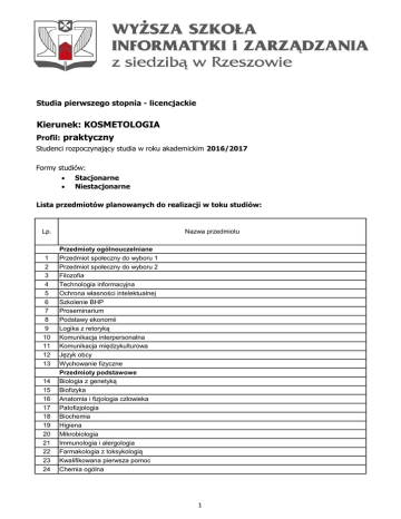 Studia pierwszego stopnia - licencjackie Kierunek: KOSMETOLOGIA Profil: praktyczny Studenci rozpoczynający studia w roku akademickim 2016/2017 Formy studiów: Stacjonarne Niestacjonarne Lista przedmiotów planowanych do realizacji w toku studiów: Lp. 1 2 3 4 5 6 7 8 9 10 11 12 13 14 15 16 17 18 19 20 21 22 23 24 Nazwa przedmiotu Przedmioty ogólnouczelniane Przedmiot społeczny do wyboru 1 Przedmiot społeczny do wyboru 2 Filozofia Technologia informacyjna Ochrona własności intelektualnej Szkolenie BHP Proseminarium Podstawy ekonomii Logika z retoryką Komunikacja interpersonalna Komunikacja międzykulturowa Język obcy Wychowanie fizyczne Przedmioty podstawowe Biologia z genetyką Biofizyka Anatomia i fizjologia człowieka Patofizjologia Biochemia Higiena Mikrobiologia Immunologia i alergologia Farmakologia z toksykologią Kwalifikowana pierwsza pomoc Chemia ogólna 1 25 26 27 28 29 30 31 32 33 34 35 36 37 Przedmioty kierunkowe Kosmetologia pielęgnacyjna Kosmetologia upiększająca Receptura kosmetyczna Dermatologia Fizjoterapia i masaż Chemia kosmetyczna Surowce kosmetyczne Estetyka Podstawy kosmetologii Towaroznawstwo produktów kosmetycznych Gra decyzyjna - menedżer salonu urody Seminarium dyplomowe Praktyka zawodowa Lp. 1 2 Przedmiot społeczny do wyboru 1 Etyka Psychologia Lp. 1 2 Przedmiot społeczny do wyboru 2 Kultury i cywilizacje Socjologia Specjalność: Kosmetologia estetyczna Lp. 1 2 3 4 5 Nazwa przedmiotu Podstawy podologii Makijaż korekcyjny Medycyna estetyczna Perfumeria Stylizacja paznokci Specjalność: Technologia wytwarzania kosmetyków Lp. 1 2 3 4 5 Nazwa przedmiotu Metody pozyskiwania surowców roślinnych Ocena jakości kosmetyku Projektowanie kosmetyku Wytwarzanie i analiza wyrobu perfumeryjnego Analiza kosmetyku 2 Specjalność: Odnowa biologiczna i wellness Lp. 1 2 3 4 5 Nazwa przedmiotu Odnowa biologiczna z elementami masażu Kosmetologia lecznicza i SPA Podstawy dietetyki Balneoterapia z hydroterapią Organizacja i funkcjonowanie ośrodków SPA i Wellness 3