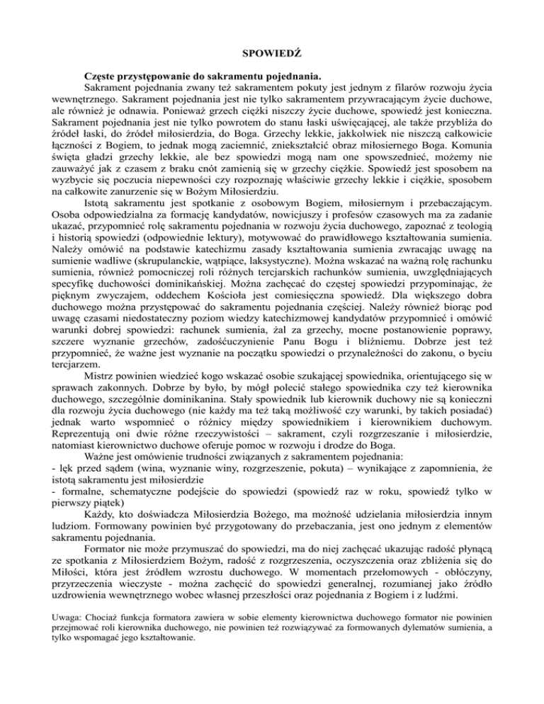 SPOWIEDŹ Częste przystępowanie do sakramentu pojednania. Sakrament pojednania zwany teŜ sakramentem pokuty jest jednym z filarów rozwoju Ŝycia wewnętrznego. Sakrament pojednania jest nie tylko sakramentem przywracającym Ŝycie duchowe, ale równieŜ je odnawia. PoniewaŜ grzech cięŜki niszczy Ŝycie duchowe, spowiedź jest konieczna. Sakrament pojednania jest nie tylko powrotem do stanu łaski uświęcającej, ale takŜe przybliŜa do źródeł łaski, do źródeł miłosierdzia, do Boga. Grzechy lekkie, jakkolwiek nie niszczą całkowicie łączności z Bogiem, to jednak mogą zaciemnić, zniekształcić obraz miłosiernego Boga. Komunia święta gładzi grzechy lekkie, ale bez spowiedzi mogą nam one spowszednieć, moŜemy nie zauwaŜyć jak z czasem z braku cnót zamienią się w grzechy cięŜkie. Spowiedź jest sposobem na wyzbycie się poczucia niepewności czy rozpoznaję właściwie grzechy lekkie i cięŜkie, sposobem na całkowite zanurzenie się w BoŜym Miłosierdziu. Istotą sakramentu jest spotkanie z osobowym Bogiem, miłosiernym i przebaczającym. Osoba odpowiedzialna za formację kandydatów, nowicjuszy i profesów czasowych ma za zadanie ukazać, przypomnieć rolę sakramentu pojednania w rozwoju Ŝycia duchowego, zapoznać z teologią i historią spowiedzi (odpowiednie lektury), motywować do prawidłowego kształtowania sumienia. NaleŜy omówić na podstawie katechizmu zasady kształtowania sumienia zwracając uwagę na sumienie wadliwe (skrupulanckie, wątpiące, laksystyczne). MoŜna wskazać na waŜną rolę rachunku sumienia, równieŜ pomocniczej roli róŜnych tercjarskich rachunków sumienia, uwzględniających specyfikę duchowości dominikańskiej. MoŜna zachęcać do częstej spowiedzi przypominając, Ŝe pięknym zwyczajem, oddechem Kościoła jest comiesięczna spowiedź. Dla większego dobra duchowego moŜna przystępować do sakramentu pojednania częściej. NaleŜy równieŜ biorąc pod uwagę czasami niedostateczny poziom wiedzy katechizmowej kandydatów przypomnieć i omówić warunki dobrej spowiedzi: rachunek sumienia, Ŝal za grzechy, mocne postanowienie poprawy, szczere wyznanie grzechów, zadośćuczynienie Panu Bogu i bliźniemu. Dobrze jest teŜ przypomnieć, Ŝe waŜne jest wyznanie na początku spowiedzi o przynaleŜności do zakonu, o byciu tercjarzem. Mistrz powinien wiedzieć kogo wskazać osobie szukającej spowiednika, orientującego się w sprawach zakonnych. Dobrze by było, by mógł polecić stałego spowiednika czy teŜ kierownika duchowego, szczególnie dominikanina. Stały spowiednik lub kierownik duchowy nie są konieczni dla rozwoju Ŝycia duchowego (nie kaŜdy ma teŜ taką moŜliwość czy warunki, by takich posiadać) jednak warto wspomnieć o róŜnicy między spowiednikiem i kierownikiem duchowym. Reprezentują oni dwie róŜne rzeczywistości – sakrament, czyli rozgrzeszanie i miłosierdzie, natomiast kierownictwo duchowe oferuje pomoc w rozwoju i drodze do Boga. WaŜne jest omówienie trudności związanych z sakramentem pojednania: - lęk przed sądem (wina, wyznanie winy, rozgrzeszenie, pokuta) – wynikające z zapomnienia, Ŝe istotą sakramentu jest miłosierdzie - formalne, schematyczne podejście do spowiedzi (spowiedź raz w roku, spowiedź tylko w pierwszy piątek) KaŜdy, kto doświadcza Miłosierdzia BoŜego, ma moŜność udzielania miłosierdzia innym ludziom. Formowany powinien być przygotowany do przebaczania, jest ono jednym z elementów sakramentu pojednania. Formator nie moŜe przymuszać do spowiedzi, ma do niej zachęcać ukazując radość płynącą ze spotkania z Miłosierdziem BoŜym, radość z rozgrzeszenia, oczyszczenia oraz zbliŜenia się do Miłości, która jest źródłem wzrostu duchowego. W momentach przełomowych - obłóczyny, przyrzeczenia wieczyste - moŜna zachęcić do spowiedzi generalnej, rozumianej jako źródło uzdrowienia wewnętrznego wobec własnej przeszłości oraz pojednania z Bogiem i z ludźmi. Uwaga: ChociaŜ funkcja formatora zawiera w sobie elementy kierownictwa duchowego formator nie powinien przejmować roli kierownika duchowego, nie powinien teŜ rozwiązywać za formowanych dylematów sumienia, a tylko wspomagać jego kształtowanie.