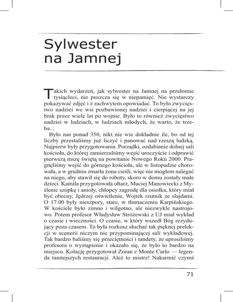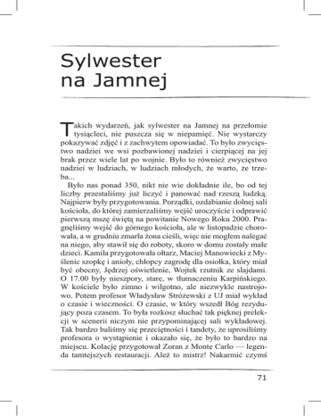 Sylwester na Jamnej T akich wydarzeń, jak sylwester na Jamnej na przełomie tysiącleci, nie puszcza się w niepamięć. Nie wystarczy pokazywać zdjęć i z zachwytem opowiadać. To było zwycięstwo nadziei we wsi pozbawionej nadziei i cierpiącej na jej brak przez wiele lat po wojnie. Było to również zwycięstwo nadziei w ludziach, w ludziach młodych, że warto, że trzeba... Było nas ponad 350, nikt nie wie dokładnie ile, bo od tej liczby przestaliśmy już liczyć i panować nad rzeszą ludzką. Najpierw były przygotowania. Porządki, ozdabianie dolnej sali kościoła, do której zamierzaliśmy wejść uroczyście i odprawić pierwszą mszę świętą na powitanie Nowego Roku 2000. Pragnęliśmy wejść do górnego kościoła, ale w listopadzie chorowała, a w grudniu zmarła żona cieśli, więc nie mogłem nalegać na niego, aby stawił się do roboty, skoro w domu zostały małe dzieci. Kamila przygotowała ołtarz, Maciej Manowiecki z Myślenic szopkę i anioły, chłopcy zagrodę dla osiołka, który miał być obecny, Jędrzej oświetlenie, Wojtek rzutnik ze slajdami. O 17.00 były nieszpory, stare, w tłumaczeniu Karpińskiego. W kościele było zimno i wilgotno, ale niezwykle nastrojowo. Potem profesor Władysław Stróżewski z UJ miał wykład o czasie i wieczności. O czasie, w który wszedł Bóg rezydujący poza czasem. To była rozkosz słuchać tak pięknej prelekcji w scenerii niczym nie przypominającej sali wykładowej. Tak bardzo baliśmy się przeciętności i tandety, że uprosiliśmy profesora o wystąpienie i okazało się, że było to bardzo na miejscu. Kolację przygotował Zoran z Monte Carlo — legenda tamtejszych restauracji. Ależ to mistrz! Nakarmić czymś 71 niebanalnym tyle osób. Makaron polany: aglio, olio e peperoncino. Wszyscy pragnęli dokładki. Szczególną chwilą był śpiew Akatystu o Matce Bożej. To nas porwało i poniosło. Darłem się ze wszystkich sił. Kocham te strofy napisane ku chwale Matki Bożej. Procesja z Dzieciątkiem Jezus z drzewa oliwnego, ze światłem i muzyką, rozrzewniła mnie ogromnie. To dzieciątko podarował mi swego czasu sam Ojciec Święty, a pochodzi ono z Betlejem i jest wielkości naturalnego dziecka. Później, w czasie mszy świętej dziewczęta na zmianę trzymały Dzieciątko na swych rękach, aby powierzyć mu w głębi serc najskrytsze dziewczęce marzenia o przyszłości. Patrzyłem na ich skupione twarze, pełne troski, zadumy i poezji. Pamiętam ich oczy wpatrzone w Dzieciątko. Nie musiałem wiele zgadywać. Na ich twarzach wypisane było wszystko. One były całe dla Dzieciątka, dla Chrystusa przez tę chwilę, na którą czekały, a potem podchodziły i poprawiały pod Dzieciątkiem baranią skórę. Na ich twarzach wymalowane było Boże Narodzenie. Rodowód Pana Jezusa zaśpiewał January, a potem odśpiewaliśmy Litanię do Imienia Jezus, bo z Jego imieniem na ustach pragnęliśmy przekraczać granicę czasu. Mszę odprawiłem z ojcem Andrzejem. Pięknie przemawiał, ja chaotycznie ze wzruszenia. Wyznawszy wiarę w Boga i Chrystusa, ochrzciłem Zuzannę, córkę Marzeny i Wojtka. Co z niej wyrośnie? Któryż z nas, Polaków, nie był kiedyś ochrzczony? Ale dobrze jej życzymy, wcześnie zaczęła przyjeżdżać na Jamną. Po mszy życzenia i zabawa do rana. Osiołek za nic nie chciał wyjść z kościoła. Odpalane na zewnątrz ognie sztuczne i fajerwerki napędziły mu strachu i wolał siedzieć w środku. Pokpiwałem, że życzę wszystkim zdrowia, bo to najważniejsze, a Jędrzej dodawał: „Na ten Nowy Rok”. A tak naprawdę życzyłem Chrystusa i Jego obecności w życiu i po śmierci, bo On jeden jest Zbawicielem świata i człowieka. Przekazałem też wszystkim życzenia od Ojca Świętego przepięknie wypisane na zdjęciu. 777 Tak oto wyglądały ramy naszego poszukiwania głębszego sensu we wspólnocie jamneńskiej. Objawiła się nam Wielka 72 Treść, Miłość wychodząca naprzeciw. Nadzieja przedzierająca się poprzez popioły beznadziei i zwątpienia. Tak, na Jamnej powstaje wioska nadziei. Pokonując niewygodę spędzenia nocy na stojąco i niemożliwości umycia się, zaniechaliśmy celebracji samych siebie i własnych smuteczków, a udawaliśmy się na poszukiwanie głębszego sensu zapisanego w ludzkich sercach. Jeszcze raz dotarło do nas przekonanie, że z domu wynosi się poczucie sensu i chęć służby. Tam, w domu na Jamnej, nakarmiliśmy się Bogiem jak chlebem. Sylwester na Jamnej stał się punktem odniesienia dla naszych działań i przeżyć. Był szczytem naszych możliwości na pewnym etapie naszego wzrostu ku Bogu.