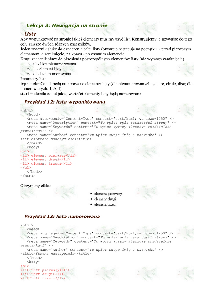 Lekcja 3: Nawigacja na stronie Listy Aby wypunktować na stronie jakieś elementy musimy użyć list. Konstruujemy je używając do tego celu zawsze dwóch różnych znaczników. Jeden znacznik służy do oznaczenia całej listy (otwarcie następuje na początku - przed pierwszym elementem, a zamknięcie, na końcu - po ostatnim elemencie. Drugi znacznik służy do określenia poszczególnych elementów listy (nie wymaga zamknięcia). • ul - lista nienumerowana • li - element listy • ol - lista numerowana Parametry list: type = określa jak będą numerowane elementy listy (dla nienumerowanych: square, circle, disc; dla numerowanych: 1, A, I) start = określa od od jakiej wartości elementy listy będą numerowane Przykład 12: lista wypunktowana <html> <head> <meta http-equiv="Content-Type" content="text/html; windows-1250" /> <meta name="Description" content="Tu wpisz opis zawartości strony" /> <meta name="Keywords" content="Tu wpisz wyrazy kluczowe rozdzielone przecinkami" /> <meta name="Author" content="Tu wpisz swoje imię i nazwisko" /> <title>Strona nauczyciela</title> </head> <body> <ul> <li> element pierwszy</li> <li> element drugi</li> <li> element trzeci</li> </ul> </body> </html> Otrzymany efekt: Przykład 13: lista numerowana <html> <head> <meta http-equiv="Content-Type" content="text/html; windows-1250" /> <meta name="Description" content="Tu wpisz opis zawartości strony" /> <meta name="Keywords" content="Tu wpisz wyrazy kluczowe rozdzielone przecinkami" /> <meta name="Author" content="Tu wpisz swoje imię i nazwisko" /> <title>Strona nauczyciela</title> </head> <body> <ol> <li>Punkt pierwszy</li> <li>Punkt drugi</li> <li>Punkt trzeci</li> </ol> </body> </html> Otrzymany efekt: Przykład 14: zagnieżdżanie list <html> <head> <meta http-equiv="Content-Type" content="text/html; windows-1250" /> <meta name="Description" content="Tu wpisz opis zawartości strony" /> <meta name="Keywords" content="Tu wpisz wyrazy kluczowe rozdzielone przecinkami" /> <meta name="Author" content="Tu wpisz swoje imię i nazwisko" /> <title>Strona nauczyciela</title> </head> <body> <ul> <li>Punkt pierwszy <ul> <li>Punkt 1.1 <ul> <li>Punkt 1.1.1</li> <li>Punkt 1.1.2</li> </ul> </li> <li>Punkt 1.2</li> </ul> </li> <li>Punkt drugi</li> </ul> </body> </html> Otrzymany efekt: Listy wykorzystamy na naszej stronie do wypunktowania zadań i interesujących odnośników do innych stron lub zadań. Zadanie 7 Wpisz do tabeli z zadania zaliczeniowego nr 2 w komórce ZADANIA przykładowe propozycje zadań dla uczniów, a w komórce LINKI przykładowe linki do ważnych stron. Rozwiązanie powinno wyglądać tak: Odnośniki Odniesienia mogą dotyczyć tej samej strony, strony na tym samym serwerze lub w dowolnym miejscu sieci. Odniesieniem może być dowolny element dokumentu. Do podstrony <a href="ścieżka dostępu">opis</a> Do adresu internetowego <a href="http://adres strony">opis</a> Odsyłacz pocztowy <a href="mailto:adres e-mail">opis</a> Porada: Aby otworzyć odnośnik w nowym oknie należy użyć znacznika target <a target="_blank" href="adres">opis</a> Przykład 15: odnośniki do stron w internecie <html> <head> <meta http-equiv="Content-Type" content="text/html; windows-1250" /> <meta name="Description" content="Tu wpisz opis zawartość strony" /> <meta name="Keywords" content="Tu wpisz wyrazy kluczowe rozdzielone przecinkami" /> <meta name="Author" content="Tu wpisz swoje imię i nazwisko" /> <title>Strona nauczyciela</title> </head> <body> <table cellspacing=0 cellpadding=2 width=100% height=100% border=�1�> <tr height=20px> <td >Logo wysokość 100px</td> <td >Baner</td> </tr> <tr> <td valign=top> Linki<br> <a target="_blank" href="http://www.wp.pl">Wirtualna Polska</a><br> <a target="_blank" href="http://www.men.gov.pl">Ministerstwo Edukacji Narodowej</a><br> <a target="_blank" href="http://www.interia.pl">Interia</a><br> <a target="_blank" href="http://www.kurnik.pl">Kurnik-rozrywka</a><br> <a target="_blank" href="http://www.styl24.pl/twojstyl.php">Twój Styl</a><br> </td> <td rowspan="2" bgcolor=#fff9e5 valign=top width=80% >Panel wyświetlania podstron o szerokości 80%</td> </tr> <tr> <td valign=top> Zadania <ul type="none"> <li> zadanie 1</li> <li> zadanie 2</li> <li> zadanie 3</li> <li> zadanie 4</li> </ul> </td> </tr> <tr> <td colspan="2" height=20px valign=middle align=center >Adres pocztowy autora strony</td> </tr> </table> </body> </html> Zadanie 8 Skopiuj przykład 16 i zobacz działanie odnośników. Zamiast listy zastosowany został znacznik przejścia do nowej linii <br>. Otrzymany efekt: Zadanie zaliczeniowe nr 3 Do strony z tabelą dodaj swój adres pocztowy, linki do interesujących stron oraz sformatuj tekst kolorystycznie według uznania. Otrzymaj podobny efekt.