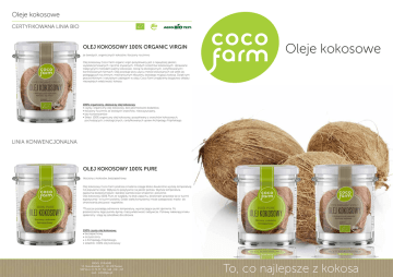 Oleje kokosowe CERTYFIKOWANA LINIA BIO OLEJ KOKOSOWY 100% ORGANIC VIRGIN ze świeżych, organicznych kokosów, tłoczony na zimno Oleje kokosowe Olej kokosowy Coco Farm organic virgin pozyskiwany jest z najwyższej jakości, wyselekcjonowanych i ręcznie zrywanych, młodych orzechów kokosowych. Uprawiane tradycyjnymi metodami palmy kokosowe, rosną na ekologicznych, certyfikowanych i kontrolowanych farmach. Olej powstaje przy użyciu metod stosowanych od setek lat, polegających na zimnym, mechanicznym tłoczeniu świeżego miąższu kokosa. Dzięki tym pracochłonnym i naturalnym zabiegom w oleju Coco Farm znajdziemy bogactwo składu i niezwykłych właściwości kokosa. 100% organiczny, dziewiczy olej kokosowy • czysty, organiczny olej kokosowy, bez jakichkolwiek dodatków, • tłoczony na zimno ze świeżych orzechów, nieoczyszczany, • bez konserwantów • Skład: 100% organiczny olej kokosowy, pozyskiwany z orzechów kokosowych, pochodzących z ekologicznych, certyfikowanych upraw Archipelagu Filipińskiego. LINIA KONWENCJONALNA OLEJ KOKOSOWY 100% PURE tłoczony z kokosów, bezzapachowy Olej kokosowy Coco Farm podczas smażenia osiąga blisko dwukrotnie wyższą temperaturę niż popularne oleje. Wpływa to pozytywnie na jakość potraw. Wyższa temperatura, zapewnia bezpieczniejsze i bardziej wartościowe smażenie i pieczenie. Olej kokosowy 100% Pure ze względu na brak zapachu, doskonale sprawdza się w kuchni egzotycznej i w kuchni polskiej. Dzięki stałej konsystencji może zastępować masło- do smarowania pieczywa i wypieków. *Tłuszcze posiadają odmienne temperatury, wyznaczające punkt dymienia. Po przekroczeniu tego punktu dymią i tracą właściwości odżywcze. Potrawy nabierają smaku spalenizny i stają się szkodliwe dla zdrowia. 100% czysty olej kokosowy. • bezzapachowy • oczyszczony • z Archipelagu Filipińskiego, • składniki: 100% olej kokosowy KPAX POLAND Ul. Nowokramska 13 60-438 Poznań NIP 614-113-78-79 Tel: 668 - 550 - 323 mail: [email protected] To, co najlepsze z kokosa Palma kokosowa - drzewo życia OLEJE KOKOSOWE COCOFARM Palma kokosowa w regionie Pacyfiku nazywana jest „DRZEWEM ŻYCIA” i „DRZEWEM TYSIĄCA ZASTOSOWAŃ”. Zaspokaja wiele podstawowych potrzeb człowieka, dając żywność, lekarstwa, schronienie i energię cieplną. Na wyspach Pacyfiku o kokosie mówi się „LEKARSTWO NA WSZELKIE CHOROBY”. Orzechy kokosowe i pozyskiwane z nich: woda, kopra i olej są powszechnie stosowanymi środkami wspomagającymi leczenie wielu dolegliwości: astmy, chorób związanych z degradacją mózgu, problemów immunologicznych oraz problemów dermatologicznych. Poczynając od łysienia a na zapaleniu skóry kończąc. W tamtejszej tradycyjnej medycynie kokos zastępuje całą aptekę, zapobiegając i lecząc wiele schorzeń. Palma kokosowa rodzi orzechy kokosowe przez cały rok, zbiory odbywają się 4 razy w roku. Z jednego drzewa można uzyskać do 75 orzechów rocznie. Orzech kokosowy to jeden z najcenniejszych darów natury. Z owocu kokosa uzyskujemy sok (zwany wodą kokosową), miąższ (bielmo, kopra). Z miąższu uzyskuje się mleczko, śmietanę, olej i chipsy kokosowe. Użyteczne są również pozostałe części palmy kokosowej. Z włókna, pozyskiwanego z łuski (koiry) wytwarza się liny, pędzle i podłoża do uprawy roślin. Kłodzinę pnia wykorzystuje się w budownictwie, liście mogą przykrywać dachy a skorupy są doskonałym źródłem węgla drzewnego. Palma kokosowa jest niezwykle ekonomiczna i w wielu regionach otacza się ją swego rodzaju czcią. Olej kokosowy - król wśród olejów Olej kokosowy (masło kokosowe, tłuszcz kokosowy) - olej otrzymywany poprzez tłoczenie świeżego miąższu lub kopry. W postaci płynnej jest lekko żółty. W temperaturze poniżej 25°C przybiera wygląd przypominający ścięty, biały tłuszcz (stąd nazwany także masłem kokosowym). Olej kokosowy jest opisywany jako „najzdrowszy olej na ziemi”. Posiada szeroki wachlarz zastosowań. Oprócz kulinarnego może być również stosowany w kosmetyce i pielęgnacji ciała. Olej kokosowy jest wyśmienity jako uniwersalny olej jadalny. Ze względu na bardzo wysoką temperaturę dymienia znakomicie nadaje się do smażenia w wysokich temperaturach. Praktycznie nie zawiera utleniających się kwasów tłuszczowych, co sprawia, że jest bardzo stabilny podczas smażenia w wysokich temperaturach. Dzięki temu jest o wiele zdrowszy od większości popularnych olejów, które nie powinny być podgrzewane do wysokich temperatur, gdyż mogą być wtedy wręcz szkodliwe dla zdrowia. W przeciwieństwie do wielonienasyconych olejów, które łatwo łącząc się z tlenem w powietrzu- jełczeją, olej kokosowy ma naturalną odporność na utlenianie. W zastosowaniach kosmetycznych pomaga utrzymać zdrową skórę i młodzieńczy wygląd. Oleje kokosowe Coco Farm z Archipelagu Filipińskiego najlepszE na świecie! Palma kokosowa rośnie w tropikalnych częściach wybrzeża Afryki i Ameryki oraz na wyspach Oceanu Spokojnego i Indyjskiego. Według opinii światowej klasy ekspertów najlepsze orzechy kokosowe pochodzą z wysp Archipelagu Filipińskiego. Swą unikalną zawartość i niezwykłą czystość, oleje kokosowe coco farm zawdzięczają pochodzeniu z tego najbogatszego pod względem bioróżnorodności regionu świata. OBSZARY ODDZIAŁYWANIA NA ORGANIZM CZŁOWIEKA Właściwości wirusobójcze i bakteriobójcze kwas laurynowy. Olej kokosowy a cholesterol roślinne kwasy nasycone. Utrata wagi i zwiększenie wydolności fizycznej średniołańcuchowe kwasy tłuszczowe. Połowę zawartości oleju kokosowego stanowi kwas laurynowy, który w organizmie przekształca się w monolauryn. Kwas laurynowy występuje w naturze w dużych ilościach tylko w orzechu kokosowym i w mleku matki, wraz z którym dostaje się do organizmu dziecka i tam buduje jego odporność od samych narodzin. Ma silnie bakteriobójcze i wirusobójcze właściwości, ni
