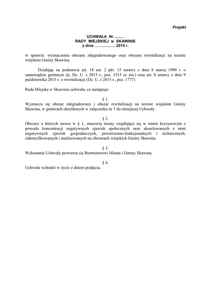 Projekt UCHWAŁA Nr ......... RADY MIEJSKIEJ w SKAWINIE z dnia ……………. 2015 r. w sprawie: wyznaczenia obszaru zdegradowanego oraz obszaru rewitalizacji na terenie wiejskim Gminy Skawina. Działając na podstawie art. 18 ust. 2 pkt. 15 ustawy z dnia 8 marca 1990 r. o samorządzie gminnym (tj. Dz. U. z 2015 r., poz. 1515 ze zm.) oraz art. 8 ustawy z dnia 9 października 2015 r. o rewitalizacji (Dz. U. z 2015 r., poz. 1777) Rada Miejska w Skawinie uchwala, co następuje: § 1. Wyznacza się obszar zdegradowany i obszar rewitalizacji na terenie wiejskim Gminy Skawina, w granicach określonych w załączniku nr 1 do niniejszej Uchwały. § 2. Obszary o których mowa w § 1, stanowią tereny znajdujące się w stanie kryzysowym z powodu koncentracji negatywnych zjawisk społecznych oraz skorelowanych z nimi negatywnych zjawisk gospodarczych, przestrzenno-funkcjonalnych i technicznych, zidentyfikowanych i analizowanych na obszarach wiejskich Gminy Skawina. § 3. Wykonanie Uchwały powierza się Burmistrzowi Miasta i Gminy Skawina. § 4. Uchwała wchodzi w życie z dniem podjęcia. UZASADNIENIE W związku z wejściem w życie ustawy z dnia 9 października 2015 r. o rewitalizacji (Dz. U. z 2015 r., poz. 1777), która określa zasady prac, tryb przygotowywania, prowadzenia i oceny rewitalizacji, przygotowanie, koordynowanie i tworzenie warunków do prowadzenia rewitalizacji, a także jej prowadzenie w zakresie własności gminy, działania w ramach rewitalizacji zostały uznane za zadanie własne. Rewitalizacja stanowi proces wyprowadzania ze stanu kryzysowego obszarów zdegradowanych, prowadzony w sposób kompleksowy, poprzez zintegrowane działania na rzecz lokalnej społeczności, przestrzeni i gospodarki, skoncentrowane terytorialnie, prowadzone przez interesariuszy rewitalizacji na podstawie gminnego programu rewitalizacji. Istotnym elementem rewitalizacji jest włączenie do działań mieszkańców oraz przedstawicieli lokalnych instytucji społecznych czy gospodarczych. Działając na mocy przepisów art. 8 ust. 1 ustawy o rewitalizacji Rada Miejska, na wniosek Burmistrza w drodze uchwały wyznacza obszar zdegradowany oraz obszar rewitalizacji. W efekcie prowadzonych konsultacji społecznych Burmistrz przedkłada wniosek o wyznaczenie obszaru zdegradowanego i obszaru rewitalizacji, który zawiera wskazanie granic tych obszarów wykonane na mapie. Do wniosku załącza się ponadto diagnozę potwierdzającą spełnienie przez obszar zdegradowany i obszar rewitalizacji przesłanek ich wyznaczania. Wniosek uwzględnia uwagi wynikające z przeprowadzonych konsultacji. Wyznaczenie obszaru zdegradowanego i obszaru rewitalizacji zapewni możliwość opracowywania Gminnego Programu Rewitalizacji dla obszarów wiejskich Gminy Skawina, który stanowić będzie podstawowe narzędzie prowadzenia rewitalizacji, zapewniające kompleksowość oraz działania w ścisłej współpracy ze społecznością lokalną. Określenie obszaru rewitalizacji stanowi kontekst planowania i realizacji przedsięwzięć, które mają przyczynić się do rozwiązania kluczowych problemów społecznych zidentyfikowanych na tych obszarach oraz wpłynąć na poprawę jakości życia mieszkańców. Niniejsza Uchwała była poddana konsultacjom społecznym w dniach od 22 stycznia 2016 r. do 22 lutego 2016 r. i przyjęła następujące formy: zbieranie uwag w formie papierowej oraz elektronicznej; warsztaty konsultacyjne adresowane do mieszkańców terenów wiejskich i interesariuszy projektowanych obszarów rewitalizacji, które odbyły się w dniu 29 stycznia 2016 r. w godzinach od 15:00 do 18:00 w Remizie OSP w Rzozowie; debata społeczna mieszkańców terenów wiejskich i interesariuszy projektowanych obszarów rewitalizacji, które odbyły się w dniu 30 stycznia 2016 r. w godzinach od 10:00 do 13:00 w Świetlicy Wiejskiej w Zelczynie.