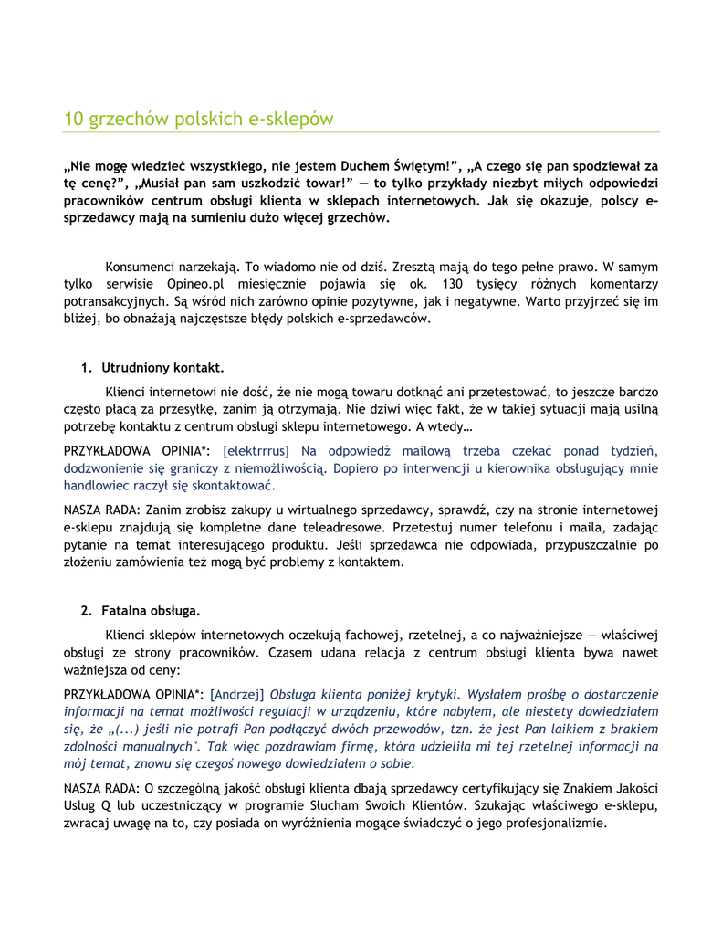 10 grzechów polskich e-sklepów „Nie mogę wiedzieć wszystkiego, nie jestem Duchem Świętym!”, „A czego się pan spodziewał za tę cenę?”, „Musiał pan sam uszkodzić towar!” ― to tylko przykłady niezbyt miłych odpowiedzi pracowników centrum obsługi klienta w sklepach internetowych. Jak się okazuje, polscy esprzedawcy mają na sumieniu dużo więcej grzechów. Konsumenci narzekają. To wiadomo nie od dziś. Zresztą mają do tego pełne prawo. W samym tylko serwisie Opineo.pl miesięcznie pojawia się ok. 130 tysięcy różnych komentarzy potransakcyjnych. Są wśród nich zarówno opinie pozytywne, jak i negatywne. Warto przyjrzeć się im bliżej, bo obnażają najczęstsze błędy polskich e-sprzedawców. 1. Utrudniony kontakt. Klienci internetowi nie dość, że nie mogą towaru dotknąć ani przetestować, to jeszcze bardzo często płacą za przesyłkę, zanim ją otrzymają. Nie dziwi więc fakt, że w takiej sytuacji mają usilną potrzebę kontaktu z centrum obsługi sklepu internetowego. A wtedy… PRZYKŁADOWA OPINIA*: [elektrrrus] Na odpowiedź mailową trzeba czekać ponad tydzień, dodzwonienie się graniczy z niemożliwością. Dopiero po interwencji u kierownika obsługujący mnie handlowiec raczył się skontaktować. NASZA RADA: Zanim zrobisz zakupy u wirtualnego sprzedawcy, sprawdź, czy na stronie internetowej e-sklepu znajdują się kompletne dane teleadresowe. Przetestuj numer telefonu i maila, zadając pytanie na temat interesującego produktu. Jeśli sprzedawca nie odpowiada, przypuszczalnie po złożeniu zamówienia też mogą być problemy z kontaktem. 2. Fatalna obsługa. Klienci sklepów internetowych oczekują fachowej, rzetelnej, a co najważniejsze ― właściwej obsługi ze strony pracowników. Czasem udana relacja z centrum obsługi klienta bywa nawet ważniejsza od ceny: PRZYKŁADOWA OPINIA*: [Andrzej] Obsługa klienta poniżej krytyki. Wysłałem prośbę o dostarczenie informacji na temat możliwości regulacji w urządzeniu, które nabyłem, ale niestety dowiedziałem się, że „(...) jeśli nie potrafi Pan podłączyć dwóch przewodów, tzn. że jest Pan laikiem z brakiem zdolności manualnych". Tak więc pozdrawiam firmę, która udzieliła mi tej rzetelnej informacji na mój temat, znowu się czegoś nowego dowiedziałem o sobie. NASZA RADA: O szczególną jakość obsługi klienta dbają sprzedawcy certyfikujący się Znakiem Jakości Usług Q lub uczestniczący w programie Słucham Swoich Klientów. Szukając właściwego e-sklepu, zwracaj uwagę na to, czy posiada on wyróżnienia mogące świadczyć o jego profesjonalizmie. 3. Uszkodzony towar. To bolesne rozczarowanie, kiedy długo oczekiwana przesyłka okazuje się źle zabezpieczona, a nawet uszkodzona. Zwłaszcza, jeśli towar był drogi lub przewidziany na prezent. Klienci e-sklepów RTV/AGD często skarżą się, że zamówiony przez nich produkt nosi ślady użytkowania, jest zakurzony lub porysowany. Sprzedawcy wówczas tłumaczą, że przez pomyłkę wydali towar poekspozycyjny lub pochodzący ze zwrotów, albo też próbują obarczyć winą kuriera. PRZYKŁADOWA OPINIA*: [Damian] Towar wysłali mechanicznie uszkodzony. Ktoś w sklepie nieumiejętnie chyba produkt testował i uszkodzony towar został sprzedany jako nowy. Nie polecam! NASZA RADA: Jeśli niepokoi Cię wygląd zamówionej rzeczy, wątpisz w to, że jest nowa lub masz pewność, że jest uszkodzona ― reklamuj ją u sprzedawcy. Warto wypełnić i podpisać protokół szkody w obecności kuriera. 4. Przesyłka spóźniona. Niestety, to częste przewinienie e-sklepów, które nie posiadają własnych magazynów z produktami, tylko zamawiają towary u dostawcy. Jeśli e-sklep jest wyłącznie dystrybutorem rzeczy, które sprowadza z zagranicy, wtedy czas dostawy wydłuża się jeszcze bardziej. PRZYKŁADOWA OPINIA*: [Anija] Nie dość, że zamówienie zostało zrealizowane ponad 3 miesiące po jego złożeniu i opłaceniu, to nawet nikt nie pofatygował się, żeby poinformować, co się dzieje z zamówieniem, czy je dostanę, czy nie i czy zostaną zwrócone pieniądze. Nie polecam! NASZA RADA: Przed dokonaniem zakupów, zapoznaj się dokładnie z regulaminem sklepu. Powinna się tam znaleźć informacja o rzeczywistym terminie realizacji zamówienia. Jeśli masz wątpliwości, skontaktuj się ze sprzedającym i wypytaj o szczegóły. 5. Towar okazał się podróbką. Takie podejrzenia mają najczęściej klienci internetowych drogerii i perfumerii, którzy dobrze znają kosmetyk, jaki zamawiają: PRZYKŁADOWA OPINIA*: [abc] Produkt mocno podejrzany. Na spodzie butelki jakby zdrapany kod. Psikacz rozlewa, zamiast spryskiwać. Najgorzej jest jednak z trwałością, po godzinie nie czuć w ogóle, żebym się poperfumowała. To dyskwalifikuje niestety ten sklep u mnie na przyszłość, znam ten zapach z oryginału zakupionego gdzie indziej. Nie polecam sklepu ― to po prostu oszustwo. NASZA RADA: Przed zakupem rzeczy w wybranym sklepie internetowym, przeczytaj opinie na jego temat. Jeśli nigdy wcześniej nie używałeś danego produktu, zapoznaj się z recenzjami, by mieć pewność, czego się spodziewać. Twoją czujność powinna też wzbudzić nad wyraz atrakcyjna cena, która znacznie odbiega od ceny rynkowej. 6. Towar niezgodny z opisem lub inny niż zamówiony. Zamawiając dany produkt, klient ma z reguły konkretne wyobrażenie, jak on będzie wyglądał. Rozczarowuje więc każde odstępstwo od normy: inny rozmiar, kolor, kształt, materiał, z jakiego produkt został wykonany. W tej sytuacji klient czuje się po prostu oszukany: PRZYKŁADOWA OPINIA*: [Piotrburz] Kupiłem u nich fotel. Jak się okazało bezczelnie mijali się z prawdą, pisząc, że fotel jest wykonany ze skóry. W rzeczywistości jest to ordynarny skaj. Podłokietniki nie są z drewna, tylko z prasowanego tłoczywa trocinowo-wiórowego. Amortyzator jest niższy niż w specyfikacji i na zdjęciach. Mówiąc krótko ― n