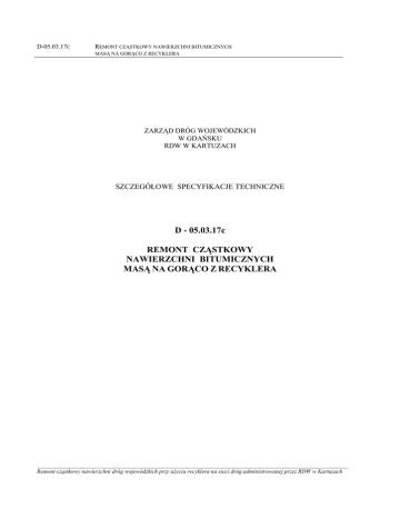 D-05.03.17C REMONT CZĄSTKOWY NAWIERZCHNI BITUMICZNYCH MASĄ NA GORĄCO Z RECYKLERA ZARZĄD DRÓG WOJEWÓDZKICH W GDAŃSKU RDW W KARTUZACH SZCZEGÓŁOWE SPECYFIKACJE TECHNICZNE D - 05.03.17c REMONT CZĄSTKOWY NAWIERZCHNI BITUMICZNYCH MASĄ NA GORĄCO Z RECYKLERA _______________________________________________________________________________________________ Remont cząstkowy nawierzchni dróg wojewódzkich przy użyciu recyklera na sieci dróg administrowanej przez RDW w Kartuzach 1. WSTĘP 1.1. Przedmiot SST Przedmiotem niniejszej szczegółowej specyfikacji technicznej (SST) są wymagania dotyczące wykonania i odbioru robót związanych z remontem cząstkowym nawierzchni asfaltowych masą na gorąco z recyklera. 1.2 Zakres stosowania SST Szczegółowa specyfikacja techniczna (SST) jest dokumentem przetargowym i kontraktowym przy zlecaniu i realizacji robót wymienionych w ppkt 1.1.na drogach wojewódzkich Rejonu Dróg Wojewódzkich w Kartuzach tj. odc. DW nr 211,214,218,221,224,226,228,235 w ilości 1000m2. 1.3 Zakres robót objętych SST Ustalenia zawarte w niniejszej specyfikacji dotyczą zasad prowadzenia robót związanych z wykonaniem i odbiorem remontu cząstkowego nawierzchni bitumicznych, z obcięciem krawędzi o średniej głębokości ubytków 4,0 cm, przy użyciu betonu asfaltowego z recyklera i obejmują: oczyszczenie i smarowanie emulsją asfaltową całej powierzchni ubytków oraz uszczelnieniem – oblaniem (po ułożeniu masy) krawędzi asfaltem, naprawę wybojów i obłamanych krawędzi, uszczelnienie pojedynczych pęknięć i wypełnienie ubytków. Są to zabiegi utrzymaniowe, o małym zakresie, hamujące proces powiększania się powstałych uszkodzeń bądź ich skutki. 1.4. Określenia podstawowe 1.4.1 Nawierzchnia -warstwa lub zespół warstw służących do przejmowania i rozkładania obciążeń od ruchu na podłoże gruntowe i zapewniające dogodne warunki dla ruchu. 1.4.2 Warstwa ścieralna -górna warstwa nawierzchni poddana bezpośrednio oddziaływaniu ruchu i czynników atmosferycznych. 1.4.3 Mieszanka mineralno-asfaltowa -mieszanka mineralna z odpowiednią ilością asfaltu, wytworzona w określony sposób, spełniająca określone wymagania. 1.4.4 Beton asfaltowy (BA) - mieszanka mineralno-asfaltowa o uziarnieniu równomiernie stopniowanym, ułożona i zagęszczona. 1.4.5 Remont cząstkowy nawierzchni bitumicznej -zbiorcze określenie obejmujące różne zabiegi techniczne do ich natychmiastowego wykonania związane z usuwaniem uszkodzeń zagrażających bezpieczeństwu ruchu, jak również zabiegi o małym zakresie (obejmujące małe powierzchnie) bez istotnego przywracania wartości użytkowych, lecz hamujące proces powiększania się powstałych uszkodzeń bądź ich skutków. 1.4.6 Ubytek -wykruszenie materiału mineralno-bitumicznego na głębokość nie większą niż grubość warstwy ścieralnej. 1.4.7 Wybój -wykruszenie materiału mineralno-bitumicznego na głębokość większą niż grubość warstwy ścieralnej. _______________________________________________________________________________________________ Remont cząstkowy nawierzchni dróg wojewódzkich przy użyciu recyklera na sieci dróg administrowanej przez RDW w Kartuzach 1.5 Wymagania dotyczące robót Podczas realizacji robót Wykonawca będzie przestrzegać przepisów dotyczących bezpieczeństwa i higieny pracy. Wykonawca ma obowiązek zadbać, by personel nie wykonywał pracy w warunkach niebezpiecznych, szkodliwych dla zdrowia oraz nie spełniających odpowiednich wymagań sanitarnych. Za bezpieczeństwo na drodze odpowiada Wykonawca robót. Wykonawca ma obowiązek znać i stosować w czasie prowadzenia robót wszelkie przepisy dotyczące ochrony środowiska. Wykonawca robót jest odpowiedzialny za jakość ich wykonania oraz za ich zgodność z dokumentacją przetargową i poleceniami Inspektora nadzoru. Przed przystąpieniem do robót Wykonawca przedstawi Inspektorowi nadzoru zatwierdzony projekt organizacji ruchu i zabezpieczenia robót zgodnie z instrukcją o oznakowaniu robót prowadzonych w pasie drogowym. 2. MATERIAŁY 2.1 Przed przystąpieniem do robót Wykonawca przedstawi do zatwierdzenia przez Inspektora nadzoru, szczegółowe informacja dotyczące proponowanego źródła wytwarzania materiałów i odpowiednie świadectwa badań laboratoryjnych. 2.2. Powierzchnie uszkodzenia nawierzchni (ubytki i wyboje) oraz uszkodzenia krawędzi jezdni (obłamania) powinny być naprawiane mieszankami mineralno-bitumicznymi wytwarzanymi i wbudowywanymi na gorąco typu beton asfaltowy z recyklera. 2.4. Materiały użyte do produkcji mieszanki mineralno - asfaltowej muszą spełniać wymagania podane w tablicy l. Tablica 1. Wymagania wobec materiałów do warstwy ścieralnej z betonu asfaltowego Lp. Rodzaj materiału nr normy 1 2 3 4 5 6 Wymagania wobec materiałów w zależności od kategorii ruchu KR 1lub KR 2 od KR 3 do KR 6 Kruszywo łamane granulowane wg PN-B-11112:1996 [2], PN-B11115:1998 [4] kl. I, II; gat.1, 2 a) ze skał magmowych i przeobrażonych b) ze skał osadowych jw. c) z surowca sztucznego (żużle pomiedziowe i stalownicze) jw. Kruszywo łamane zwykłe wg PN-B-11112:1996 [2] kl. I, II; gat.1, 2 Żwir i mieszanka wg PN-B-11111:1996 [1] kl. I, II Grys i żwir kruszony z naturalnie rozdrobnionego surowca skalnego wg kl. I, II; gat.1, 2 WT/MK-CZDP 84 [15] Piasek wg PN-B-11113:1996 [3] gat. 1, 2 Wypełniacz mineralny: a) wg PN-S-96504:1961[9] podstawowy, kl. I, II1); gat.1 jw.2) kl. I; gat.1 kl. I; gat.1 podstawowy _______________________________________________________________________________________________ Remont cząstkowy nawierzchni dróg wojewódzkich przy użyciu recyklera na sieci dróg administrowanej przez RDW w Kartuzach b) innego pochodzenia orzeczenia laboratoryjnego wg zastępczy pyły z odpylania, popioły lotne - 7 Asfalt drogowy 50/70 50/70 wg PN-EN 12591-2002[6] 8 Polimeroasfalt drogowy DE80 A,B,C, DE80 A,B,C, wg TWT PAD-97 [13] DP80 DP80 1) 1) tylko po