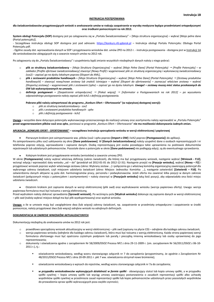 Instrukcja 1B INSTRUKCJA POSTĘPOWANIA dla świadczeniodawców przygotowujących wnioski o aneksowanie umów w rodzaju zaopatrzenie w wyroby medyczne będące przedmiotami ortopedycznymi oraz środkami pomocniczymi na rok 2012. System obsługi Potencjału (SOP) dostępny jest po zalogowaniu się w „Portalu Świadczeniodawcy” – [Moja struktura organizacyjna] – wybrad *Moje pełne dane (Portal potencjału)+. - Szczegółowa instrukcja obsługi SOP dostępna jest pod adresem: https://konkurs.nfz-gdansk.pl – Instrukcja obsługi Portalu Potencjału: Obsługa Portal Potencjału.pdf. - Ogólne zasady dot. wprowadzania danych w SOP i przygotowania wniosków dot. umów ZPO na 2012 r. - instrukcja postępowania - dostępna jest w Instrukcji 1A dla wnioskodawców ubiegających się o zawarcie nowych umów na 2012 rok. Po zalogowaniu się do „Portalu Świadczeniodawcy” i uzupełnieniu bądź zmianie wszystkich niezbędnych danych należy z niego pobrad: o o o plik ze strukturą świadczeniodawcy – [Moja Struktura Organizacyjna] – wybrad *Moje Pełne Dane+ (Portal Potencjału) [Profile Potencjału+ – w zakładce *Profile ofertowe świadczeniodawcy+ stworzyd *Nowy Profil+ i wygenerowad plik ze strukturą organizacyjną i wykonawczą świadczeniodawcy (ssx2) – zapisad go na dysku lokalnym poprzez *Eksport do XML+, plik z zestawami produktów handlowych – [Moja Struktura Organizacyjna] – wybrad *Moje Pełne Dane+ (Portal Potencjału) *Zestawy produktów handlowych] – stworzyd nowy/nowe zestawy lub znaleźd istniejące – wybrad *Eksport do ofertowania+ – zaznaczyd właściwe zestawy – wybrad [Eksportuj zestawy] – wygenerowad plik z zestawami (zphx) – zapisad go na dysku lokalnym. Uwaga! – zestawy muszą mied status przekazanych do OW lub wykorzystywanych na umowie, definicje postępowao – [Zaopatrzenie ortopedyczne] *Pokaż więcej+ *Informator o Postępowaniach na rok 2012] – po wyszukaniu odpowiedniego postępowania należy zapisad plik kch2 z definicją postępowania. Pobrane pliki należy zaimportowad do programu „Konkurs Ofert – Ofertowanie” (w najwyższej dostępnej wersji): o plik ze strukturą świadczeniodawcy - ssx2 o plik z zestawami produktów handlowych - zphx o plik z definicją postępowania - kch2 Uwaga – wszystkie dane dotyczące potencjału wykonawczego przeznaczonego do realizacji umowy oraz asortymentu należy wprowadzid w „Portalu Potencjału” przed wygenerowaniem plików ssx2 oraz zphx, ponieważ w programie „Konkurs Ofert – Ofertowanie” nie ma możliwości dokonywania żadnych zmian. APLIKACJA „KONKURS OFERT - OFERTOWANIE” – szczegółowa instrukcja sporządzenia wniosku w wersji elektronicznej i papierowej Pierwszym krokiem jest zaimportowanie ww. plików (ssx2 i zphx poprzez [Import z OW] i kch2 poprzez *Postępowania+) do aplikacji. Po zaimportowaniu pliku ssx2 uaktywania się okno [Dane podstawowe]. W *Danych świadczeniodawcy+ należy uzupełnid dane o osobach reprezentujących i nr telefonów poprzez edycję, wprowadzanie i zapisanie danych. Osobą reprezentującą jest osoba posiadająca takie uprawnienia na podstawie dokumentów rejestrowych lub udzielonych pełnomocnictw. Pozostałe dane o potencjale w oknie [Dane podstawowe] nie podlegają edycji, są do ewentualnego sprawdzenia. Kolejnym krokiem jest przygotowanie wniosku (wniosków) o zawarcie umowy ZPO. W oknie *Postępowania+ należy wybrad właściwą definicję (zakres świadczeo), dla której ma byd przygotowany wniosek, następnie wybrad [Wniosek - F12], wcisnąd edycję i wprowadzid daty wniosku „od – do” (przedział od 2012-01-01 do 2012-12-31). Następnie przejśd na [Pozycje wniosku], wybrad [Nowy – F2] i przygotowad wniosek poprzez wybór właściwego zestawu (okno: Wybrany zestaw …) i połączenia go z właściwą komórką organizacyjną zawierającą potencjał dla wybranego zakresu świadczeo, czyli miejscem udzielania świadczeo (okno: Miejsce: Jednostka: Komórka: …), następnie zatwierdzid *Zatwierdź – F10]. Po zatwierdzeniu danych aktywne są pola dot. harmonogramów pracy, personelu i podwykonawców. Jeżeli oferta ma zawierad kilka pozycji w danym zakresie świadczeo (połączonych miejsc z potencjałem i asortymentem) – należy stworzyd w [Pozycjach wniosku] taką ilośd pozycji, aby odpowiadała ona ilości miejsc udzielania świadczeo. Ostatnim krokiem jest zapisanie danych w wersji elektronicznej (plik swd) oraz wydrukowanie wniosku (wersja papierowa oferty). Uwaga: wersja papierowa formularza musi byd tożsama z wersją elektroniczną. Przed wydrukiem należy dokonad sprawdzenia *Sprawdź wniosek+. Po wciśnięciu pola [Wydruk wniosku] dokonuje się zapisanie danych w wersji elektronicznej – plik swd (należy wybrad miejsce dokąd ma byd plik wyeksportowany) oraz wydruk wniosku. Uwaga: o ile w umowie mają byd uwzględnione dwa (lub więcej) zakresy świadczeo, np. zaopatrzenie w przedmioty ortopedyczne i zaopatrzenie w środki pomocnicze, należy przygotowad dwa (lub więcej) odrębne wnioski na odrębnych definicjach. DOKUMENTACJA W ZAKRESIE WNIOSKÓW AKTUALIZACYJNYCH Dokumentacją niezbędną do aneksowania umów na 2012 rok jest: o o o prawidłowo sporządzony wniosek aktualizacyjny w wersji elektronicznej – plik swd (zapisany na płycie CD) – odrębnie dla każdego zakresu świadczeo; wersja papierowa wniosku (odrębnie dla każdego zakresu świadczeo), która musi byd tożsama z wersją elektroniczną. Każda strona papierowej wersji formularza ofertowego musi byd opatrzona czytelnym podpisem lub parafą i pieczątką imienną wnioskodawcy lub osoby uprawnionej do jego reprezentowania; dokumenty i oświadczenia zgodne z zarządzeniem Nr 58/2009/DSOZ Prezesa NFZ z dnia 29-11-2009 r. (zm. zarządzeniem Nr 56/2011/DSOZ z 06-102011 r.), tj.: oświadczenie wnioskodawcy, według wzoru stanowiącego załącznik nr 7 do zarządzenia (przypominamy, że zgodnie z Zarządzeniem Nr 48/2011/DSOZ Prezesa NFZ z dn