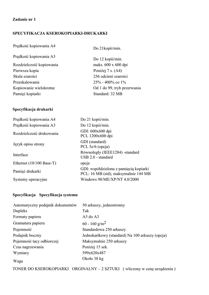 Zadanie nr 1 SPECYFIKACJA KSEROKOPIARKI