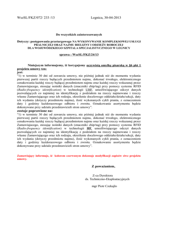WszSL/FKZ/072/ 233 /13 Legnica, 30-04-2013 Do wszystkich zainteresowanych Dotyczy: postępowania przetargowego NA WYKONYWANIE KOMPLEKSOWEJ USŁUGI PRALNICZEJ ORAZ NAJMU BIELIZNY I ODZIEŻY ROBOCZEJ DLA WOJEWÓDZKIEGO SZPITALA SPECJALISTYCZNEGO W LEGNICY sprawa : WszSL/FKZ/24/13 Niniejszym informujemy, iż korygujemy oczywistą omyłkę pisarską w §6 pkt 1 projektu umowy tzn: jest: "1) w terminie 30 dni od zawarcia umowy, nie później jednak niż do momentu wydania pierwszej partii rzeczy będących przedmiotem najmu, dokonać trwałego, elektronicznego oznakowania każdej rzeczy będącej przedmiotem najmu oraz każdej rzeczy wskazanej przez Zamawiajacego, stosując nośniki danych (znaczniki chip/tag) przy pomocy systemu RFID (Radio-frequency identification) w technologii UHF, umożliwiającego odczyt danych pozwalających co najmniej na identyfikację z podziałem na rzeczy najmowane i rzeczy własne Zamawiającego oraz ich rodzaju, określenie docelowego oddziału/działu/sekcji, daty ich wydania (dotyczy przedmiotu najmu), ilość wykonanych cykli prania, z oznaczeniem daty i godziny każdorazowego odbioru i zwrotu. Oznakowanie asortymentu będzie dokonywane przy udziale przedstawicieli stron umowy”. zostaje poprawione na: "1) w terminie 30 dni od zawarcia umowy, nie później jednak niż do momentu wydania pierwszej partii rzeczy będących przedmiotem najmu, dokonać trwałego, elektronicznego oznakowania każdej rzeczy będącej przedmiotem najmu oraz każdej rzeczy wskazanej przez Zamawiajacego, stosując nośniki danych (znaczniki chip/tag) przy pomocy systemu RFID (Radio-frequency identification) w technologii HF, umożliwiającego odczyt danych pozwalających co najmniej na identyfikację z podziałem na rzeczy najmowane i rzeczy własne Zamawiającego oraz ich rodzaju, określenie docelowego oddziału/działu/sekcji, daty ich wydania (dotyczy przedmiotu najmu), ilość wykonanych cykli prania, z oznaczeniem daty i godziny każdorazowego odbioru i zwrotu. Oznakowanie asortymentu będzie dokonywane przy udziale przedstawicieli stron umowy”. Zamawiający informuje, iż kolorem czerwonym dokonuje modyfikacji zapisów siwz projektu umowy. Z poważaniem, Z-ca Dyrektora ds. Techniczno-Eksploatacyjnych mgr Piotr Czekajło
