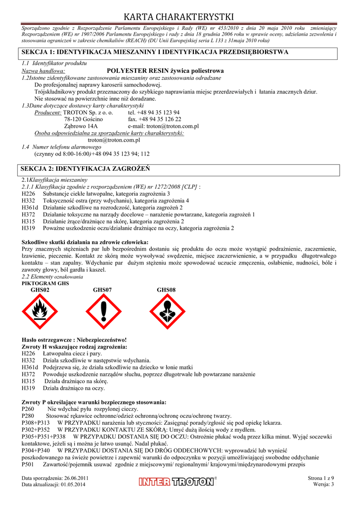 KARTA CHARAKTERYSTKI Sporządzono zgodnie z Rozporządzenie Parlamentu Europejskiego i Rady (WE) nr 453/2010 z dnia 20 maja 2010 roku zmieniający Rozporządzeniem (WE) nr 1907/2006 Parlamentu Europejskiego i rady z dnia 18 grudnia 2006 roku w sprawie oceny, udzielania zezwolenia i stosowania ograniczeń w zakresie chemikaliów (REACH) (DU Unii Europejskiej seria L 133 z 31maja 2010 roku) SEKCJA 1: IDENTYFIKACJA MIESZANINY I IDENTYFIKACJA PRZEDSIĘBIORSTWA 1.1 Identyfikator produktu Nazwa handlowa: POLYESTER RESIN żywica poliestrowa 1.2Istotne zidentyfikowane zastosowania mieszaniny oraz zastosowania odradzane Do profesjonalnej naprawy karoserii samochodowej. Trójskładnikowy produkt przeznaczony do szybkiego naprawiania miejsc przerdzewiałych i łatania znacznych dziur. Nie stosować na powierzchnie inne niż doradzane. 1.3Dane dotyczące dostawcy karty charakterystyki Producent: TROTON Sp. z o. o. tel. +48 94 35 123 94 78-120 Gościno fax. +48 94 35 126 22 Ząbrowo 14A e-mail: [email protected] Osoba odpowiedzialna za sporządzenie karty charakterystyki: [email protected] 1.4 Numer telefonu alarmowego (czynny od 8:00-16:00)+48 094 35 123 94; 112 SEKCJA 2: IDENTYFIKACJA ZAGROŻEŃ 2.1Klasyfikacja mieszaniny 2.1.1 Klasyfikacja zgodnie z rozporządzeniem (WE) nr 1272/2008 [CLP] : H226 Substancje ciekłe łatwopalne, kategoria zagrożenia 3 H332 Toksyczność ostra (przy wdychaniu), kategoria zagrożenia 4 H361d Działanie szkodliwe na rozrodczość, kategoria zagrożeń 2 H372 Działanie toksyczne na narządy docelowe – narażenie powtarzane, kategoria zagrożeń 1 H315 Działanie żrące/drażniące na skórę, kategoria zagrożenia 2 H319 Poważne uszkodzenie oczu/działanie drażniące na oczy, kategoria zagrożenia 2 Szkodliwe skutki działania na zdrowie człowieka: Przy znacznych stężeniach par lub bezpośrednim dostaniu się produktu do oczu może wystąpić podrażnienie, zaczernienie, łzawienie, pieczenie. Kontakt ze skórą może wywoływać swędzenie, miejsce zaczerwienienie, a w przypadku długotrwałego kontaktu – stan zapalny. Wdychanie par dużym stężeniu może spowodować uczucie zmęczenia, osłabienie, nudności, bóle i zawroty głowy, ból gardła i kaszel. 2.2 Elementy oznakowania PIKTOGRAM GHS GHS02 GHS07 GHS08 Hasło ostrzegawcze : Niebezpieczeństwo! Zwroty H wskazujące rodzaj zagrożenia: H226 Łatwopalna ciecz i pary. H332 Działa szkodliwie w następstwie wdychania. H361d Podejrzewa się, że działa szkodliwie na dziecko w łonie matki H372 Powoduje uszkodzenie narządów słuchu, poprzez długotrwałe lub powtarzane narażenie H315 Działa drażniąco na skórę. H319 Działa drażniąco na oczy. Zwroty P określające warunki bezpiecznego stosowania: P260 Nie wdychać pyłu rozpylonej cieczy. P280 Stosować rękawice ochronne/odzież ochronną/ochronę oczu/ochronę twarzy. P308+P313 W PRZYPADKU narażenia lub styczności: Zasięgnąć porady/zgłosić się pod opiekę lekarza. P302+P352 W PRZYPADKU KONTAKTU ZE SKÓRĄ: Umyć dużą ilością wody z mydłem. P305+P351+P338 W PRZYPADKU DOSTANIA SIĘ DO OCZU: Ostrożnie płukać wodą przez kilka minut. Wyjąć soczewki kontaktowe, jeżeli są i można je łatwo usunąć. Nadal płukać. P304+P340 W PRZYPADKU DOSTANIA SIĘ DO DRÓG ODDECHOWYCH: wyprowadzić lub wynieść poszkodowanego na świeże powietrze i zapewnić warunki do odpoczynku w pozycji umożliwiającej swobodne oddychanie P501 Zawartość/pojemnik usuwać zgodnie z miejscowymi/ regionalnymi/ krajowymi/międzynarodowymi przepis Data sporządzenia: 26.06.2011 Data aktualizacji: 01.05.2014 Strona 1 z 9 Wersja: 3 Zawiera: styren VOC=395g/l Dz. U. 2007r. Nr 11, poz.72, kat. B/3 (540) 395 2004/42/WE IIB(c) (540) 395 2.3 Inne zagrożenia Składniki mieszaniny nie są zaliczone do kategorii vPvB ani do PBT zgodnie z załącznikiem XIII. Produkt w postaci wysoce-lepiej cieczy. Mieszanina cięższa od wody i nierozpuszczalna w wodzie. Wydziela toksyczne gazy w przypadku pożaru. SEKCJA 3: SKŁAD/INFORMACJE O SKŁADNIKACH 3.2Mieszaniny Skład/informacje o składnikach: Nazwa substancji: Styren Numer rejestracji REACH: brak danych nr indeksowy 601-026-00-0 nr CAS 100-42-5 nr WE 202-851-5 Ułamek masowy w% 25-40 Klasyfikacja zgodna z Rozporządzeniem (WE)nr 1272/2008* Kody Klasy zwrotów zagrożenie i wskazujących kody kategorii rodzaj zagrożenia Flam. Liq. 3 Acute Tox. 4 Eye Irrit. 2 Skin Irrit. 2 Repr. 2 STOT RE 1 H226 H332 H319 H315 H361d H372 Pełne brzmienie użytych zwrotów i symboli w sekcji 16 karty. *Rozporządzenie Parlamentu Europejskiego i Rady (WE) nr 1272/2008 z dnia 16 grudnia 2008r. w sprawie klasyfikacji, oznakowania i pakowania substancji i mieszanin, zmieniające i uchylające dyrektywy 67/548/EWG i 1999/45/WE oraz zmieniające rozporządzenie (WE) nr 1907/2006 (Dz. Urz. UE L 353 z 31 grudnia 2008r.z póz. zmianami). SEKCJA 4: ŚRODKI PIERWSZEJ POMOCY 4.1 Opis środków pierwszej pomocy Natychmiastowa pomoc lekarska nie jest konieczna. Wyprowadzić poszkodowanego na świeże powietrze. Zalecania ogólne: Powinny być przestrzegane środki ostrożności jak przy pracy z chemikaliami. Jeżeli wystąpią jakiekolwiek niepokojące objawy, wezwać pomoc medyczną. Symptomy zatrucia mogą wystąpić dopiero po kilku godzinach, dlatego kontrola lekarska jest niezbędna, co najmniej przez 48 godzin od wypadku. Po narażeniu inhalacyjnym: Wyprowadzić poszkodowanego na świeże powietrze, zapewnić spokój, okryć kocem. Jeżeli objawy nie ustępują, wezwać pomoc medyczną. W przypadku, gdy osoba poszkodowana jest nieprzytomna, ułożyć ją w pozycji bezpiecznej (np. pozycji bocznej ustalonej), niezwłocznie wezwać pomoc medyczną Po połknięciu: Wypłukać usta dużą ilością wody. Jeżeli nastąpi połknięcie, nie powodować wymiotów, ponieważ istnieje ryzyko zachłyśnięcia się i przedostania się substancji do płuc W przypadku połknięcia - zapewnić natychmiastową pomoc medyczną, pokazać kartę charakterystyki 