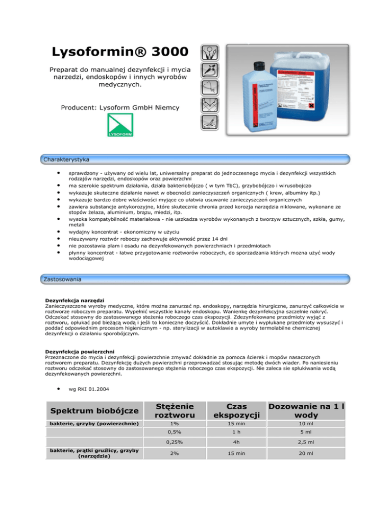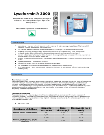 Lysoformin® 3000 Preparat do manualnej dezynfekcji i mycia narzedzi, endoskopów i innych wyrobów medycznych. Producent: Lysoform GmbH Niemcy • sprawdzony - używany od wielu lat, uniwersalny preparat do jednoczesnego mycia i dezynfekcji wszystkich rodzajów narzędzi, endoskopów oraz powierzchni • • • • ma szerokie spektrum działania, działa bakteriobójczo ( w tym TbC), grzybobójczo i wirusobojczo wykazuje skuteczne działanie nawet w obecności zanieczyszczeń organicznych ( krew, albuminy itp.) wykazuje bardzo dobre właściwości myjące co ułatwia usuwanie zanieczyszczeń organicznych zawiera substancje antykorozyjne, które skutecznie chronia przed korozja narzędzia niklowane, wykonane ze stopów żelaza, aluminium, brązu, miedzi, itp. • wysoka kompatybilność materiałowa - nie uszkadza wyrobów wykonanych z tworzyw sztucznych, szkła, gumy, metali • • • • wydajny koncentrat - ekonomiczny w użyciu nieuzywany roztwór roboczy zachowuje aktywność przez 14 dni nie pozostawia plam i osadu na dezynfekowanych powierzchniach i przedmiotach płynny koncentrat - łatwe przygotowanie roztworów roboczych, do sporzadzania których mozna użyć wody wodociągowej Dezynfekcja narzędzi Zanieczyszczone wyroby medyczne, które można zanurzać np. endoskopy, narzędzia hirurgiczne, zanurzyć całkowicie w roztworze roboczym preparatu. Wypełnić wszystkie kanały endoskopu. Wanienkę dezynfekcyjna szczelnie nakryć. Odczekać stosowny do zastosowanego steżenia roboczego czas ekspozycji. Zdezynfekowane przedmioty wyjąć z roztworu, opłukać pod bieżącą wodą i jeśli to konieczne doczyścić. Dokładnie umyte i wypłukane przedmioty wysuszyć i poddać odpowiednim procesom higienicznym - np. sterylizacji w autoklawie a wyroby termolabilne chemicznej dezynfekcji o działaniu sporobójczym. Dezynfekcja powierzchni Przeznaczone do mycia i dezynfekcji powierzchnie zmywać dokładnie za pomoca ścierek i mopów nasaczonych roztworem preparatu. Dezynfekcję dużych powierzchni przeprowadzać stosując metodę dwóch wiader. Po naniesieniu roztworu odczekać stosowny do zastosowanego stężenia roboczego czas ekspozycji. Nie zaleca sie spłukiwania wodą dezynfekowanych powierzchni. • wg RKI 01.2004 Spektrum biobójcze bakterie, grzyby (powierzchnie) bakterie, prątki gruźlicy, grzyby (narzędzia) Stężenie roztworu Czas ekspozycji Dozowanie na 1 l wody 1% 15 min 10 ml 0,5% 1h 5 ml 0,25% 4h 2,5 ml 2% 15 min 20 ml bakterie, mycobacterium terrae, grzyby (narzędzia) 1,5% 30 min 15 ml 1% 1h 10 ml 3% 15 min 30 ml 2,5% 30 min 25 ml 1,5% 1h 15 ml wirusy: HIV /HBV /HCV* 0,25% 15 min 2,5 ml Adeno 0,25% 15 min 2,5 ml Vaccinia Rota 0,25% 2% 1 min 30 min 0,25 ml 20 ml Polio 2% 1h 20 ml Stosowac wyłącznie w postaci rozcieńczonej. na każdy litr roztworu rozboczego należy odmierzyć odpowiednią objętość koncentratu i dodać do uprzednio odmierzonej wody wodociągowej. Po wymieszaniu roztwór jest gotowy do użycia. Nie dodawać innych substancji chemicznych ani detergentów, które moga znieść lub obniżyć działanie dezynfekujące preparatu. Podczas pracy z koncentratem jak i roztworem roboczym stosować rękawice ochronne. 100 g koncentratu zawiera: chlorek didecylodimetyloamoniowy - 9,6g glutaraldehyd - 9,5g glioksal - 7,5g, opakowanie pojemność butelka 1 litr kanister 5 litrów wyposażenie dodatkowe pompka dozująca do kanistra (doza a'20 ml) kranik do kanistra Wyrób Medyczny klasy IIa