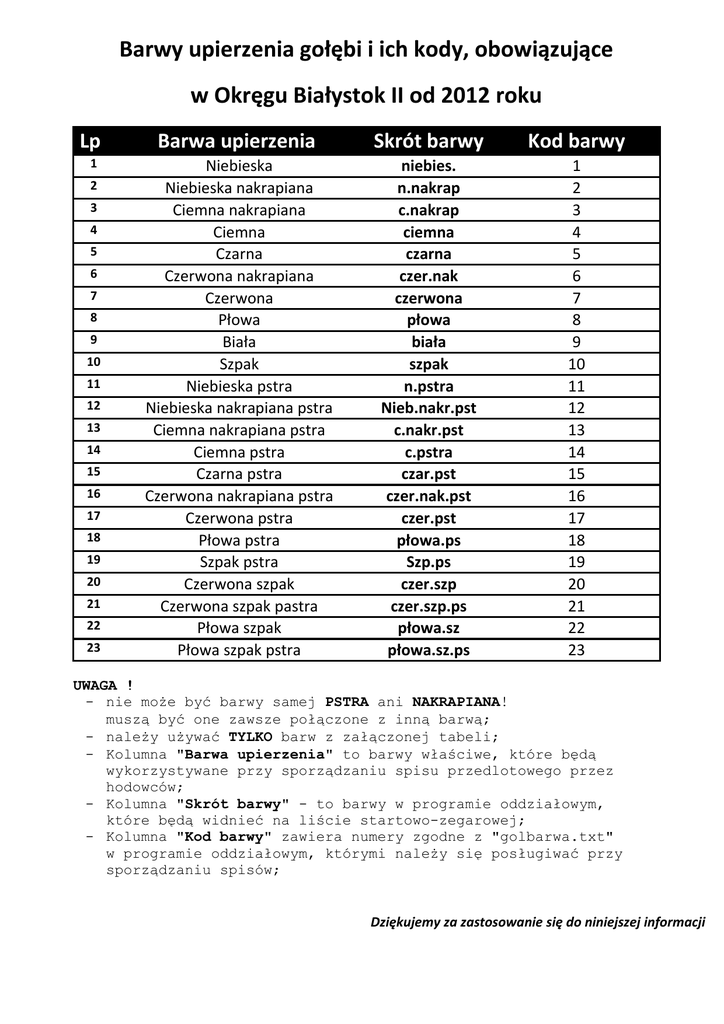 Barwy upierzenia gołębi i ich kody, obowiązujące w Okręgu Białystok II od 2012 roku Lp Barwa upierzenia Skrót barwy Kod barwy 1 Niebieska Niebieska nakrapiana Ciemna nakrapiana Ciemna Czarna Czerwona nakrapiana Czerwona Płowa Biała Szpak Niebieska pstra Niebieska nakrapiana pstra Ciemna nakrapiana pstra Ciemna pstra Czarna pstra Czerwona nakrapiana pstra Czerwona pstra Płowa pstra Szpak pstra Czerwona szpak Czerwona szpak pastra Płowa szpak Płowa szpak pstra niebies. n.nakrap c.nakrap ciemna czarna czer.nak czerwona płowa biała szpak n.pstra Nieb.nakr.pst c.nakr.pst c.pstra czar.pst czer.nak.pst czer.pst płowa.ps Szp.ps czer.szp czer.szp.ps płowa.sz płowa.sz.ps 1 2 3 4 5 6 7 8 9 10 11 12 13 14 15 16 17 18 19 20 21 22 23 2 3 4 5 6 7 8 9 10 11 12 13 14 15 16 17 18 19 20 21 22 23 UWAGA ! - nie może być barwy samej PSTRA ani NAKRAPIANA! muszą być one zawsze połączone z inną barwą; - należy używać TYLKO barw z załączonej tabeli; - Kolumna "Barwa upierzenia" to barwy właściwe, które będą wykorzystywane przy sporządzaniu spisu przedlotowego przez hodowców; - Kolumna "Skrót barwy" - to barwy w programie oddziałowym, które będą widnieć na liście startowo-zegarowej; - Kolumna "Kod barwy" zawiera numery zgodne z "golbarwa.txt" w programie oddziałowym, którymi należy się posługiwać przy sporządzaniu spisów; Dziękujemy za zastosowanie się do niniejszej informacji