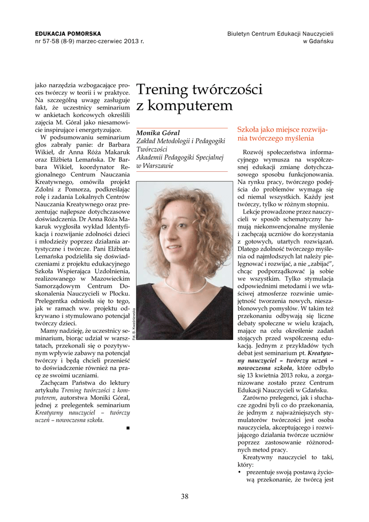 Biuletyn Centrum Edukacji Nauczycieli w Gdańsku EDUKACJA POMORSKA nr 57-58 (8-9) marzec-czerwiec 2013 r. Trening twórczości z komputerem Monika Góral Zakład Metodologii i Pedagogiki Twórczości Akademii Pedagogiki Specjalnej w Warszawie Fot. B. Kwaśniewska jako narzędzia wzbogacające proces twórczy w teorii i w praktyce. Na szczególną uwagę zasługuje fakt, że uczestnicy seminarium w ankietach końcowych określili zajęcia M. Góral jako niesamowicie inspirujące i energetyzujące. W podsumowaniu seminarium głos zabrały panie: dr Barbara Wikieł, dr Anna Róża Makaruk oraz Elżbieta Lemańska. Dr Barbara Wikieł, koordynator Regionalnego Centrum Nauczania Kreatywnego, omówiła projekt Zdolni z Pomorza, podkreślając rolę i zadania Lokalnych Centrów Nauczania Kreatywnego oraz prezentując najlepsze dotychczasowe doświadczenia. Dr Anna Róża Makaruk wygłosiła wykład Identyfikacja i rozwijanie zdolności dzieci i młodzieży poprzez działania artystyczne i twórcze. Pani Elżbieta Lemańska podzieliła się doświadczeniami z projektu edukacyjnego Szkoła Wspierająca Uzdolnienia, realizowanego w Mazowieckim Samorządowym Centrum Doskonalenia Nauczycieli w Płocku. Prelegentka odniosła się to tego, jak w ramach ww. projektu odkrywano i stymulowano potencjał twórczy dzieci. Mamy nadzieję, że uczestnicy seminarium, biorąc udział w warsztatach, przekonali się o pozytywnym wpływie zabawy na potencjał twórczy i będą chcieli przenieść to doświadczenie również na pracę ze swoimi uczniami. Zachęcam Państwa do lektury artykułu Trening twórczości z komputerem, autorstwa Moniki Góral, jednej z prelegentek seminarium Kreatywny nauczyciel – twórczy uczeń – nowoczesna szkoła. ■ 38 Szkoła jako miejsce rozwijania twórczego myślenia Rozwój społeczeństwa informacyjnego wymusza na współczesnej edukacji zmianę dotychczasowego sposobu funkcjonowania. Na rynku pracy, twórczego podejścia do problemów wymaga się od niemal wszystkich. Każdy jest twórczy, tylko w różnym stopniu. Lekcje prowadzone przez nauczycieli w sposób schematyczny hamują niekonwencjonalne myślenie i zachęcają uczniów do korzystania z gotowych, utartych rozwiązań. Dlatego zdolność twórczego myślenia od najmłodszych lat należy pielęgnować i rozwijać, a nie „zabijać”, chcąc podporządkować ją sobie we wszystkim. Tylko stymulacja odpowiednimi metodami i we właściwej atmosferze rozwinie umiejętność tworzenia nowych, nieszablonowych pomysłów. W takim też przekonaniu odbywają się liczne debaty społeczne w wielu krajach, mające na celu określenie zadań stojących przed współczesną edukacją. Jednym z przykładów tych debat jest seminarium pt. Kreatywny nauczyciel – twórczy uczeń – nowoczesna szkoła, które odbyło się 13 kwietnia 2013 roku, a zorganizowane zostało przez Centrum Edukacji Nauczycieli w Gdańsku. Zarówno prelegenci, jak i słuchacze zgodni byli co do przekonania, że jednym z najważniejszych stymulatorów twórczości jest osoba nauczyciela, akceptującego i rozwijającego działania twórcze uczniów poprzez zastosowanie różnorodnych metod pracy. Kreatywny nauczyciel to taki, który: • prezentuje swoją postawą życiową przekonanie, że twórcą jest Biuletyn Centrum Edukacji Nauczycieli w Gdańsku EDUKACJA POMORSKA nr 57-58 (8-9) marzec-czerwiec 2013 r. każdy poprzez rozwiązywanie codziennych problemów, unikając rutyny i nawyków oraz poprzez zachowanie dziecięcej zdolności zadziwiania się otaczającym światem; • świadczy swoją postawą wobec własnego warsztatu pracy, poprzez stosowanie nowatorskich scenariuszy lekcji, otwartością na propozycje innych, w tym również uczniów, tworzeniem i przekształcaniem programu nauczania (program autorski), uczestniczeniem w konferencjach, seminariach, szkoleniach; • rozwija za pomocą odpowiednich metod nauczania i zadań twórczych potrzebną wiedzę i umiejętności, organizuje zajęcia kształcące twórcze myślenie, np. w postaci treningu twórczości, a także usuwa różnorodne bariery i przeszkody, które hamują twórczą aktywność. Zajęcia stymulujące twórcze myślenie polegają na wykonywaniu ćwiczeń, w których uczniowie zachęcani są do rozwijania umiejętności dostrzegania i rozwiązywania problemów, przełamywania utartych schematów myślenia, zauważania podobieństw i różnic, metaforyzowania, uczenia przewidywania następstw, pobudzania wyobraźni, rozwijania umiejętności współpracy w grupie. Rodzi się więc pytanie, gdzie szukać takich ćwiczeń? Obecnie na rynku dostępnych jest kilka propozycji programów i zbiorów ćwiczeń, których głównym celem jest stymulowanie twórczego myślenia. Jedną z cennych pozycji jest Trening twórczości z komputerem1. Książka jest owocem pracy zespołu pracowników Zakładu Metodologii i Pedagogiki Twórczości Akademii Pedagogiki Specjalnej w Warszawie, którzy przeprowadzili badania dotyczące kompetencji twórczych uczniów różnych grup wiekowych. Prace badawcze wykazały przyrost kompetencji uczestników treningu, a ponadto okazało sie, że ww. trening jest również znaczącym środkiem socjalizacyjnym. Na Trening twórczości z komputerem składa się 150 ćwiczeń, po 5 do każdego etapu dla każdej z trzech grup wiekowych (nauczanie zintegrowane, kl. IV - VI szkoły podstawowej, gimnazjum). W podręczniku zamieszczono również wskazówki metodyczne, dołączono także płytę z potrzebnymi materiałami: plikami do zapisania na komputerze uczniów i dodatkowymi materiałami, gotowymi do wydruku. Zadania zawarte w pracy dotyczą różnych aspektów myślenia twórczego i niektóre są przeznaczone do pracy indywidualnej, a niektóre - do grupowej. Dla każdej grupy wiekowej trening składa się z dziesięciu etapów (zgodnie z modelem treningu twórczości stworzonym przez A. Góralskiego)2: Poznajmy się; Tworzymy grupę; Postrzegamy różnorodność św