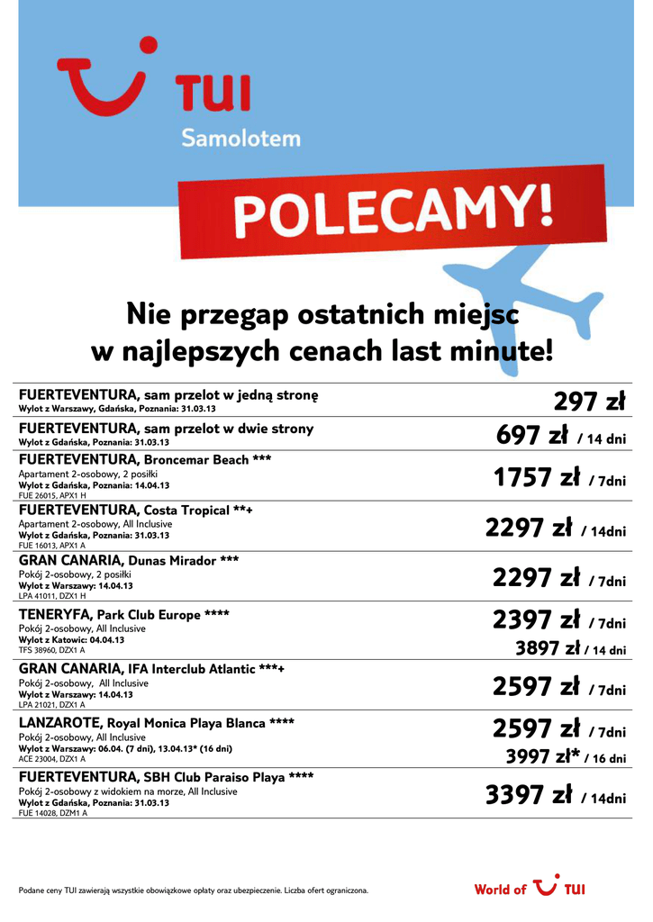 Nie przegap ostatnich miejsc w najlepszych cenach last minute! FUERTEVENTURA, sam przelot w jedną stronę Wylot z Warszawy, Gdańska, Poznania: 31.03.13 FUERTEVENTURA, sam przelot w dwie strony Wylot z Gdańska, Poznania: 31.03.13 FUERTEVENTURA, Broncemar Beach *** Apartament 2-osobowy, 2 posiłki Wylot z Gdańska, Poznania: 14.04.13 FUE 26015, APX1 H FUERTEVENTURA, Costa Tropical **+ Apartament 2-osobowy, All Inclusive Wylot z Gdańska, Poznania: 31.03.13 FUE 16013, APX1 A GRAN CANARIA, Dunas Mirador *** Pokój 2-osobowy, 2 posiłki Wylot z Warszawy: 14.04.13 LPA 41011, DZX1 H TENERYFA, Park Club Europe **** Pokój 2-osobowy, All Inclusive Wylot z Katowic: 04.04.13 TFS 38960, DZX1 A GRAN CANARIA, IFA Interclub Atlantic ***+ Pokój 2-osobowy, All Inclusive Wylot z Warszawy: 14.04.13 LPA 21021, DZX1 A LANZAROTE, Royal Monica Playa Blanca **** Pokój 2-osobowy, All Inclusive Wylot z Warszawy: 06.04. (7 dni), 13.04.13* (16 dni) ACE 23004, DZX1 A FUERTEVENTURA, SBH Club Paraiso Playa **** Pokój 2-osobowy z widokiem na morze, All Inclusive Wylot z Gdańska, Poznania: 31.03.13 FUE 14028, DZM1 A Podane ceny TUI zawierają wszystkie obowiązkowe opłaty oraz ubezpieczenie. Liczba ofert ograniczona. 297 zł 697 zł / 14 dni 1757 zł / 7dni 2297 zł / 14dni 2297 zł / 7dni 2397 zł / 7dni 3897 zł / 14 dni 2597 zł / 7dni 2597 zł / 7dni 3997 zł* / 16 dni 3397 zł / 14dni