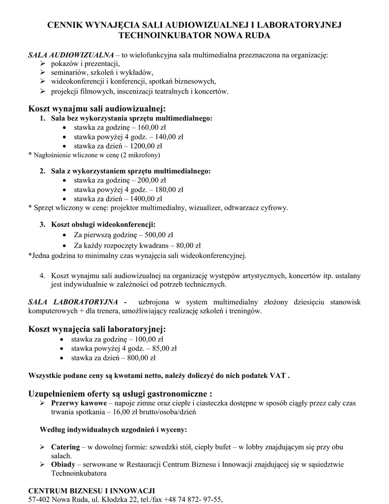 CENNIK WYNAJĘCIA SALI AUDIOWIZUALNEJ I LABORATORYJNEJ TECHNOINKUBATOR NOWA RUDA SALA AUDIOWIZUALNA – to wielofunkcyjna sala multimedialna przeznaczona na organizację: pokazów i prezentacji, seminariów, szkoleń i wykładów, wideokonferencji i konferencji, spotkań biznesowych, projekcji filmowych, inscenizacji teatralnych i koncertów. Koszt wynajmu sali audiowizualnej: 1. Sala bez wykorzystania sprzętu multimedialnego: stawka za godzinę – 160,00 zł stawka powyżej 4 godz. – 140,00 zł stawka za dzień – 1200,00 zł * Nagłośnienie wliczone w cenę (2 mikrofony) 2. Sala z wykorzystaniem sprzętu multimedialnego: stawka za godzinę – 200,00 zł stawka powyżej 4 godz. – 180,00 zł stawka za dzień – 1400,00 zł * Sprzęt wliczony w cenę: projektor multimedialny, wizualizer, odtwarzacz cyfrowy. 3. Koszt obsługi wideokonferencji: Za pierwszą godzinę – 500,00 zł Za każdy rozpoczęty kwadrans – 80,00 zł *Jedna godzina to minimalny czas wynajęcia sali wideokonferencyjnej. 4. Koszt wynajmu sali audiowizualnej na organizację występów artystycznych, koncertów itp. ustalany jest indywidualnie w zależności od potrzeb technicznych. SALA LABORATORYJNA uzbrojona w system multimedialny złożony dziesięciu stanowisk komputerowych + dla trenera, umożliwiający realizację szkoleń i treningów. Koszt wynajęcia sali laboratoryjnej: stawka za godzinę – 100,00 zł stawka powyżej 4 godz. – 85,00 zł stawka za dzień – 800,00 zł Wszystkie podane ceny są kwotami netto, należy doliczyć do nich podatek VAT . Uzupełnieniem oferty są usługi gastronomiczne : Przerwy kawowe – napoje zimne oraz ciepłe i ciasteczka dostępne w sposób ciągły przez cały czas trwania spotkania – 16,00 zł brutto/osoba/dzień Według indywidualnych uzgodnień i wyceny: Catering – w dowolnej formie: szwedzki stół, ciepły bufet – w lobby znajdującym się przy obu salach. Obiady – serwowane w Restauracji Centrum Biznesu i Innowacji znajdującej się w sąsiedztwie Technoinkubatora CENTRUM BIZNESU I INNOWACJI 57-402 Nowa Ruda, ul. Kłodzka 22, tel./fax +48 74 872- 97-55,