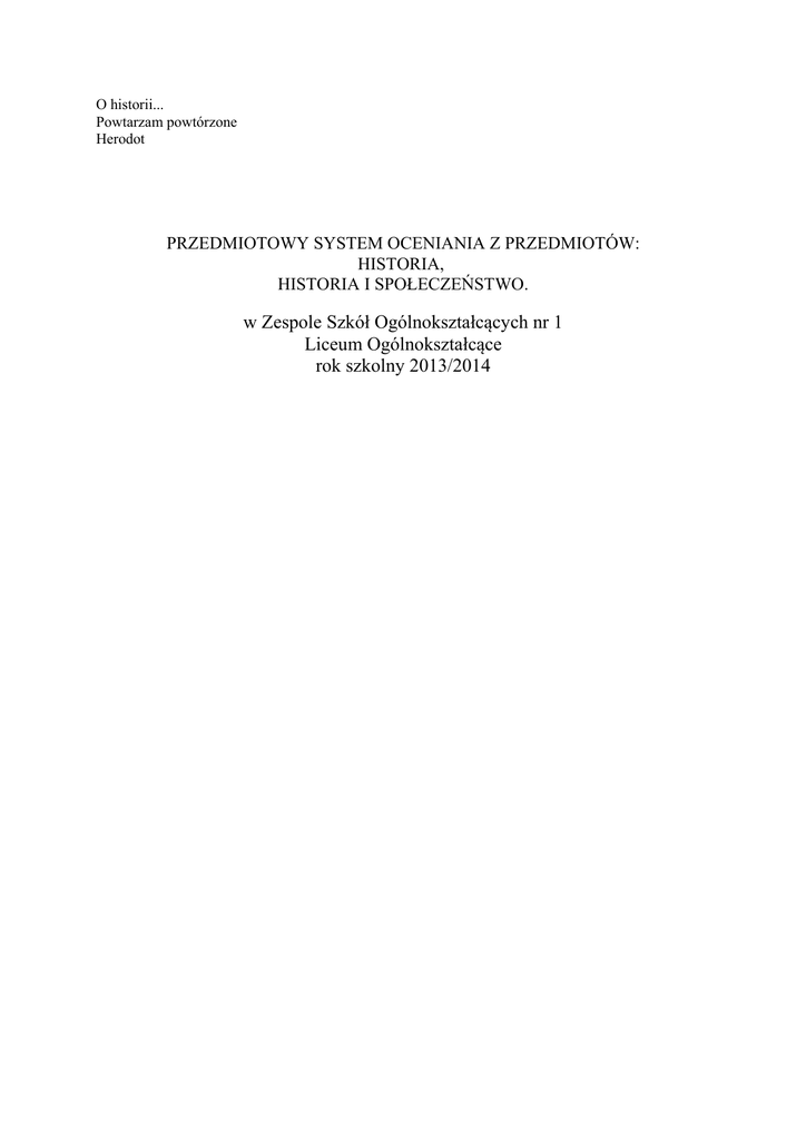 O historii... Powtarzam powtórzone Herodot PRZEDMIOTOWY SYSTEM OCENIANIA Z PRZEDMIOTÓW: HISTORIA, HISTORIA I SPOŁECZEŃSTWO. w Zespole Szkół Ogólnokształcących nr 1 Liceum Ogólnokształcące rok szkolny 2013/2014 Uzyskanie informacji o postępach ucznia stanowi integralną część procesu nauczania i uczenia się. . Pomiar osiągnięć uczniów odbywać się będzie według zasad pomiaru dydaktycznego przy zachowaniu zasad obiektywizmu, trafności, rzetelności i obiektywizmu punktowania za pomocą następujących narzędzi: 1. testów pisemnych z zadaniami : -otwartymi (rozprawki, krótkiej odpowiedzi, zadania z luką), -zamkniętymi (na dobieranie, wielokrotnego wyboru, prawda-fałsz); 2. materiałów źródłowych: -tekstów pisanych: narracyjnych i normatywnych, -ikonograficznych, -kartograficznych, -statystycznych; 3. krótkich sprawdzianów obejmujących treści z ostatnich trzech lekcji, 4. odpowiedzi ustnych – polegających na sprawdzeniu umiejętności ucznia w zakresie rozumienia problemu, związków przyczynowo-skutkowych, postaw i przekonań; 5. aktywności ucznia na lekcji (uczestnictwo w procesie dydaktycznym) 6. pracy w grupach (z uwzględnieniem samooceny ucznia); 7. prac długoterminowych (projektu, portfolio, recenzji lektury, sprawozdania z muzeum, wycieczki, kontaktów społecznych) i uczestnictwa w konkursach i olimpiadach przedmiotowych, KRYTERIA OCENY POSZCZEGÓLNYCH FORM AKTYWNOŚCI UCZNIA NA ZAJĘCIACH Z HISTORII i HISTORII I SPOŁECZEŃSTWA: Nauczanie historii obywa się na dwóch poziomach: podstawowym i rozszerzonym, przedmiot historia i społeczeństwo jest realizowany na poziomie podstawowym; poziom nauczania decyduje o doborze odpowiednich treści nauczania zgodnie z Podstawą programową. Ocenianie będzie dokonywane w oparciu o skalę obowiązującą w polskim systemie oświaty. Dopuszcza się stosowanie dodatkowych znaków plus(+) i minus (-) przy ocenach cząstkowych. Każdej ocenie odpowiada waga stopni w zależności od formy sprawdzania wiedzy i umiejętności uczniów. Ocenianie będzie jawne, a oceny uzasadnione. Kryteria oceniania i forma testu pisemnego będą omówione przed sprawdzianem, dotyczy to również innych narzędzi sprawdzających wiedzę i umiejętności ucznia np.: prac długoterminowych. I. Sprawdzian pisemny: -sprawdzian pisemny obejmujący dział materiału musi być zapowiedziany 2 tygodnie przed jego przeprowadzeniem. Uczniowie są zobowiązani do uczestniczenia w sprawdzianie w określonym (ustalonym wspólnie) dniu. Nieobecność na sprawdzianie może być usprawiedliwiona chorobą ucznia potwierdzoną przez lekarza lub rodziców. Jeżeli z przyczyn losowych uczeń nie może pisać sprawdzianu z całą klasą, powinien to uczynić w ciągu dwóch tygodni od pierwszej daty sprawdzianu, w terminie uzgodnionym z nauczycielem. Poprawa oceny niedostatecznej ze sprawdzianu jest dobrowolna, musi odbywać się poza lekcjami historii, w czasie wyznaczonym przez nauczyciela. Podczas konstruowania zadań testowych będą uwzględnione wszystkie poziomy wymagań. W zależności od zdobytych punktów uczniowie otrzymają następujące oceny: Celująca 91 + 100% + zadania dodatkowe z materiału wykraczającego poza program Bardzo dobra 91-100% Dobra 71-90% Dostateczna 51-70% Dopuszczająca 40-50% 2. Teksty źródłowe, źródła kartograficzne, ikonograficzne i statystyczne: -umiejętność analizy wymienionych źródeł informacji historycznej poprzez udzielenie odpowiedzi na postawione pytania. 3.Krótkie sprawdziany: -sprawdziany 10-15 minutowe są obowiązkowe, mogą być niezapowiedziane, zakres treści tych sprawdzianów obejmuje trzy ostatnie lekcje. 4. Odpowiedzi ustne: -zakres materiału obejmuje trzy ostatnie lekcje, -na ocenę odpowiedzi ustnej składa się zawartość merytoryczna, argumentacja, wyrażanie sądów, stawianie hipotez, uzasadnianie, stosowanie języka historycznego, sposobów prezentacji czyli umiejętność formułowania myśli; dodatkowe pytania naprowadzające wpływają na obniżenie oceny. 5. Aktywność ucznia na lekcji: -uczeń szczególnie zaangażowany podczas lekcji otrzymuje plus (+), uzyskanie pięciu plusów skutkuje wpisaniem do dziennika oceny bardzo dobrej, za bierną postawę w czasie lekcji, brak uwagi uczeń może otrzymać minus (-), pięć minusów skutkuje wpisaniem do dziennika oceny niedostatecznej. 6. Praca w grupach: -praca w grupach polega na efektywnym współdziałaniu w zespole, planowaniu i ocenianiu własnego uczenia się, skutecznym porozumiewaniu się w różnych sytuacjach, rozwiązywaniu problemów w twórczy sposób oraz efektywnym posługiwaniu się technologia informacyjną. Praca ucznia jest oceniana przez nauczyciela nadzorującego i sprawdzającego prace grupy, przy uwzględnieniu następujących faz: -zaangażowanie, -badanie, -przekształcanie, -prezentacja. 7. Prace długoterminowe: Podczas oceny tego typu prac nauczyciel oceniający przyjmuje następujące kryteria: -dobór źródeł informacji, -stopień opracowania informacji, -wykonywanie zadań zgodnie z ustalonym harmonogramem, -merytoryczna wartość prezentacji, -organizacja pracy, -oryginalność prezentacji, Ponadto ocenie podlegają osiągnięcia w olimpiadach przedmiotowych , za tytuł laureata lub finalisty uczeń otrzymuje ocenę celującą na zakończenie roku szkolnego. Waga poszczególnych form sprawdzania wiedzy i umiejętności uczniów: Prace klasowe, sprawdziany- 5 Olimpiady i konkursy (laureaci i finaliści zawodów ogólnopolskich i wojewódzkich) 5 Konkursy historyczne (międzyszkolne i szkolne) - 4 Poprawa pisemnych prac- 3 Odpowiedź ustna, kartkówka- 2 Wypracowanie, zadanie domowe, prezentacje, aktywność- 1 Ocen roczna I i II (maturzyści) - 1 System oceny tzw. Średniej ważonej nie obejmuje form sprawdzania wiedzy i umiejętności, za które przewidziano ocenę punktową (np.: test diagnozujący, zaliczenie epoki (maturzyści zdający maturę z historii) matura próbna (zewn