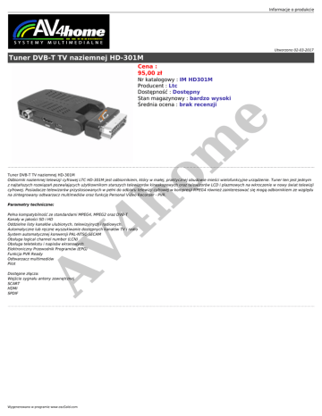 Informacje o produkcie Utworzono 02-03-2017 Tuner DVB-T TV naziemnej HD-301M Cena : 95,00 zł om e Nr katalogowy : IM HD301M Producent : Ltc Dostępność : Dostępny Stan magazynowy : bardzo wysoki Średnia ocena : brak recenzji Parametry techniczne: 4h Tuner DVB-T TV naziemnej HD-301M Odbiornik naziemnej telewizji cyfrowej LTC HD-301M jest odbiornikiem, który w małej, praktycznej obudowie mieści wielofunkcyjne urządzenie. Tuner ten jest jednym z najtańszych rozwiązań pozwalających użytkownikom starszych telewizorów kineskopowych oraz telewizorów LCD i plazmowych na wkroczenie w nowy świat telewizji cyfrowej. Posiadacze telewizorów przystosowanych w pełni do odbioru telewizji cyfrowej w kompresji MPEG4 również zainteresować się mogą odbiornikiem ze względu na zintegrowany odtwarzacz multimediów oraz funkcję Personal Video Recorder - PVR. AV Pełna kompatybilność ze standardami MPEG4, MPEG2 oraz DVB-T Kanały w jakości SD i HD Oddzielne listy kanałów ulubionych, telewizyjnych i radiowych. Automatyczne lub ręczne wyszukiwanie dostępnych kanałów TV i radio System automatycznej konwersji PAL-NTSC-SECAM Obsługa logical channel number (LCN) Obsługa teletekstu i napisów ekranowych Elektroniczny Przewodnik Programów (EPG) Funkcja PVR Ready Odtwarzacz multimediów Pilot Dostępne złącza: Wejście sygnału anteny zewnętrznej SCART HDMI SPDIF Wygenerowano w programie www.oscGold.com