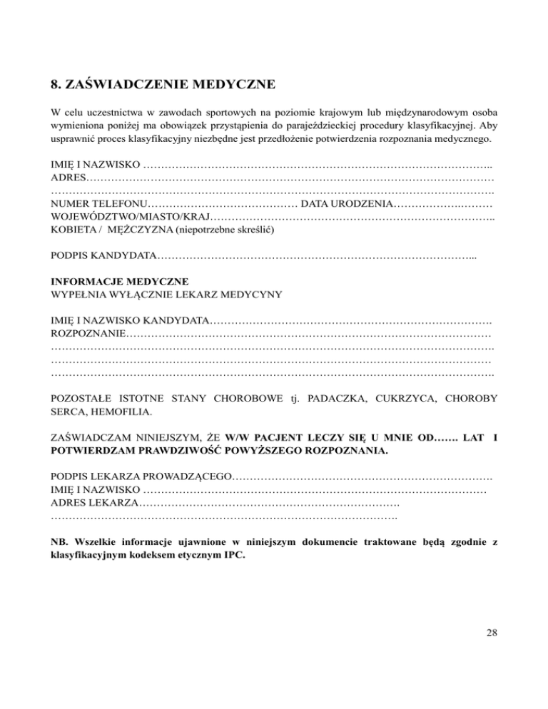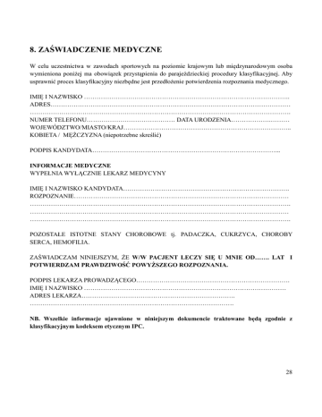8. ZAŚWIADCZENIE MEDYCZNE W celu uczestnictwa w zawodach sportowych na poziomie krajowym lub międzynarodowym osoba wymieniona poniżej ma obowiązek przystąpienia do parajeździeckiej procedury klasyfikacyjnej. Aby usprawnić proces klasyfikacyjny niezbędne jest przedłożenie potwierdzenia rozpoznania medycznego. IMIĘ I NAZWISKO …………………………………………………………………………………….. ADRES…………………………………………………………………………………………………… ……………………………………………………………………………………………………………. NUMER TELEFONU…………………………………… DATA URODZENIA……………….……… WOJEWÓDZTWO/MIASTO/KRAJ…………………………………………………………………….. KOBIETA / MĘŻCZYZNA (niepotrzebne skreślić) PODPIS KANDYDATA……………………………………………………………………………... INFORMACJE MEDYCZNE WYPEŁNIA WYŁĄCZNIE LEKARZ MEDYCYNY IMIĘ I NAZWISKO KANDYDATA……………………………………………………………………. ROZPOZNANIE………………………………………………………………………………………… ……………………………………………………………………………………………………………. …………………………………………………………………………………………………………… ……………………………………………………………………………………………………………. POZOSTAŁE ISTOTNE STANY CHOROBOWE tj. PADACZKA, CUKRZYCA, CHOROBY SERCA, HEMOFILIA. ZAŚWIADCZAM NINIEJSZYM, ŻE W/W PACJENT LECZY SIĘ U MNIE OD……. LAT I POTWIERDZAM PRAWDZIWOŚĆ POWYŻSZEGO ROZPOZNANIA. PODPIS LEKARZA PROWADZĄCEGO………………………………………………………………. IMIĘ I NAZWISKO …………………………………………………………………………………… ADRES LEKARZA………………………………………………………………. ……………………………………………………………………………………. NB. Wszelkie informacje ujawnione w niniejszym dokumencie traktowane będą zgodnie z klasyfikacyjnym kodeksem etycznym IPC. 28 Poniższe wskazówki mogą zostać przekazane lekarzowi: Informacje diagnostyczne Klasyfikacji Parajeździeckiej Informacje medyczne są potrzebne po to, aby sklasyfikować jeźdźca do zawodów międzynarodowych. Informacje medyczna powinna zawierać wyniki testów, potwierdzających to, że sportowiec przeszedł przez badanie swojego stanu zdrowia, na który wpływają dane symptomy chorobowe etc. Przykład 1: Osoba ze stwardnieniem rozsianym będzie musiała przejść podczas badań przez testy takie jak skany MRI, po to aby znaleźć przyczynę takiego stanu rzeczy. Wyniki testów oraz opinia od neurologa są niezbędne w informacji diagnostycznej. Przykład 2: Gdy uszkodzone są nerwy obwodowe, wtedy dochodzi do osłabienia mięśni bądź paraliżu. Konieczne jest więc dostarczenie wyników badania przewodnictwa nerwowego oraz diagnozy opartej na tym badaniu, sporządzonej przez neurologa lub neurofizjologa. Nie wymaga się dostarczenia listu stwierdzającego takie objawy jak ból, osłabienie, brak czucia, niezdolność do chodzenia lub niemożliwość wykonywania pewnych czynności itd. Ograniczenia te są wykazywane podczas tekstu ławkowego w Klasyfikacji Parajeździeckiej oraz podczas jazdy. Dla klasyfikacji międzynarodowej informacje te, powinny być przedstawione w języku angielskim. 29