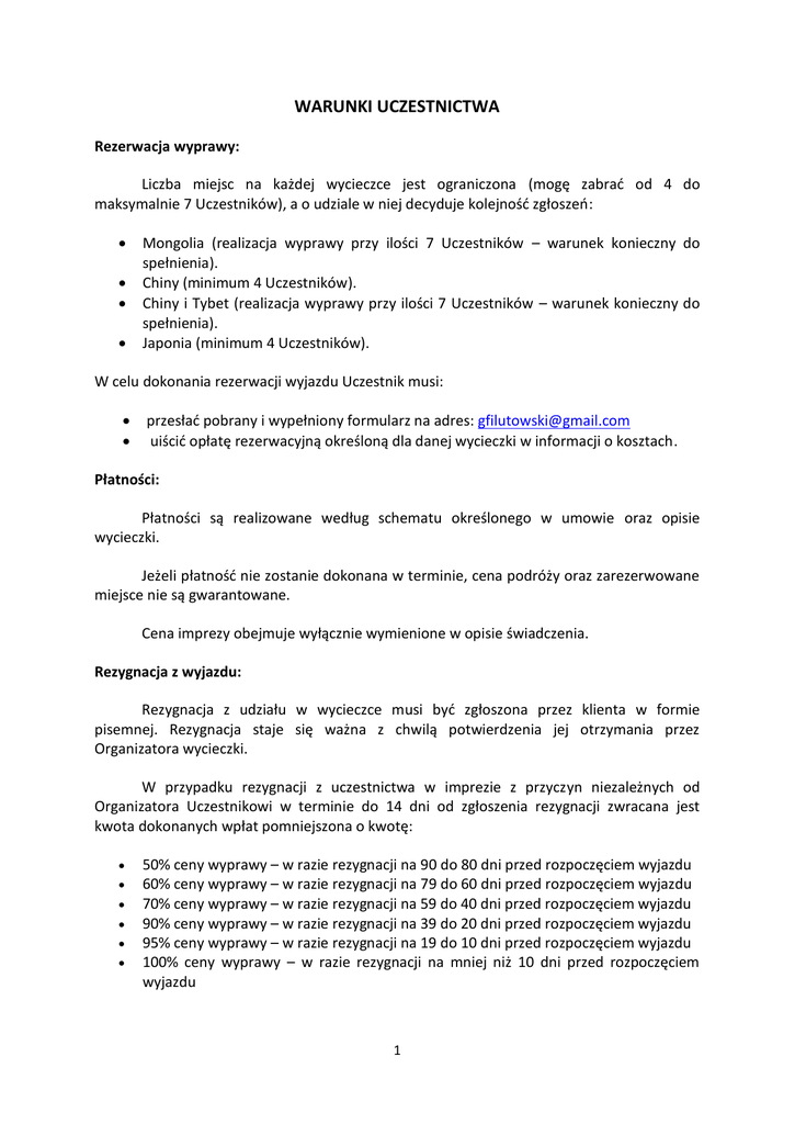 WARUNKI UCZESTNICTWA Rezerwacja wyprawy: Liczba miejsc na każdej wycieczce jest ograniczona (mogę zabrać od 4 do maksymalnie 7 Uczestników), a o udziale w niej decyduje kolejność zgłoszeń: Mongolia (realizacja wyprawy przy ilości 7 Uczestników – warunek konieczny do spełnienia). Chiny (minimum 4 Uczestników). Chiny i Tybet (realizacja wyprawy przy ilości 7 Uczestników – warunek konieczny do spełnienia). Japonia (minimum 4 Uczestników). W celu dokonania rezerwacji wyjazdu Uczestnik musi: przesłać pobrany i wypełniony formularz na adres: [email protected] uiścić opłatę rezerwacyjną określoną dla danej wycieczki w informacji o kosztach. Płatności: Płatności są realizowane według schematu określonego w umowie oraz opisie wycieczki. Jeżeli płatność nie zostanie dokonana w terminie, cena podróży oraz zarezerwowane miejsce nie są gwarantowane. Cena imprezy obejmuje wyłącznie wymienione w opisie świadczenia. Rezygnacja z wyjazdu: Rezygnacja z udziału w wycieczce musi być zgłoszona przez klienta w formie pisemnej. Rezygnacja staje się ważna z chwilą potwierdzenia jej otrzymania przez Organizatora wycieczki. W przypadku rezygnacji z uczestnictwa w imprezie z przyczyn niezależnych od Organizatora Uczestnikowi w terminie do 14 dni od zgłoszenia rezygnacji zwracana jest kwota dokonanych wpłat pomniejszona o kwotę: 50% ceny wyprawy – w razie rezygnacji na 90 do 80 dni przed rozpoczęciem wyjazdu 60% ceny wyprawy – w razie rezygnacji na 79 do 60 dni przed rozpoczęciem wyjazdu 70% ceny wyprawy – w razie rezygnacji na 59 do 40 dni przed rozpoczęciem wyjazdu 90% ceny wyprawy – w razie rezygnacji na 39 do 20 dni przed rozpoczęciem wyjazdu 95% ceny wyprawy – w razie rezygnacji na 19 do 10 dni przed rozpoczęciem wyjazdu 100% ceny wyprawy – w razie rezygnacji na mniej niż 10 dni przed rozpoczęciem wyjazdu 1 Dokumenty podróżne: Organizator w opisie wyjazdu informuje o dokumentach niezbędnych do udziału w wycieczce. Uczestnicy wycieczki muszą posiadać ważny paszport oraz niezbędne wizy. Paszport musi być ważny minimum 6 miesięcy od daty powrotu z wycieczki. Zalecane jest posiadanie przynajmniej jednej kopii dokumentu. Uczestnik wyjazdu zobligowany jest do wzięcia pełnej odpowiedzialność za uzyskanie wszystkich wymaganych dokumentów i jest odpowiedzialny za jakiekolwiek konsekwencje wynikające z ich braku lub wad prawnych. Informacje o podróży: Wszelkie Informacje dodatkowe o podróży takie jak lista rzeczy sugerowanych do zabrania zostaną poruszone na wspólnym spotkaniu zorganizowanym w Warszawie najpóźniej na tydzień przed datą wyjazdu. Na tym spotkaniu wszyscy Uczestnicy będą mieli okazję wspólnie się poznać. Osoby, dla których przyjazd na spotkanie będzie niemożliwy proponuję „spotkanie” poprzez komunikator skype. Informacje zdrowotne: Wycieczka przeznaczona jest dla osób będących w dobrym stanie zdrowia. Nie ponosimy żadnej odpowiedzialności z tytułu ewentualnych powikłań zdrowotnych związanych z udziałem w proponowanym wyjeździe. 2