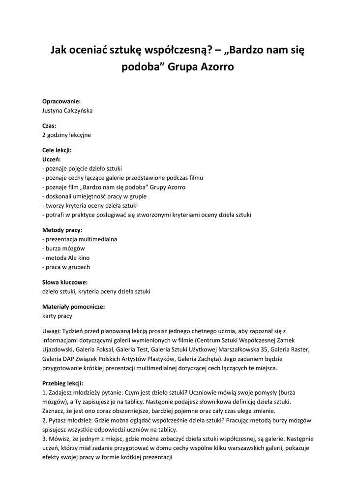 Jak oceniać sztukę współczesną? – „Bardzo nam się podoba” Grupa Azorro Opracowanie: Justyna Całczyńska Czas: 2 godziny lekcyjne Cele lekcji: Uczeń: - poznaje pojęcie dzieło sztuki - poznaje cechy łączące galerie przedstawione podczas filmu - poznaje film „Bardzo nam się podoba” Grupy Azorro - doskonali umiejętność pracy w grupie - tworzy kryteria oceny dzieła sztuki - potrafi w praktyce posługiwać się stworzonymi kryteriami oceny dzieła sztuki Metody pracy: - prezentacja multimedialna - burza mózgów - metoda Ale kino - praca w grupach Słowa kluczowe: dzieło sztuki, kryteria oceny dzieła sztuki Materiały pomocnicze: karty pracy Uwagi: Tydzień przed planowaną lekcją prosisz jednego chętnego ucznia, aby zapoznał się z informacjami dotyczącymi galerii wymienionych w filmie (Centrum Sztuki Współczesnej Zamek Ujazdowski, Galeria Foksal, Galeria Test, Galeria Sztuki Użytkowej Marszałkowska 35, Galeria Raster, Galeria DAP Związek Polskich Artystów Plastyków, Galeria Zachęta). Jego zadaniem będzie przygotowanie krótkiej prezentacji multimedialnej dotyczącej cech łączących te miejsca. Przebieg lekcji: 1. Zadajesz młodzieży pytanie: Czym jest dzieło sztuki? Uczniowie mówią swoje pomysły (burza mózgów), a Ty zapisujesz je na tablicy. Następnie podajesz słownikowa definicję dzieła sztuki. Zaznacz, że jest ono coraz obszerniejsze, bardziej pojemne oraz cały czas ulega zmianie. 2. Pytasz młodzież: Gdzie można oglądać współcześnie dzieła sztuki? Pracując metodą burzy mózgów spisujesz wszystkie odpowiedzi uczniów na tablicy. 3. Mówisz, że jednym z miejsc, gdzie można zobaczyć dzieła sztuki współczesnej, są galerie. Następnie uczeń, którzy miał zadanie przygotować w domu cechy wspólne kilku warszawskich galerii, pokazuje efekty swojej pracy w formie krótkiej prezentacji multimedialnej. 4. Rozdajesz karty pracy Ale kino (zał. 1). Młodzież wypełnia je po obejrzeniu filmu, jednak wręczasz je wcześniej, aby pytania nie były zaskakujące. 5. Projekcja filmu „Bardzo nam się podoba” Grupy Azorro (film dostępny online na stronie Filmoteki Muzeum Sztuki Nowoczesnej w Warszawie: http://artmuseum.pl/filmoteka/?l=0&id=1297) 6. Uczniowie wypełniają karty pracy i prezentują odpowiedzi na poszczególne pytania. 7. Rozmawiasz z uczniami zadając im następujące pytania: · Z czego wynika ironia zawarta w filmie? · Jakie są, według Was, powody ograniczenia oceny dzieł sztuki jedynie do kilku zwrotów? · Co jest potrzebne, aby móc się wypowiedzieć na dany temat? · Na czym polega uniwersalizm tego filmu? Czy można go odnieść do różnych dzieł sztuki współczesnej? 8. Dzielisz klasę na 6 grup i rozdajesz karty pracy (zał. 2). Głównym zadaniem uczniów jest stworzenie kryteriów oceny sztuki współczesnej. 9. Młodzież prezentuje efekty pracy. Spisuje swoje pomysły, a każda następna grupa uzupełnia je o nowe, wcześniej nie wymienione. 10. Podsumowanie: Rozdajesz uczniom karteczki samoprzylepne. Każdy z nich ma za zadanie ocenić obejrzany film posługując się jednym z nowych kryteriów. Następnie przyklejają karteczki na tablicę, a Ty czytasz wszystkie wypowiedzi, kontrolując wraz z młodzieżą, czy zostały zastosowane stworzone w grupach wytyczne. Praca domowa: Wybierz dowolne dzieło sztuki współczesnej (obraz, film, utwór muzyczny, performance, body art itd.) i oceń je, posługując się kryteriami ustalonymi podczas pracy w klasie. Materiały pomocnicze: Załącznik 1 Karta pracy Odpowiedz na pytania: 1. Jakie uczucia towarzyszyły Ci w trakcie oglądania filmu? …………………………………………………………………………………………………………… …………………………………………………………………………………………………………… …………………………………………………………………………………………………………… 2. Co Ci się podobało najbardziej? …………………………………………………………………………………………………………… …………………………………………………………………………………………………………… …………………………………………………………………………………………………………… 3. Co Cię zdenerwowało? …………………………………………………………………………………………………………… …………………………………………………………………………………………………………… …………………………………………………………………………………………………………… 4. Jaka scena utkwiła Ci w pamięci najbardziej? …………………………………………………………………………………………………………… …………………………………………………………………………………………………………… …………………………………………………………………………………………………………… 5. Jak zachowywali się mężczyźni odwiedzający warszawskie galerie? …………………………………………………………………………………………………………… …………………………………………………………………………………………………………… …………………………………………………………………………………………………………… 6. Jak nazwałbyś problem, który jest ukazany w filmie? …………………………………………………………………………………………………………… …………………………………………………………………………………………………………