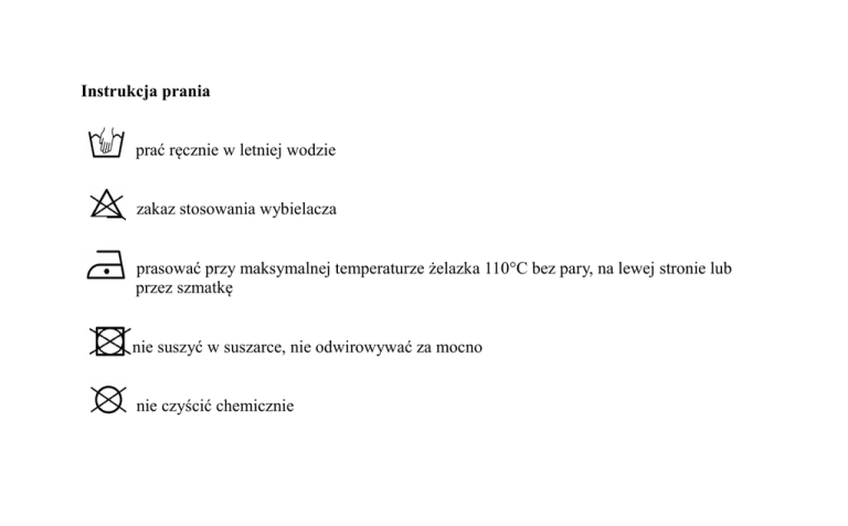 Instrukcja prania prać ręcznie w letniej wodzie zakaz stosowania wybielacza prasować przy maksymalnej temperaturze żelazka 110°C bez pary, na lewej stronie lub przez szmatkę nie suszyć w suszarce, nie odwirowywać za mocno nie czyścić chemicznie