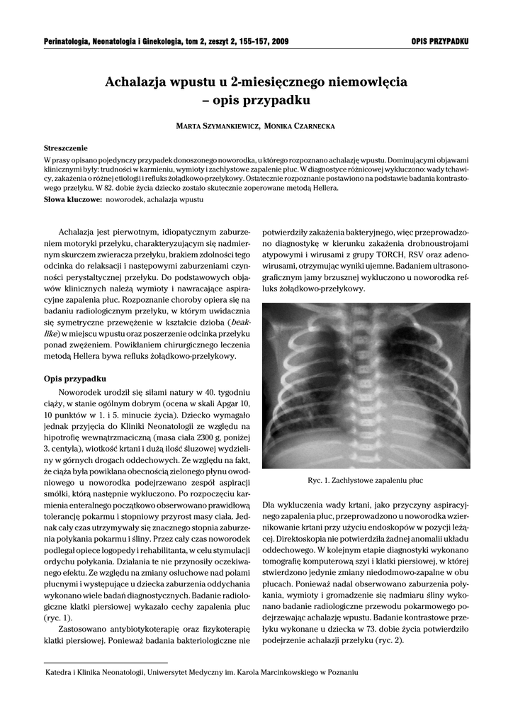 Perinatologia, Neonatologia i Ginekologia, tom 2, zeszyt 2, 155-157, 2009 OPIS PRZYPADKU Achalazja wpustu u 2-miesięcznego niemowlęcia – opis przypadku MARTA SZYMANKIEWICZ, MONIKA CZARNECKA Streszczenie W prasy opisano pojedynczy przypadek donoszonego noworodka, u którego rozpoznano achalazję wpustu. Dominującymi objawami klinicznymi były: trudności w karmieniu, wymioty i zachłystowe zapalenie płuc. W diagnostyce różnicowej wykluczono: wady tchawicy, zakażenia o różnej etiologii i refluks żołądkowo-przełykowy. Ostatecznie rozpoznanie postawiono na podstawie badania kontrastowego przełyku. W 82. dobie życia dziecko zostało skutecznie zoperowane metodą Hellera. Słowa kluczowe: noworodek, achalazja wpustu Achalazja jest pierwotnym, idiopatycznym zaburzeniem motoryki przełyku, charakteryzującym się nadmiernym skurczem zwieracza przełyku, brakiem zdolności tego odcinka do relaksacji i następowymi zaburzeniami czynności perystaltycznej przełyku. Do podstawowych objawów klinicznych należą wymioty i nawracające aspiracyjne zapalenia płuc. Rozpoznanie choroby opiera się na badaniu radiologicznym przełyku, w którym uwidacznia się symetryczne przewężenie w kształcie dzioba (beaklike) w miejscu wpustu oraz poszerzenie odcinka przełyku ponad zwężeniem. Powikłaniem chirurgicznego leczenia metodą Hellera bywa refluks żołądkowo-przelykowy. potwierdziły zakażenia bakteryjnego, więc przeprowadzono diagnostykę w kierunku zakażenia drobnoustrojami atypowymi i wirusami z grupy TORCH, RSV oraz adenowirusami, otrzymując wyniki ujemne. Badaniem ultrasonograficznym jamy brzusznej wykluczono u noworodka refluks żołądkowo-przełykowy. Opis przypadku Noworodek urodził się siłami natury w 40. tygodniu ciąży, w stanie ogólnym dobrym (ocena w skali Apgar 10, 10 punktów w 1. i 5. minucie życia). Dziecko wymagało jednak przyjęcia do Kliniki Neonatologii ze względu na hipotrofię wewnątrzmaciczną (masa ciała 2300 g, poniżej 3. centyla), wiotkość krtani i dużą ilość śluzowej wydzieliny w górnych drogach oddechowych. Ze względu na fakt, że ciąża była powikłana obecnością zielonego płynu owodniowego u noworodka podejrzewano zespół aspiracji smółki, którą następnie wykluczono. Po rozpoczęciu karmienia enteralnego początkowo obserwowano prawidłową tolerancję pokarmu i stopniowy przyrost masy ciała. Jednak cały czas utrzymywały się znacznego stopnia zaburzenia połykania pokarmu i śliny. Przez cały czas noworodek podlegał opiece logopedy i rehabilitanta, w celu stymulacji ordychu połykania. Działania te nie przynosiły oczekiwanego efektu. Ze względu na zmiany osłuchowe nad polami płucnymi i występujące u dziecka zaburzenia oddychania wykonano wiele badań diagnostycznych. Badanie radiologiczne klatki piersiowej wykazało cechy zapalenia płuc (ryc. 1). Zastosowano antybiotykoterapię oraz fizykoterapię klatki piersiowej. Ponieważ badania bakteriologiczne nie Ryc. 1. Zachłystowe zapaleniu płuc Dla wykluczenia wady krtani, jako przyczyny aspiracyjnego zapalenia płuc, przeprowadzono u noworodka wziernikowanie krtani przy użyciu endoskopów w pozycji leżącej. Direktoskopia nie potwierdziła żadnej anomalii układu oddechowego. W kolejnym etapie diagnostyki wykonano tomografię komputerową szyi i klatki piersiowej, w której stwierdzono jedynie zmiany niedodmowo-zapalne w obu płucach. Ponieważ nadal obserwowano zaburzenia połykania, wymioty i gromadzenie się nadmiaru śliny wykonano badanie radiologiczne przewodu pokarmowego podejrzewając achalazję wpustu. Badanie kontrastowe przełyku wykonane u dziecka w 73. dobie życia potwierdziło podejrzenie achalazji przełyku (ryc. 2). Katedra i Klinika Neonatologii, Uniwersytet Medyczny im. Karola Marcinkowskiego w Poznaniu 156 M. Szymankiewicz, M. Czarnecka Ryc. 2. Badanie kontrastowe przełyku – widoczne obkurczenie wpustu wraz z poszerzeniem przełyku Po konsultacji chirurgicznej dziecko zostało zakwalifikowane do leczenia operacyjnego. W 81. dobie życia wykonano myotomię podłużną okolicy nadwpustowej przełyku sposobem Hellera, to jest wycięto podłużne pasmo warstwy mięśniowej okrężnej w okolicy wpustu, powodując tym samym jego poszerzenie. Jest to metoda powszechnie zaakceptowana w leczeniu achalazji [1]. Po ponownym rozpoczęciu karmienia enteralnego obserwowano istotną poprawę w zakresie połykania i zmniejszenia zalegania śliny w jamie ustnej. W czasie dalszego pobytu w Klinice Neonatologii nie obserwowano cech refluksu żołąkowo-przełykowego. W 86. dobie życia dziecko w stanie ogólnym dobrym, karmione smoczkiem, z masą ciała 3190 g, zostało zwolnione do domu z zaleceniem dalszego leczenia ambulatoryjnego. Dyskusja Achalazja wpustu jest jednostką chorobową opisywana głównie u młodzieży i dorosłych, typowy początek choroby przypada między 20. a 40. rokiem życia [2]. Dzieci , u których rozpoznano achalazję wpustu poniżej 4. roku życia stanowią 5% chorych [3], a już w skrajnie rzadkich sytuacjach rozpoznanie to dotyczy noworodków [4]. Istotą choroby jest braku rozkurczu dolnego zwieracza przełyku podczas połykania, co prowadzi do poszerzenia przełyku i cofania się pokarmu. Przyczyną nadmiernego napięcia zwieracza wpustu jest zmniejszoną ilość komórek zwojowych w tej okolicy, a w badaniu histologicznym stwierdza się również dużą liczbę komórek zapalnych [3]. Do objawów klinicznych zalicza się przede wszystkim zaburzenia połykania, ulewania pokarmu, kaszel spowodowany przedostawaniem się pokarmu do tchawicy oraz niedobór masy ciała. Wszystkie te objawy stwierdzano u noworodka opisanego powyżej, stąd po szeregu innych, typowych dla okresu noworodkowego badań diagnostycznych wysnuto podejrzenie achalazji wpustu. Pomiar ciśnienia śródprzełykowego może dostarczyć istotnych informacji na temat dysfunkcji czynnościowej przełyku, jednak z przyczyn technicznych jest trudne do przep