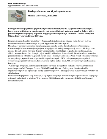 www.inowroclaw.pl Wygenerowano: 2017-03-02/13:30:49 Biodegradowane worki już są testowane Monika Dąbrowska, 29.10.2010 Biodegradowane pojemniki pojawiły się w mieszkaniach przy ul. Zygmunta Wilkońskiego 42. Inowrocław jest jedynym miastem na terenie województwa, i jednym z trzech w Polsce, który prowadzi system segregacji odpadów ulegających biodegradacji „u źródła" - mówi Prezydent Miasta Inowrocławia Ryszard Brejza. Program ten ma charakter pilotażowy. Rozpoczął się tydzień temu i jak na razie dotyczy jedynie lokatorów budynku komunalnego przy ul. Zygmunta Wilkońskiego 42. Mieszkańcy zostali wyposażeni bezpłatnie przez miejską spółkę Przedsiębiorstwo Gospodarki Komunalnej i Mieszkaniowej w specjalne, ulegające całkowitej biodegradacji, worki „BioBag" oraz zielone do nich kosze. Powinni do nich wrzucać jednie resztki tego co pochodzi z jedzenia, m.in. obierki warzyw i owoców, skorupki jajek, torebki od herbaty, drobne kości. Worki te nie są natomiast przeznaczone dla odpadów tj. popiół, metal, szkło i tworzywa sztuczne. Pełen worek lokatorzy wrzucają do specjalnego pojemnika do odpadów biodegradowalnych „BIO", zakupionego przez spółkę i wystawionego przed budynkiem. Ich zawartość będzie trafiać na ZUOK i wykorzystywana będzie na kompost. - Celem tego programu jest obniżenie kosztów wywozu nieczystości stałych i ochrona środowiska naturalnego - mówi Zastępca Prezesa PGKiM Marek Gerus. - Selektywna zbiórka odpadów organicznych pozwoli ograniczyć koszty odbioru odpadów i zmniejszy ilość składowanych odpadów na składowisku. Pilotażowa akcja potrwa trzy miesiące, a jej wynik zdecyduje o ewentualnym wprowadzeniu segregacji w innych budynkach w mieście. W tej sprawie PGKiM prowadzi rozmowy z KSM i wspólnotami mieszkaniowymi. Wykonanie: CONCEPT Intermedia www.concept.net.pl Strona 1/1
