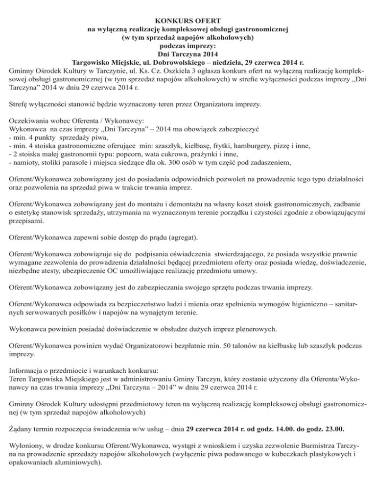KONKURS OFERT na wyłączną realizację kompleksowej obsługi gastronomicznej (w tym sprzedaż napojów alkoholowych) podczas imprezy: Dni Tarczyna 2014 Targowisko Miejskie, ul. Dobrowolskiego – niedziela, 29 czerwca 2014 r. Gminny Ośrodek Kultury w Tarczynie, ul. Ks. Cz. Oszkiela 3 ogłasza konkurs ofert na wyłączną realizację kompleksowej obsługi gastronomicznej (w tym sprzedaż napojów alkoholowych) w strefie wyłączności podczas imprezy „Dni Tarczyna” 2014 w dniu 29 czerwca 2014 r. Strefę wyłączności stanowić będzie wyznaczony teren przez Organizatora imprezy. Oczekiwania wobec Oferenta / Wykonawcy: Wykonawca na czas imprezy „Dni Tarczyna” – 2014 ma obowiązek zabezpieczyć - min. 4 punkty sprzedaży piwa, - min. 4 stoiska gastronomiczne oferujące min: szaszłyk, kiełbasę, frytki, hamburgery, pizzę i inne, - 2 stoiska małej gastronomii typu: popcorn, wata cukrowa, prażynki i inne, - namioty, stoliki parasole i miejsca siedzące dla ok. 300 osób w tym część pod zadaszeniem, Oferent/Wykonawca zobowiązany jest do posiadania odpowiednich pozwoleń na prowadzenie tego typu działalności oraz pozwolenia na sprzedaż piwa w trakcie trwania imprez. Oferent/Wykonawca zobowiązany jest do montażu i demontażu na własny koszt stoisk gastronomicznych, zadbanie o estetykę stanowisk sprzedaży, utrzymania na wyznaczonym terenie porządku i czystości zgodnie z obowiązującymi przepisami. Oferent/Wykonawca zapewni sobie dostęp do prądu (agregat). Oferent/Wykonawca zobowiązuje się do podpisania oświadczenia stwierdzającego, że posiada wszystkie prawnie wymagane zezwolenia do prowadzenia działalności będącej przedmiotem oferty oraz posiada wiedzę, doświadczenie, niezbędne atesty, ubezpieczenie OC umożliwiające realizację przedmiotu umowy. Oferent/Wykonawca zobowiązany jest do zabezpieczania swojego sprzętu podczas trwania imprezy. Oferent/Wykonawca odpowiada za bezpieczeństwo ludzi i mienia oraz spełnienia wymogów higieniczno – sanitarnych serwowanych posiłków i napojów na wynajętym terenie. Wykonawca powinien posiadać doświadczenie w obsłudze dużych imprez plenerowych. Oferent/Wykonawca powinien wydać Organizatorowi bezpłatnie min. 50 talonów na kiełbaskę lub szaszłyk podczas imprezy. Informacja o przedmiocie i warunkach konkursu: Teren Targowiska Miejskiego jest w administrowaniu Gminy Tarczyn, który zostanie użyczony dla Oferenta/Wykonawcy na czas trwania imprezy „Dni Tarczyna – 2014” w dniu 29 czerwca 2014 r. Gminny Ośrodek Kultury udostępni przedmiotowy teren na wyłączną realizację kompleksowej obsługi gastronomicznej (w tym sprzedaż napojów alkoholowych) Żądany termin rozpoczęcia świadczenia w/w usług – dnia 29 czerwca 2014 r. od godz. 14.00. do godz. 23.00. Wyłoniony, w drodze konkursu Oferent/Wykonawca, wystąpi z wnioskiem i uzyska zezwolenie Burmistrza Tarczyna na prowadzenie sprzedaży napojów alkoholowych (wyłącznie piwa podawanego w kubeczkach plastykowych i opakowaniach aluminiowych). Bez zgody wyłonionego oferenta na terenie wskazanym powyżej nie ma nikt inny zgody na realizację kompleksowej obsługi gastronomicznej (w tym sprzedaż napojów alkoholowych). Zalecane jest, wcześniejsze zapoznanie się z terenem i planem lokalizacji punktów gastronomicznych. Szczegółowe warunki realizacji zamierzenia określi umowa spisana z Oferentem/Wykonawcą, który wygra konkurs ofert. Pozostałe informacje: Oferty należy składać do dnia 4 czerwca 2014 r. do godz. 15:00 w zamkniętych kopertach na adres Gminny Ośrodek Kultury, ul. J. Stępkowskiego 17, 05-555 Tarczyn lub w biurze Ośrodka (adres, jak wyżej) z dopiskiem „Dni Tarczyna 2014” Ponadto na kopercie należy podać nazwę i dokładny adres wraz z numerami telefonów i adresami e-mailowymi. Oferta powinna zawierać: a) nazwę firmy, adres, NIP, telefon, b) rodzaj asortymentu, c) ilość stanowisk gastronomicznych d) ilość zabezpieczonych miejsc dla uczestników imprezy, e) cennik menu f) oświadczenia o: - posiadaniu przez Oferenta stosownych uprawnień do prowadzenia działalności gastronomicznej zgodnie z wymogami ustawowymi, - posiadaniu niezbędnej wiedzy i doświadczenia oraz dysponowaniu przez Oferenta potencjału technicznego i osobowego zdolnego do obsługi wyłączności handlowej, - sytuacji ekonomicznej i finansowej zapewniającej przyjęcie i realizację obsługi gastronomicznej (w tym sprzedaż napojów alkoholowych) przez Oferenta. O wyborze oferty zadecyduje Komisja powołana przez Dyrektora GOK, biorąc pod uwagę przedstawiony w ofercie zakres świadczonych usług oraz zadeklarowaną kwotę. Rozstrzygnięcie konkursu ofert nastąpi w terminie do dnia 5 czerwca 2014r. Organizator przewiduje zawrzeć umowę w terminie do dnia 9 czerwca 2014 r. z Oferentem/Wykonawcą, który złożył najkorzystniejszą ofertę. Zadeklarowaną kwotę należy wpłacić na podane przez Gminny Ośrodek Kultury konto w ciągu 14 dni od daty zawarcia umowy, przed datą planowanej imprezy (23 czerwca 2014 r.) Zamawiający pisemnie lub telefonicznie powiadomi Wykonawcę o wyborze jego oferty, miejscu i terminie podpisania umowy. W przypadku identycznych ofert ostateczna decyzja o wyborze należy do Organizatora. Jeżeli żadna z ofert nie będzie spełniała oczekiwań Zamawiającego, zastrzega on sobie możliwość zamknięcia konkursu bez wybrania oferty i zawarcia umowy z dowolnie wybranym przez siebie podmiotem. Dodatkowych informacji: nt. konkursu ofert udziela: Alfred Kohn – dyr. Gminnego Ośrodka Kultury, tel. 606 -281-734, e-mail: [email protected]
