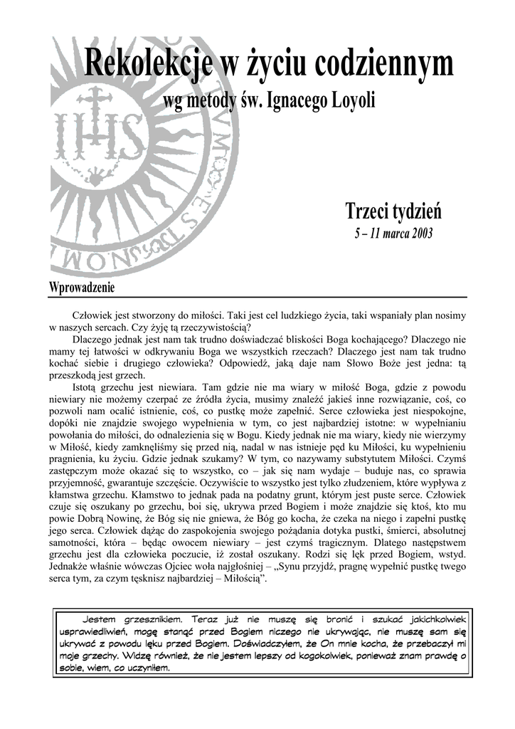 Rekolekcje w życiu codziennym wg metody św. Ignacego Loyoli Trzeci tydzień 5 – 11 marca 2003 Wprowadzenie Człowiek jest stworzony do miłości. Taki jest cel ludzkiego życia, taki wspaniały plan nosimy w naszych sercach. Czy żyję tą rzeczywistością? Dlaczego jednak jest nam tak trudno doświadczać bliskości Boga kochającego? Dlaczego nie mamy tej łatwości w odkrywaniu Boga we wszystkich rzeczach? Dlaczego jest nam tak trudno kochać siebie i drugiego człowieka? Odpowiedź, jaką daje nam Słowo Boże jest jedna: tą przeszkodą jest grzech. Istotą grzechu jest niewiara. Tam gdzie nie ma wiary w miłość Boga, gdzie z powodu niewiary nie możemy czerpać ze źródła życia, musimy znaleźć jakieś inne rozwiązanie, coś, co pozwoli nam ocalić istnienie, coś, co pustkę może zapełnić. Serce człowieka jest niespokojne, dopóki nie znajdzie swojego wypełnienia w tym, co jest najbardziej istotne: w wypełnianiu powołania do miłości, do odnalezienia się w Bogu. Kiedy jednak nie ma wiary, kiedy nie wierzymy w Miłość, kiedy zamknęliśmy się przed nią, nadal w nas istnieje pęd ku Miłości, ku wypełnieniu pragnienia, ku życiu. Gdzie jednak szukamy? W tym, co nazywamy substytutem Miłości. Czymś zastępczym może okazać się to wszystko, co – jak się nam wydaje – buduje nas, co sprawia przyjemność, gwarantuje szczęście. Oczywiście to wszystko jest tylko złudzeniem, które wypływa z kłamstwa grzechu. Kłamstwo to jednak pada na podatny grunt, którym jest puste serce. Człowiek czuje się oszukany po grzechu, boi się, ukrywa przed Bogiem i może znajdzie się ktoś, kto mu powie Dobrą Nowinę, że Bóg się nie gniewa, że Bóg go kocha, że czeka na niego i zapełni pustkę jego serca. Człowiek dążąc do zaspokojenia swojego pożądania dotyka pustki, śmierci, absolutnej samotności, która – będąc owocem niewiary – jest czymś tragicznym. Dlatego następstwem grzechu jest dla człowieka poczucie, iż został oszukany. Rodzi się lęk przed Bogiem, wstyd. Jednakże właśnie wówczas Ojciec woła najgłośniej – „Synu przyjdź, pragnę wypełnić pustkę twego serca tym, za czym tęsknisz najbardziej – Miłością”. Jestem grzesznikiem. Teraz już nie muszę się bronić i szukać jakichkolwiek usprawiedliwień, mogę stanąć przed Bogiem niczego nie ukrywając, nie muszę sam się ukrywać z powodu lęku przed Bogiem. Doświadczyłem, że On mnie kocha, kocha, że przebaczył mi moje grzechy. Widzę również, że nie jestem lepszy od kogokolwiek, ponieważ znam prawdę o sobie, wiem, co uczyniłem. Będziesz miłował Boga z całego serca (Pwt 6,4-9; ĆD 23) „Człowiek po to jest stworzony, aby Boga, Pana naszego, chwalił, czcił i jemu służył, a przez to zbawił duszę swoją” (ĆD 23). Obraz dla obecnej modlitwy: „Tutaj widzieć siebie, jak stoję przed obliczem Boga, Pana naszego, przed aniołami i świętymi, a oni wstawiają się za mną" (ĆD 232). Prośba o owoc modlitwy: Będziemy prosić o poznanie i wewnętrzne doświadczenie celu i sensu naszego życia. 1. Człowiek stworzony jest, aby... Człowiek jest jedynym bytem pośród innych stworzeń, który może i powinien uświadamiać sobie cel swojego życia. Tylko człowiek dostąpił przywileju świadomego przeżywania swojego istnienia i ukierunkowania ku tajemnicy, która mu została objawiona przez samego Boga. Świadomość celu życia sprawia, że wszystkie nasze czynności mają wymiar eschatologiczny, wszystko prowadzi do Źródła, z którego wyszliśmy i ku któremu zmierzamy - ku doskonałemu poznaniu Miłości, która nas powołała do życia i która ma być naszym wiecznym pokarmem. 2. Chwalić „Człowiek po to jest stworzony, aby Boga, Pana naszego chwalił”. Chwalić kogoś to znaczy najpierw być szczerym, nosić w sercu dobry obraz drugiej osoby, dobrze myśleć i wreszcie uzewnętrzniać to, co się nosi w sercu. Chwalić Boga to znaczy przyjąć i zaakceptować prawdę o Jego miłości i trosce w naszej historii. T zaufać Bożej mądrości, która ma lepszy plan dla naszego życia niż my sami. Wreszcie chwalić Boga, to opowiadać o Jego miłości. Chwalić Boga, znaczy miłować Go swoim umysłem, podporządkować umysł Bogu, czyli „ukrzyżować go”, poddając się posłuszeństwu Boga. Powołanie do chwalenia Boga, do miłowania Go całym umysłem najlepiej wypełnił Jezus. Umysł Jezusa był pełen zgody na pełnienie woli Ojca. Moim pokarmem jest wypełnić wolę Tego, który Mnie posłał....(J 4,34). Tylko w Jezusie Chrystusie jesteśmy zdolni kochać Ojca całym swoim umysłem, jesteśmy zdolni, by ukrzyżować umysł poddając się Jego woli. 3. Czcić Cześć oznacza szacunek, miłość, adorację. Czcić można kogoś bardzo ważnego i bardzo dobrego, kto zasługuje na akt prawdziwie religijny. W języku biblijnym cześć to miłowanie całym sercem. Serce jest szczególnym miejscem adoracji, kultu i szacunku, jaki komuś okazujemy. Nasze serce może jednak adorować różne rzeczy i różne wartości. Może uwikłać się w miłość do czegokolwiek, chociaż powołane jest do miłowania na pierwszym miejscu Boga. Dzieje się tak dlatego, że przez grzech człowiek oderwał się od Boga, zapomniał o Jego miłości. Człowiek szuka sobie teraz innych obiektów, które może czcić spodziewając się wzajemności. To wszystko czyni nie uświadamiając sobie, że ostatecznie szuka dla siebie pokarmu, którym jest miłość. Serce Jezusa było cudownym sanktuarium prawdziwego kultu Ojca. Jezus czcił Ojca, miłował Go i przez to otworzył nam drogę, byśmy razem z Nim mogli to samo uczynić. 4. Służyć Służba jest postawą Jezusa Chrystusa, który powiedział sam o sobie, iż: nie przyszedł, aby Mu służono, lecz aby służyć... (Mt 20,28). Jezus, uczynił się ostatnim, przyjąwszy postać sługi, ... stawszy się posłusznym aż do śmierci - i to śmierci krzyżowej (Flp 2,7n). Postawa służby j