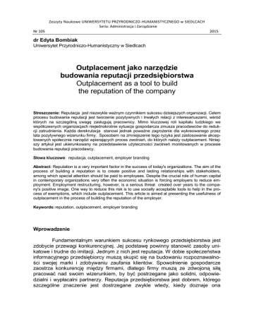 Zeszyty Naukowe UNIWERSYTETU PRZYRODNICZO-HUMANISTYCZNEGO w SIEDLCACH Seria: Administracja i Zarządzanie Nr 105 2015 dr Edyta Bombiak Uniwersytet Przyrodniczo-Humanistyczny w Siedlcach Outplacement jako narzędzie budowania reputacji przedsiębiorstwa Outplacement as a tool to build the reputation of the company Streszczenie: Reputacja jest niezwykle ważnym czynnikiem sukcesu dzisiejszych organizacji. Celem procesu budowania reputacji jest tworzenie pozytywnych i trwałych relacji z interesariuszami, wśród których na szczególną uwagę zasługują pracownicy. Mimo kluczowej roli kapitału ludzkiego we współczesnych organizacjach niejednokrotnie sytuacja gospodarcza zmusza pracodawców do redukcji zatrudnienia. Każda derekrutacja stanowi jednak poważne zagrożenie dla wykreowanego przez lata pozytywnego wizerunku firmy. Sposobem na zmniejszenie tego ryzyka jest zastosowanie akceptowanych społecznie narzędzi wpierających proces zwolnień, do których należy outplacement. Niniejszy artykuł jest ukierunkowany na przedstawienie użyteczności zwolnień monitowanych w procesie budowania reputacji pracodawcy. Słowa kluczowe: reputacja, outplacement, employer branding Abstract: Reputation is a very important factor in the success of today's organizations. The aim of the process of building a reputation is to create positive and lasting relationships with stakeholders, among which special attention should be paid to employees. Despite the crucial role of human capital in contemporary organizations very often the economic situation is forcing employers to reduce employment. Employment restructuring, however, is a serious threat created over years to the company's positive image. One way to reduce this risk is to use socially acceptable tools to help in the process of exemptions, which include outplacement. This article is aimed at presenting the usefulness of outplacement in the process of building the reputation of the employer. Keywords: reputation, outplacement, employer branding Wprowadzenie Fundamentalnym warunkiem sukcesu rynkowego przedsiębiorstwa jest zdobycie przewagi konkurencyjnej. Jej podstawę powinny stanowić zasoby unikatowe i trudne do imitacji. Jednym z nich jest reputacja. W dobie społeczeństwa informacyjnego przedsiębiorcy muszą skupić się na budowaniu rozpoznawalności swojej marki i zdobywaniu zaufania klientów. Spowolnienie gospodarcze zaostrza konkurencję między firmami, dlatego firmy muszą ze zdwojoną siłą pracować nad swoim wizerunkiem, by być postrzegane jako solidni, odpowiedzialni i wypłacalni partnerzy. Reputacja przedsiębiorstwa jest dobrem, którego szczególne znaczenie jest dostrzegane zwykle wtedy, kiedy doznaje ona 10 E. Bombiak uszczerbku. Podczas gdy dobra reputacja jest fundamentem, na którym budować możemy firmę, zła potrafi zrujnować najlepszy biznes. Korzystny wizerunek przedsiębiorstwa może zwiększać poziom zadowolenia i lojalności klientów, przyciągać inwestorów i przyszłych pracowników. Firmy posiadające wizerunek uczciwego pracodawcy mogą zatrudniać najbardziej utalentowane jednostki, mają niższą fluktuację, bardziej zaangażowany i usatysfakcjonowany zespół pracowników, a w konsekwencji większe zyski. Budowanie reputacji jest zatem niezwykle ważnym czynnikiem odniesienia sukcesu przez organizację. Mimo to sytuacja gospodarcza niejednokrotnie zmusza przedsiębiorcę do podejmowania negatywnej z punktu widzenia wizerunkowego decyzji o restrukturyzacji zatrudnienia. Do głównych przyczyn redukcji kadrowej zaliczyć należy: złą sytuację ekonomiczną przedsiębiorstwa, gdy redukcja zatrudnienia bywa często jedynym sposobem na uratowanie firmy przed bankructwem, wprowadzanie nowej technologii, do której potrzebni są wykwalifikowani pracownicy, czy spadek popytu na towary i usługi. Podjęcie takiej decyzji jest zadaniem trudnym. Każda redukcja personelu niesie za sobą problemy nie tylko dla zwalnianych pracowników, ale również dla pracodawcy. Wizerunek firmy na rynku pracy może ucierpieć, a zaufanie tych pracowników, którzy pozostali ulega osłabieniu. W takiej sytuacji konieczne staje się odpowiedzialne podejście do procesu derekrutacji. Stosowanie akceptowanych społecznie metod zwalniania personelu stanowi obecnie niezbędny warunek utrzymania pozytywnego wizerunku przedsiębiorstwa i budowania dobrej reputacji w otoczeniu. Jednym z instrumentów, po jakie można sięgnąć, jest outplacement, czyli program zwolnień monitorowanych. Rozstanie pracownika z pracodawcą rzadko bywa przyjemne, poczucie krzywdy byli pracownicy odreagowują przez długi czas, rozpowszechniając negatywne opinie o pracodawcy i zniechęcając jego potencjalnych kontrahentów. Outplacement, pozwala to zjawisko minimalizować. Jednak mimo jego oczywistego, pozytywnego oddziaływania na wizerunek przedsiębiorstwa, nadal nie jest on popularną praktyką. Dlatego też celem artykułu jest uświadomienie znaczenia tego narzędzia w budowaniu reputacji współczesnych organizacji. Reputacja – niewidzialny zasób przedsiębiorstwa W dobie turbulentnych zmian zachodzących w otoczeniu przedsiębiorstw coraz większą rolę w budowaniu ich przewagi konkurencyjnej odgrywają zasoby niematerialne. Jednym z nich jest reputacja. Reputacja stanowi jedno z cennych aktywów niematerialnych i istotny składnik kapitału intelektualnego. Kapitał intelektualny jest niewidzialnym majątkiem przedsiębiorstwa powstającym na bazie wiedzy i obejmującym wiele składników niematerialnych, które kształtują wartość rynkową przedsiębiorstwa. Jego najistotniejsze komponenty przedstawiono w tab.1. Wśród nich na szczególną uwagę zasługuje właśnie reputacja. Reputacja jest jednym z ważniejszych zasobów współczesnych organizacji. Można ją zdefiniować jako opierającą się na dotychczasowych działaniach firmy, podzielaną przez różne grupy interesariuszy, stabilną ocenę dotyczącą zdolności i go