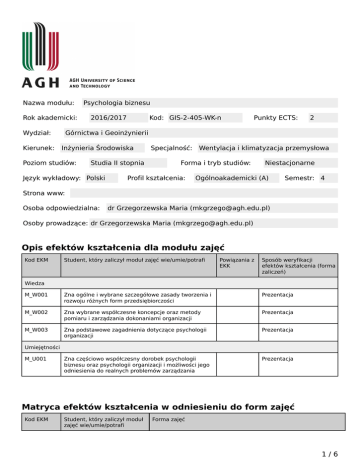 Nazwa modułu: Rok akademicki: Wydział: Kierunek: Psychologia biznesu 2016/2017 Kod: GIS-2-405-WK-n Punkty ECTS: 2 Górnictwa i Geoinżynierii Inżynieria Środowiska Poziom studiów: Studia II stopnia Język wykładowy: Polski Specjalność: Wentylacja i klimatyzacja przemysłowa Forma i tryb studiów: Profil kształcenia: Niestacjonarne Ogólnoakademicki (A) Semestr: 4 Strona www: Osoba odpowiedzialna: dr Grzegorzewska Maria ([email protected]) Osoby prowadzące: dr Grzegorzewska Maria ([email protected]) Opis efektów kształcenia dla modułu zajęć Kod EKM Student, który zaliczył moduł zajęć wie/umie/potrafi Powiązania z EKK Sposób weryfikacji efektów kształcenia (forma zaliczeń) Wiedza M_W001 Zna ogólne i wybrane szczegółowe zasady tworzenia i rozwoju różnych form przedsiębiorczości Prezentacja M_W002 Zna wybrane współczesne koncepcje oraz metody pomiaru i zarządzania dokonaniami organizacji Prezentacja M_W003 Zna podstawowe zagadnienia dotyczące psychologii organizacji Prezentacja Zna częściowo współczesny dorobek psychologii biznesu oraz psychologii organizacji i możliwości jego odniesienia do realnych problemów zarządzania Prezentacja Umiejętności M_U001 Matryca efektów kształcenia w odniesieniu do form zajęć Kod EKM Student, który zaliczył moduł zajęć wie/umie/potrafi Forma zajęć 1/6 Ćwiczenia laboratoryjne Ćwiczenia projektowe Konwersatori um Zajęcia seminaryjne Zajęcia praktyczne Zajęcia terenowe Zajęcia warsztatowe Zna ogólne i wybrane szczegółowe zasady tworzenia i rozwoju różnych form przedsiębiorczości + - - - - - - - - - - M_W002 Zna wybrane współczesne koncepcje oraz metody pomiaru i zarządzania dokonaniami organizacji + - - - - - - - - - - M_W003 Zna podstawowe zagadnienia dotyczące psychologii organizacji + - - - - - - - - - - Zna częściowo współczesny dorobek psychologii biznesu oraz psychologii organizacji i możliwości jego odniesienia do realnych problemów zarządzania + - - - - - - - - - - E-learning Ćwiczenia audytoryjne M_W001 Inne Wykład Karta modułu - Psychologia biznesu Wiedza Umiejętności M_U001 Treść modułu zajęć (program wykładów i pozostałych zajęć) Wykład Psychologia biznesu 1. Wprowadzenie do psychologii biznesu 2. Zarządzanie zasobami ludzkimi w organizacji (tworzenie kapitału ludzkiego) 3. Techniki komunikowania się w organizacji. Komunikacja werbalna i niewerbalna. Narzędzia komunikacji wewnętrznej i zewnętrznej 4. Psychologia stresu. Stres pracy i jego profilaktyka 5. Syndrom Wypalenia Zawodowego oraz jak mu zapobiegać Test „Czy jesteś już wypalony?(program interwencyjno – prewencyjny) 6. Przywództwo w organizacji Władza menedżerska i przywództwo 7. Komunikacja interpersonalna i kształtowanie wizerunku osobistego menadżera. 8. Konflikty i ich rozwiązywanie. Podstawy Negocjacji. Wybrane metody i techniki negocjacji. 9. Psychologia konsumenta i reklamy 10. Zarządzanie czasem w pracy 11. Metody i techniki pracy menedżera. Trening umiejętności menedżerskich 12. Zachowania organizacyjne – mierzenie motywacji osiągnięć – kwestionariusz, test ról zawodowych, zachowania patologiczne – mobbing w pracy, 13. Psychologiczne wyznaczniki sukcesu w zarządzaniu 14. Psychologiczny model efektywności pracy (badanie efektywności stylu kierowaniatest Reddina) 15. Coaching – a kierowanie zespołem w nowoczesnej firmie 2/6 Karta modułu - Psychologia biznesu Sposób obliczania oceny końcowej Aktywność na zajęciach, praca pisemna na zaliczenie Wymagania wstępne i dodatkowe nie ma wstępnych wymagań Zalecana literatura i pomoce naukowe Literatura obowiązkowa: R.W.Griffin „Podstawy zarządzania organizacjami” PWN Warszawa 2004 Literatura polecana: Z. Nęcki „Komunikacja międzyludzka” Antykwa, 2005. Bartkowiak G., Psychologia zarządzania, Poznań: Akademia Ekonomiczna, 1994. Armstrong M., Zarządzanie Zasobami Ludzkimi. Strategia i działanie, Kraków: Wydawnictwo Profesjonalnej Szkoły Biznesu, 2000. Dąbrowski P.J., Praktyczna teoria negocjacji, Sorbog, Warszawa 1990. De Bono E., Naucz się myśleć kreatywnie, PRIMA, Warszawa 1995. De Bono E., Sześć butów czyli sześć sposobów działania, Medium, Warszawa 1997. De Bono E., Sześć kapeluszy czyli sześć sposobów myślenia. Medium, Warszawa 1996. Dominian J., Autorytet, Inst. Wydaw. PAX, Warszawa 1988. Donaldson M.C., Donaldson M., Negocjacje, Wydawnictwo RM, Warszawa 1999. Filarski P., Trembowelska E.. Dogadajmy się. Ilustrowany poradnik negocjatora, Wyd. SYNERGIA, Gdańsk. FincherS.F., Kreatywna manda/a, RAVI, Łódź 1994. Fisher M., Sekret milionera, Medium, Warszawa 1991. Fisher R., Ury W., Patton B., Dochodzgc do tak. Negocjacje bez poddawania się, PWE, Warszawa 1995. Folta M., Communication Training: from a multi-disciplinary group to an interdisciplinary team, w: Komunikacja Społeczna w procesach transformacyjnych; Social Communication in the Transformation Process, OBP, Wrocław 1994. Folta M., Trening komunikacji; od multi-dyscyplinarnej grupy do interdyscyplinarnego zespołu, praca dyplomowa na Studium Pedagogiki Myślenia Twórczego, WSZPS, Warszawa 1991. Folta M., Zarys nowoczesnej teorii i praktyki negocjowania w: Humanizacja zespołów mieszkaniowych blokowisk, Habitat 93, Wyd. Politechniki Wrocławskiej, Wrocław 1994. Folta M., Kreatywne rozwijanie przedsiębiorczości indywidualnej i zespołowej, w: Habitat w regionie, Habitat &1. x27;96, Oficyna Wydawnicza Politechniki Wrocławskiej, Wrocław 1998. Folta M. Prognozowanie naukowo techniczne i gospodarczo-społeczne z wykorzystaniem teorii potrzeb i heurystyki, w: Potrzeby, Twórczość, Przyszłość; Wyd. Politechniki Wrocławskiej, Wrocław 1991. Fowler A., Jak skutecznie negocjować, Petit, Warszawa 1997. Gheorghlu V.A., Sugestia, Wiedza Powszechna, Warszawa 1987. Goleman D., Inteligencja emocjonalna, Sukces w życiu zależy nie tylko od intelektu lecz od umiejętności kierowania emocjami, Media Rodzina 