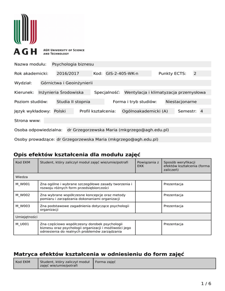 Opis efektów kształcenia dla modułu zajęć Matryca