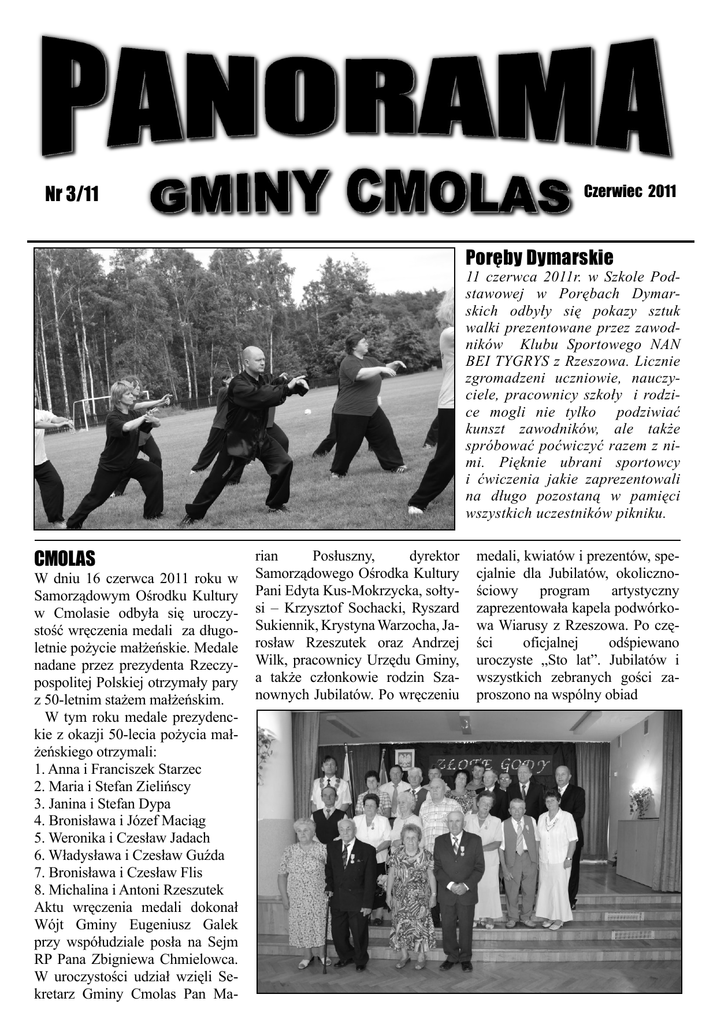 Nr 3/11 Czerwiec 2011 Poręby Dymarskie 11 czerwca 2011r. w Szkole Pod stawowej w Porębach Dymar skich odbyły się pokazy sztuk walki prezentowane przez zawod ników Klubu Sportowego NAN BEI TYGRYS z Rzeszowa. Licznie zgromadzeni uczniowie, nauczy ciele, pracownicy szkoły i rodzi ce mogli nie tylko podziwiać kunszt zawodników, ale także spróbować poćwiczyć razem z ni mi. Pięknie ubrani sportowcy i ćwiczenia jakie zaprezentowali na długo pozostaną w pamięci wszystkich uczestników pikniku. CMOLAS W dniu 16 czerwca 2011 roku w Samorządowym Ośrodku Kultury w Cmolasie odbyła się uroczy stość wręczenia medali za długo letnie pożycie małżeńskie. Medale nadane przez prezydenta Rzeczy pospolitej Polskiej otrzymały pary z 50letnim stażem małżeńskim. W tym roku medale prezydenc kie z okazji 50lecia pożycia mał żeńskiego otrzymali: 1. Anna i Franciszek Starzec 2. Maria i Stefan Zielińscy 3. Janina i Stefan Dypa 4. Bronisława i Józef Maciąg 5. Weronika i Czesław Jadach 6. Władysława i Czesław Guźda 7. Bronisława i Czesław Flis 8. Michalina i Antoni Rzeszutek Aktu wręczenia medali dokonał Wójt Gminy Eugeniusz Galek przy współudziale posła na Sejm RP Pana Zbigniewa Chmielowca. W uroczystości udział wzięli Se kretarz Gminy Cmolas Pan Ma rian Posłuszny, dyrektor Samorządowego Ośrodka Kultury Pani Edyta KusMokrzycka, sołty si – Krzysztof Sochacki, Ryszard Sukiennik, Krystyna Warzocha, Ja rosław Rzeszutek oraz Andrzej Wilk, pracownicy Urzędu Gminy, a także członkowie rodzin Sza nownych Jubilatów. Po wręczeniu medali, kwiatów i prezentów, spe cjalnie dla Jubilatów, okoliczno ściowy program artystyczny zaprezentowała kapela podwórko wa Wiarusy z Rzeszowa. Po czę ści oficjalnej odśpiewano uroczyste „Sto lat”. Jubilatów i wszystkich zebranych gości za proszono na wspólny obiad OSTROWY BARANOWSKIE W Ostrowach Baranow skich 5 czerwca 2011r. odby ły się zawody sportowo pożarnicze. Zmierzyły się ze sobą wszystkie jednostki Ochotniczych Straży Pożar nych działających w gminie Cmolas. Ponadto poza konkursem wystąpiła także druga drużyna OSP Cmolas. Strażakom, którzy tak licznie stawi li się w niedzielne popołudnie po goda dopisała. Zmagano się w dwóch konkurencjach: sztafety oraz bojówki. Po zakończonej ry walizacji klasyfikacja wyglądała na stępująco: I miejsce OSP Cmolas II miejsce OSP Trzęsówka III miejsce OSP Jagodnik IV miejsce OSP Ostrowy Bara nowskie V miejsce OSP Ostrowy Tuszow skie VI miejsce OSP Poręby Dymar skie VII miejsce OSP Hadykówka druga drużyna OSP Cmolas zakoń czyła konkurencje z wynikiem, któ ry klasyfikowałby jednostkę w zawodach na 2 miejscu. Podczas niedzielnej imprezy straża kom z gminy Cmolas uroczyście nadano odznaczenia: Złote Medale Za Zasługi dla Pożar nictwa otrzymali: Zygmunt Bańka z Trzęsówki, Kazi mierz Rzeszutek z Ostów Baranow skich, Wiesław Łagoda z Porąb Dymarskich, Eugeniusz Zuba z Cmolasu. Srebrne Medale Za Zasługi dla Po żarnictwa otrzymali: Janusz Lubera z Jagodnika, Włady sław Czajkowski z Ostrów Bara nowskich, Adam Kozioł z Trzęsówki, Aleksander Czachor z Ostrów Tuszowskich, Władysław Zagroba z Cmolasu. Brązowe Medale Za Zasługi dla Po żarnictwa otrzymali: Paweł Rząsa z Hadykówki, Jaro sław Rzeszutek z Ostrów Tuszow skich, Maciej Bańka z Cmolasu, Paweł Skowroński z Cmolasu, Ma riusz Łącz z Trzęsówki, Michał Halat z Ostrów Baranowskich. Odznaki Strażak Wzorowy otrzy mali: Mateusz Pastuła z Cmolasu, Bar tłomiej Skowron z Cmolasu, Artur Mazur z Cmolasu, Sławomir Mi cek z Porąb Dymarskich, Łukasz Kozioł z Trzęsówki, Piotr Trojnac ki z Ostrów Tuszowskich, Krzysz tof Rzeszutek z Ostrów Tuszowskich, Krzysztof Maciąg z Hadykówki Zaobserwować można coraz więk sze zainteresowanie służbą wśród młodych mieszkańców gminy Cmolas. Młodzi ochotnicy zasilają szeregi OSP, co pozwala na konty nuację pracy druhów, którzy ze względu na wiek nie mogą uczest niczyć w akcjach bojowych. Przy pomnijmy, że w takich akcjach mogą brać udział strażacy, którzy ukończyli 18 lat, a służbę swą koń czą w wieku 60 lat. Poprawia się też sytuacja od strony wyposażenia jednostek. Działalność jednostek OSP na terenie gminy, mimo pod stawowej działalności jaką jest nie sienie obywatelom pomocy wykracza poza standardowe ramy. Druhowie organizują się przy róż nego typu przedsięwzięciach wspierając lokalne społeczeństwo. TRZĘSÓWKA Już po raz piaty w Trzę sówce odbył się Festyn Ro dzinny. 12. czerwca 2011r. bogaty program artystycz ny imprezy przyciągnął pu bliczność w różnym wieku od najmłodszych po star sze pokolenie. Co roku na Festyn licznie przyby wają nie tylko sami mieszkańcy wsi, ale również mieszkańcy są siednich miejscowości. Organiza torzy przygotowali loterię fantową, której nagrodą główną był tradycyjnie rower. Oprócz atrakcji dla dzieci w postaci zjeż dżalni i trampoliny była zabawa taneczna, smakołyki i grill. Na de skach sceny przed zgromadzona publicznością wystąpili ucznio wie z Zespołu Szkół w Trzęsów ce: Zespół „Just Dance”, Zespoł „Magikal Dance” oraz Maciej Ga cek. Zespoły taneczne z Samorzą dowego Ośrodka Kultury w Cmolasie: Motyw I, Motyw II za prezentowały się w tańcu współ czesnym, natomiast tancerze z CMOLAS “Na pociechę Tobie wyróść obiecuję i życzenia składam tak jak serce czuje.” 25 mają 2011r. w Samorządowym Ośrodku Kultury w Cmolasie sala wypełniła się do ostatniego miej sca. Dzieci przed występami zaglą dały przez uchyloną kotarę wypatrując tej jednej, jedynej... swojej mamy... To dla wszystkich mam w tym dniu wystawiono sta rannie przygotowany repertuar. Oklaski i wzruszenie w oczach każdej mamy były najlepszym po dziękowaniem za wiersze i piosenki. Program został przygo towany przez uczniów Szkoły Pod stawowej im. prof. Jana Czekanowskiego , uczniów Gimna grup: Dance Passi