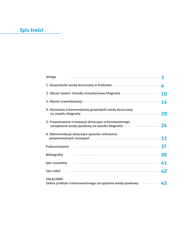 Spis treści Wstęp 3 1. Gospodarka wodą deszczową w Krakowie 4 2. Obszar badań: Osiedle mieszkaniowe Magnolia 10 3. Wyniki inwentaryzacji 14 4. Wyzwania zrównoważonej gospodarki wodą deszczową na osiedlu Magnolia 20 5. Proponowane innowacje dotyczące zrównoważonego zarządzania wodą opadową na osiedlu Magnolia 24 6. Rekomendacje dotyczące sposobu wdrażania proponowanych rozwiązań 31 Podsumowanie 37 Bibliografia 39 Spis rysunków 41 Spis tabel 42 ZAŁĄCZNIK: Dobre praktyki zrównoważonego zarządzania wodą opadową 43 Detail of the Magnolia neighbourhood 2 XVII Akademia letnia Wyzwania zrównoważonego rozwoju Krakow, 2014 1. Wstęp Niniejszy raport został opracowany przez uczestników Akademii Letniej Fundacji Sendzimira. Podejmuje on tematykę zarządzania wodą deszczową na osiedlu mieszkaniowym Magnolia w Krakowie. Kraków położony jest w dolinie Wisły, co wiąże się z wyższym zagrożeniem powodziowym oraz większą wrażliwością miasta na zmiany klimatu. Głównym celem projektu było opracowanie rozwiązań z zakresu zarządzania wodą deszczową w mieście. W raporcie wykorzystano dane, które pozyskano podczas spotkań z interesariuszami, badań terenowych oraz wywiadów z lokalną społecznością. Analizę sporządzono dla osiedla Magnolia, ale proponowane rozwiązania mogą zostać wykorzystane także w innych częściach Krakowa. Rozdział pierwszy zawiera opis obecnego stanu gospodarki wodą deszczową w Krakowie i ma na celu przybliżenie problematyki omawianej w dalszej części raportu. W rozdziale wymieniono strategie oraz dokumenty, które regulują gospodarkę wodą deszczową na poziomie lokalnym i regionalnym, a także źródła finansowania polityk z tego zakresu. Przedstawione zostały również technologie i rozwiązania, które są wykorzystywane w Krakowie. Rozdział drugi zawiera charakterystykę osiedla Magnolia, ze szczególnym uwzględnieniem informacji na temat położenia geograficznego, infrastruktury oraz struktury społeczności lokalnej. W rozdziale tym wykorzystano mapy. Rozdział trzeci zwiera wyniki badań terenowych, które miały na celu inwentaryzację obecnych rozwiązań oraz tych, które mogą zostać wdrożone w przyszłości. Inwentaryzacja składała się z dwóch części - pierwsza miała na celu zidentyfikowanie istniejącej infrastruktury zarządzania wodą opadową na osiedlu Magnolia; druga polegała na zlokalizowaniu potencjalnych obszarów implementacji nowych zrównoważonych rozwiązań. Wyzwania z zakresu zrównoważonego gospodarowania wodą deszczową na osiedlu Magnolia zostały opisane w rozdziale czwartym. W pracach nad tym rozdziałem wykorzystano metodę ISIS, która została opracowana przez ekspertów i doradców międzynarodowej sieci AtKisson Group. Wyzwania jakie stoją przed osiedlem można pogrupować na trzy główne kategorie – środowiskowe, ekonomiczne oraz społeczne. Niektóre z nich są charakterystyczne dla całego obszaru, pozostałe występują tylko w części. W rozdziale tym zaprezentowano szereg wyzwań, które powinny zostać uwzględnione podczas opracowywania strategii rozwoju gospodarki wodą deszczową. W rozdziale piątym zaprezentowano innowacyjne rozwiązania, które mogą być zastosowane na osiedlu Magnolia. Rozdział szósty zawiera rekomendacje z zakresu wdrażania tych innowacji. Dobre praktyki z zakresu zrównoważonego zarządzania wodami opadowymi w mieście zostały umieszczone w Aneksie. Zaprezentowane przykłady pochodzą z miast Europejskich, które borykają się z podobnymi problemami do Krakowa. XVII Akademia letnia Wyzwania zrównoważonego rozwoju Krakow, 2014 3 1. Gospodarka wodą deszczową w Krakowie Rysunek 1.1 Wody powierzchniowe w Krakowie © Municipality of Krakow Ten rozdział zawiera opis obecnego stanu gospodarki wodą deszczową w Krakowie podzielony na pięć części: ogólne informacje, gospodarka wodą deszczową, ramy finansowe, technologie oraz partycypacja i edukacja. 1.1. Ogólne informacje Kraków jest drugim co do wielkości miastem w Polsce. Jest położony w południowej części Polski w województwie małopolskim, w dolinie wyżyny Krakowsko-Częstochowskiej, 219 metrów nad poziomem morza. Populacja miasta liczy niemal jeden milion mieszkańców. Centrum miasta jest położone na lewym brzegu Wisły. Ze względu na bliskość gór i specyficzne położenie, ilość opadów i wielkość odpływu w Krakowie są wyższe od przeciętnych współczynników w Polsce. 4 XVII Akademia letnia Wyzwania zrównoważonego rozwoju Krakow, 2014 1.2. Regulacja wody deszczowej POZIOM LOKALNY Na lokalnym poziomie woda deszczowa w Krakowie jest regulowana trzema środkami. (1) Program Ochrony Środowiska dla miasta Krakowa na lata 2012–2015 z uwzględnieniem zadań zrealizowanych w 2011 roku oraz perspektywą na lata 2016– 2019. Program ten został uchwalony w celu realizowana Narodowe Polityki Ekologicznej na poziomie miasta Kraków. Jest on ukierunkowany na rozwiązywanie problemów z zakresu ochrony środowiska, w tym zagospodarowywanie wody deszczowej i ograniczanie ryzyka powodzi. (2) Krakowski program małej retencji wód opadowych Jest to strategiczny dokument uchwalony w 2013 roku. Zapewnia on rozwiązania prawne i finansowe powiązane z gospodarką wodą deszczową w mieście. Program ma dwa główne cele: ● ochrona zasobów wody poprzez retencję wody deszczowej i użycie jej w miejscu opadu; ● zmniejszenie odpływu wody deszczowej. (3) Plany zagospodarowania przestrzennego uchwalane przez Biuro Planowania Przestrzennego Urzędu Miasta Krakowa. Biuro Planowania Przestrzennego przyczynia się do poprawy gospodarki wodą deszczową w Krakowie na trzy sposoby: ● ustalanie wytycznych dla inwestorów; ● zarządzanie zbiornikami retencyjnymi; ● zapobieganie powstawaniu budynków w miejscach podatnych na podtopienia. POZIOM REGIONALNY Na poziomie regionalnym Małopolski Urząd Wojewódzki, jako jeden z pierwszych w Polsce, 