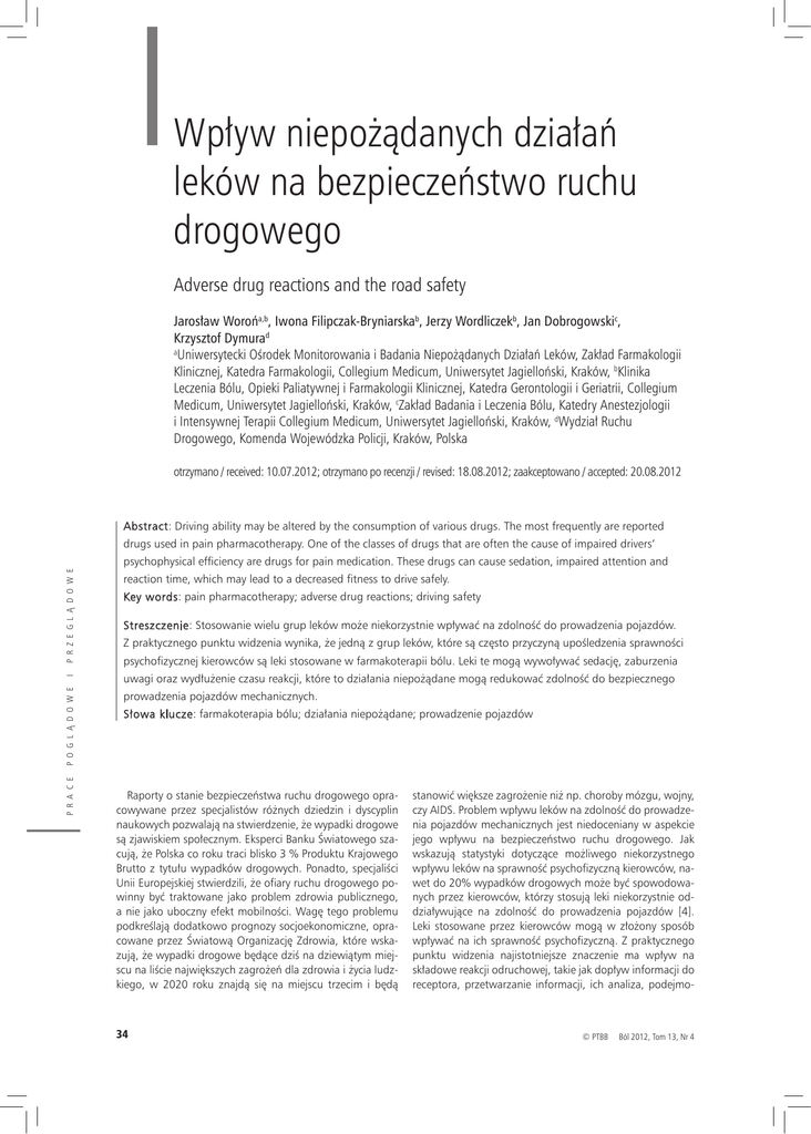 Wpływ niepożądanych działań leków na bezpieczeństwo ruchu drogowego Adverse drug reactions and the road safety Jarosław Worońa,b, Iwona Filipczak-Bryniarskab, Jerzy Wordliczekb, Jan Dobrogowskic, Krzysztof Dymurad a Uniwersytecki Ośrodek Monitorowania i Badania Niepożądanych Działań Leków, Zakład Farmakologii Klinicznej, Katedra Farmakologii, Collegium Medicum, Uniwersytet Jagielloński, Kraków, bKlinika Leczenia Bólu, Opieki Paliatywnej i Farmakologii Klinicznej, Katedra Gerontologii i Geriatrii, Collegium Medicum, Uniwersytet Jagielloński, Kraków, cZakład Badania i Leczenia Bólu, Katedry Anestezjologii i Intensywnej Terapii Collegium Medicum, Uniwersytet Jagielloński, Kraków, dWydział Ruchu Drogowego, Komenda Wojewódzka Policji, Kraków, Polska otrzymano / received: 10.07.2012; otrzymano po recenzji / revised: 18.08.2012; zaakceptowano / accepted: 20.08.2012 Abstract: Driving ability may be altered by the consumption of various drugs. The most frequently are reported drugs used in pain pharmacotherapy. One of the classes of drugs that are often the cause of impaired drivers’ pr z eg l ą d o w e i uwagi oraz wydłużenie czasu reakcji, które to działania niepożądane mogą redukować zdolność do bezpiecznego prowadzenia pojazdów mechanicznych. pr a ce reaction time, which may lead to a decreased fitness to drive safely. p o g l ą d o w e psychophysical efficiency are drugs for pain medication. These drugs can cause sedation, impaired attention and Key words: pain pharmacotherapy; adverse drug reactions; driving safety Streszczenie: Stosowanie wielu grup leków może niekorzystnie wpływać na zdolność do prowadzenia pojazdów. Z praktycznego punktu widzenia wynika, że jedną z grup leków, które są często przyczyną upośledzenia sprawności psychofizycznej kierowców są leki stosowane w farmakoterapii bólu. Leki te mogą wywoływać sedację, zaburzenia Słowa klucze: farmakoterapia bólu; działania niepożądane; prowadzenie pojazdów Raporty o stanie bezpieczeństwa ruchu drogowego opracowywane przez specjalistów różnych dziedzin i dyscyplin naukowych pozwalają na stwierdzenie, że wypadki drogowe są zjawiskiem społecznym. Eksperci Banku Światowego szacują, że Polska co roku traci blisko 3 % Produktu Krajowego Brutto z tytułu wypadków drogowych. Ponadto, specjaliści Unii Europejskiej stwierdzili, że ofiary ruchu drogowego powinny być traktowane jako problem zdrowia publicznego, a nie jako uboczny efekt mobilności. Wagę tego problemu podkreślają dodatkowo prognozy socjoekonomiczne, opracowane przez Światową Organizację Zdrowia, które wskazują, że wypadki drogowe będące dziś na dziewiątym miejscu na liście największych zagrożeń dla zdrowia i życia ludzkiego, w 2020 roku znajdą się na miejscu trzecim i będą 34 stanowić większe zagrożenie niż np. choroby mózgu, wojny, czy AIDS. Problem wpływu leków na zdolność do prowadzenia pojazdów mechanicznych jest niedoceniany w aspekcie jego wpływu na bezpieczeństwo ruchu drogowego. Jak wskazują statystyki dotyczące możliwego niekorzystnego wpływu leków na sprawność psychofizyczną kierowców, nawet do 20% wypadków drogowych może być spowodowanych przez kierowców, którzy stosują leki niekorzystnie oddziaływujące na zdolność do prowadzenia pojazdów [4]. Leki stosowane przez kierowców mogą w złożony sposób wpływać na ich sprawność psychofizyczną. Z praktycznego punktu widzenia najistotniejsze znaczenie ma wpływ na składowe reakcji odruchowej, takie jak dopływ informacji do receptora, przetwarzanie informacji, ich analiza, podejmo- © PTBB Ból 2012, Tom 13, Nr 4