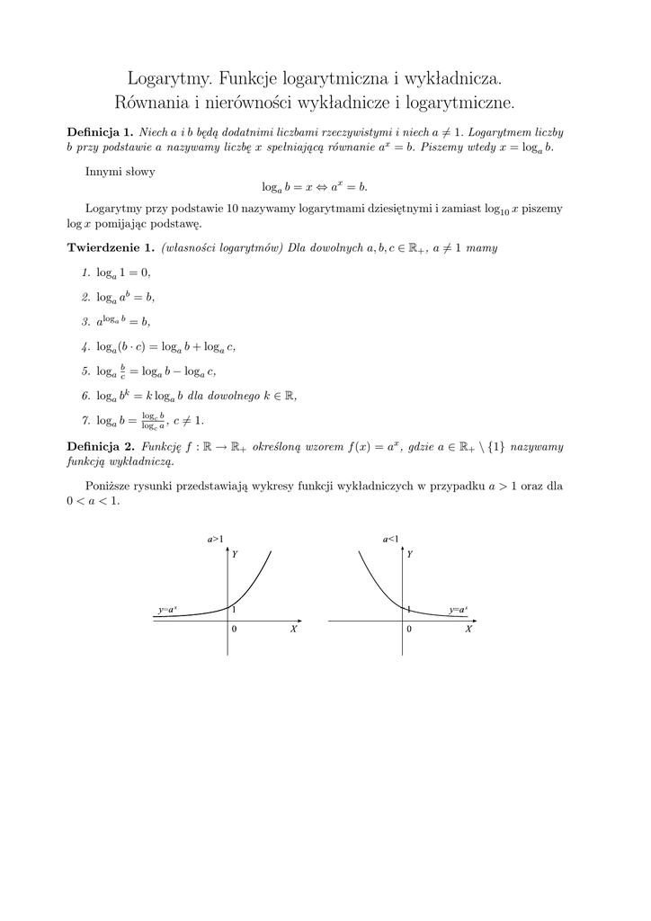 Podobne własności ma funkcja logarytmiczna, tzn. jeśli loga x1 = loga x2 , to x1 = x2 . Ponadto jeśli a > 1, to funkcja f (x) = loga x jest rosnąca, a dla 0 < a < 1 jest malejąca.