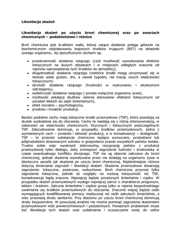 Likwidacja skażeń Likwidacja skażeń po użyciu broni chemicznych – podobieństwo i różnice chemicznej oraz po awariach Broń chemiczna jest środkiem walki, której rażące działanie polega głównie na biochemicznym oddziaływaniu bojowych środków trujących (BST) na składniki żywego organizmu. Jej specyficznymi cechami są: przestrzenność działania rażącego (czyli możliwość wywoływania efektów toksycznych na dużych obszarach i w miejscach odległych znacznie od rejonów wprowadzenia tych środków do atmosfery), długotrwałość działania rażącego (niektóre środki mogą utrzymywać się w terenie wiele godzin, dni, a nawet tygodni, nie tracąc swych właściwości toksycznych) skrytość działania rażącego (trudności w wykrywaniu i skutecznym ostrzeganiu), wybiórczość działania rażącego ( poraża wyłącznie organizmy żywe), możliwość eskalacji skutków rażenia sterowanie efektami toksycznymi od porażeń lekkich do zejść śmiertelnych), efekt moralno – psychologiczny, prostota i trwałość produkcji. Bardzo podobne cechy mają toksyczne środki przemysłowe (TSP), które powstają na skutek wydostania się do otoczenia. Cechy te nasilają się z różną intensywnością, w zależności od właściwości chemicznych, fizycznych i toksycznych poszczególnych TSP. Zdecydowanie dominuje, w przypadku środków przemysłowych, jedna z wymienionych cech – prostota i łatwość produkcji, a w konsekwencji – dostępność. TSP – to przecież substancje chemiczne będące surowcami, produktami lub półproduktami stosowanymi szeroko w gospodarce prawie wszystkich państw świata. Trudno sobie więc wyobrazić dobrowolną rezygnację państw z produkcji przemysłowej tylko dlatego, żeby zmniejszyć zagrożenie ludności i środowiska w czasie ewentualnego konfliktu zbrojnego. TSP nie są obecnie zaliczane do broni chemicznej, jednak skażenia wywoływane przez nie działają na organizmy żywe w identyczny sposób jak skażenia po użyciu broni chemicznej. Najistotniejsze różnice dotyczą stwarzania zagrożeń i likwidacji skażeń. Skażenia przemysłowe stwarzają zagrożenia: toksyczne, pożarowe, wybuchowe. Broń chemiczna przynosi tylko zagrożenia toksyczne, jednak ze względu na wyższą toksyczność niż TSP, konsekwencje będą znaczne. Najwięcej będzie porażonych śmiertelnie i ciężko. W przypadku skażeń przemysłowych wystąpi najwięcej zatruć o charakterze progowym, lekkim i średnim. Zatrucia śmiertelne i ciężkie grożą tylko w rejonie bezpośredniego uwalniania się środków przemysłowych do otoczenia. Znacznie więcej będzie osób wymagających kwalifikowanej pomocy medycznej niż osób zatrutych śmiertelnie, a wiec przeważą straty sanitarne. Przy skażeniu po użyciu broni chemicznej dominują straty bezpowrotne. W powyższej analizie nie można pominąć zagrożenia skażeniami przemysłowymi wód powierzchniowych i podziemnych. Poważnym problemem może być likwidacja tych skażeń oraz uzdatnianie i oczyszczanie wody do celów komunalnych i gospodarczych. Pod względem budowy chemicznej trwałe BST można zaliczyć, umownie, do dwóch grup związków organicznych, a mianowicie halogenków alkilowych i chlorowcobezwodników kwasów. Natomiast TSP są związkami bardzo różnorodnymi, zarówno organicznymi jak i nieorganicznymi, o bardzo różnorodnej budowie chemicznej, różnych właściwościach fizycznych, chemicznych i różnej toksyczności, różnej skłonności do tworzenia mieszanin wybuchowych i różnej palności. Odkażanie terenu Odkażanie terenu skażonego BST można prowadzić metodami: chemicznymi, fizykochemicznymi i mechanicznymi. Metoda chemiczna polega na polewaniu skażonych miejsc roztworem (zawiesiną) odkażającym lub rozsypywaniu odkażalnika. Do polewania stosuje się najczęściej zawiesinę wodną podchlorynu wapniowego o różnym stężeniu, w zależności od rodzaju środka trującego. Rozsypywanie odkażalnika – najczęściej wapna chlorowanego lub podchlorynu wapniowego – stosuje się do odkażania silnie skażonych obiektów lub odcinków terenu. W metodach fizykochemicznych środek trujący odparowuje się strumieniem gorących gazów lub zmywa z utwardzonego podłoża. Tak odkaża się pasy startowe lotnisk, drogi o podłożu litym nie nasiąkliwym. Mechaniczna metoda polega na zgarnianiu skażonej warstwy gleby lub śniegu lub nasypywaniu nieskażonej gleby w celu wykonania przejść w terenie skażonym. Odkażanie terenu skażonego TSP nie będzie, z powodu różnorodności ich własności fizycznych i chemicznych, przedsięwzięciem prostym. Skażać teren mogą różne związki, z którymi trzeba będzie postępować w różny sposób (np. wypalać, neutralizować innymi związkami chemicznymi, przesypywać albo zrywać bądź ścinać kilku – lub kilkunastocentymetrową warstwę, zbierać jako odpady przemysłowe i składać w przygotowanych miejscach). Nie można także wykluczyć rekultywacji skażonego terenu. W pewnych przypadkach, ze względu na zagrożenie pożarowe i skłonność par TSP do tworzenia mieszanin wybuchowych z powietrzem, niemożliwe będzie pokonywanie terenu skażonego, zarówno pieszo jak i na pojazdach mechanicznych. Odkażanie odzieży Przeprowadzone w odpowiednim czasie odkażanie odzieży i indywidualnych środków ochrony przed skażeniami zmniejsza lub wyklucza możliwość porażenia ludzi. Skażenia przemysłowe mogą mieć postać kropel, par lub cząstek ciała stałego. Największe znaczenie będą miały porażenia parami i kroplami. Do usuwania TSP przydatne będą tylko niektóre z metod odkażania, a mianowicie: odkażania przez pranie ekstrakcyjne w roztworach wodnych, odkażanie przez ekstrakcję z użyciem rozpuszczalników organicznych, wietrzenie i trzepanie. Stosowanie odpowiedniej metody zależy od właściwości fizyczno – chemicznych skażającej substancji i rodzajów ubiorów. Zabiegi sanitarne Zabie